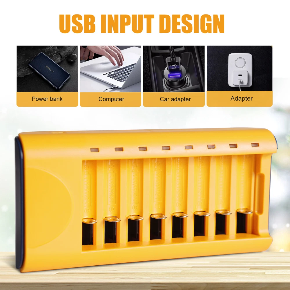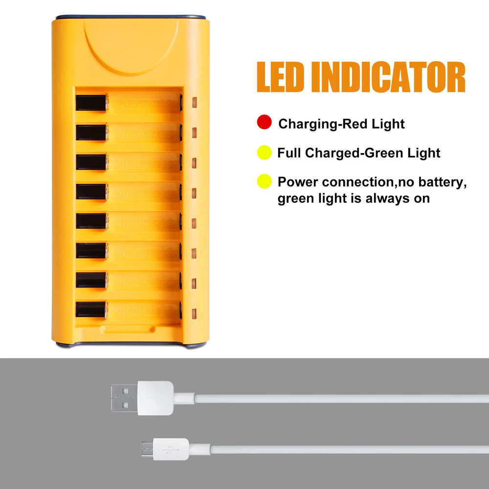 Smart AA/AAA Rechargeable Battery Charger 8 Slot for Ni-MH/Ni-CD 1.2V Batteries Features: 1. 【Smart Rechargeable AA Battery Charger】 AA AAA battery charger 8 bay for Ni-MH Ni-CD rechargeable batteries can charge any quantity in any slot. Single, double or triple ones can be charged, and not necessary to put them in neighboring slots. Besides, you can also mix charge AA and AAA batteries, as long as they are Ni-MH or Ni-CD batteries. 2.【Safety Protection】 Comes with special charge and discharge management circuit. With multiple security protection settings, battery charger aa can effectively prevent reverse, short circuit, overcharge, over discharge, over-current damage to the battery, which makes users using the product without any safety concern. 3.【LED Indicators Charging Display】 This aa aaa battery charger with Red/Green led light display, And the aa rechargeable battery charger will display the status of each rechargeable battery when you insert a battery to charge, the light will turn solid red, only on the port(s) containing the battery, to indicate the battery is charging. The light turns solid green when charging is complete. 4.【USB AA Battery Charger】 USB Powered Universal Intelligent Battery Charger, allows for on the go worldwide portability.the USB charging line can be connected to USB socket, car charger, computer, phone adapter, other USB output equipment to charge. 5. Note: Products with electrical plugs are designed for use in the US. Outlets and voltage differ internationally and this product may require an adapter or converter for use in your destination. Please check compatibility before purchasing. Specification: 1. LED state the charging statues: Power connection, no battery, Green light is always on. Charging - Red light Full charged- Green light 2. Compatible: Can both charge AA and AAA Ni-MH Ni-Cd rechargeable batteries (Do not charge alkaline or Lithium batteries) 3. Input and Output: Input: DC 5V 1A, Worldwide voltage Output: DC 1.2V 200mA, faster for charging 4. Individual fast-charging,LED indicator light, Easy to use AA/AAA/ Ni-MH Ni-CD rechargeable batteries,Perfect Fit 6. Can charge any number of batteries at the same time, independent charging channels 7. Safety Charging, Offer over-voltage over-current protection, short-circuit protection, over-charge protection, over-heat protection, Good Protection Package Included 1 x AA Battery Charger 8 Slot 1 x USB Cable On Feb 2, 2025 at 23:42:20 PST, seller added the following information: