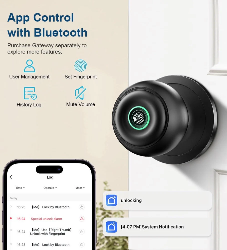 [Secure Your Home with Smart Door Lock] Our fingerprint door lock offers easy unlocking options using your unique fingerprint or APP to your home. This smart door Knob provides the option of using mechanical keys for entry, offering added peace of mind in case of emergencies. [4-In- 1 Keyless Entry Door Lock for Bedroom] The smart lock for bedroom offers various operating modes to suit your needs. Switch the thumbprint door knob’s convenience of Passage Mode, the standard operation of Normal Mode(5s auto lock), the fingerprint door knob’s privacy of Privacy Mode, or the quietness of Silent Mode, you can easily customize the lock settings by rotating the thumb turn to match your smart home lifestyle. [Convenient App Control of finger print door knobs] Easily set fingerprints, check access records and share or add access with family members in the APP. App Control should within Bluetooth Range. If you want remote control of the smart door lock, you need to purchase a gateway separately. [Worry-Free Smart Door knob] The smart lock for bedroom doors adds an extra layer of to your home. Whether you're looking for a door knob with lock for your apartment or a smart home device to keep your home secure, our fingerprint door lock has what you need. The fingerprint door lock bulit in a rechargeable battery with a 1-year battery life that can be charged by USB Type-C power supply. [Easy to Install & Last to use] Featuring easy installation, this smart door lock is also a reliable choice not only for homes but also for AirBnB, or apartments. The fingerprint lock installs easily with a screwdriver, and the biometric door lock is ideal for anyone who desires privacy. Tips: When install interior knob, both Exterior and Interior Knobs have to be inserted according to the 'UP' sign on the top so that they can stay in place. And the spindle bar is in the vertical position. The thumb turn adjustment arrow points to the center dot and the 'UP' sign, then the arrow is inserted upward on the mounting, you can use a little force to get the rear lock completely in.