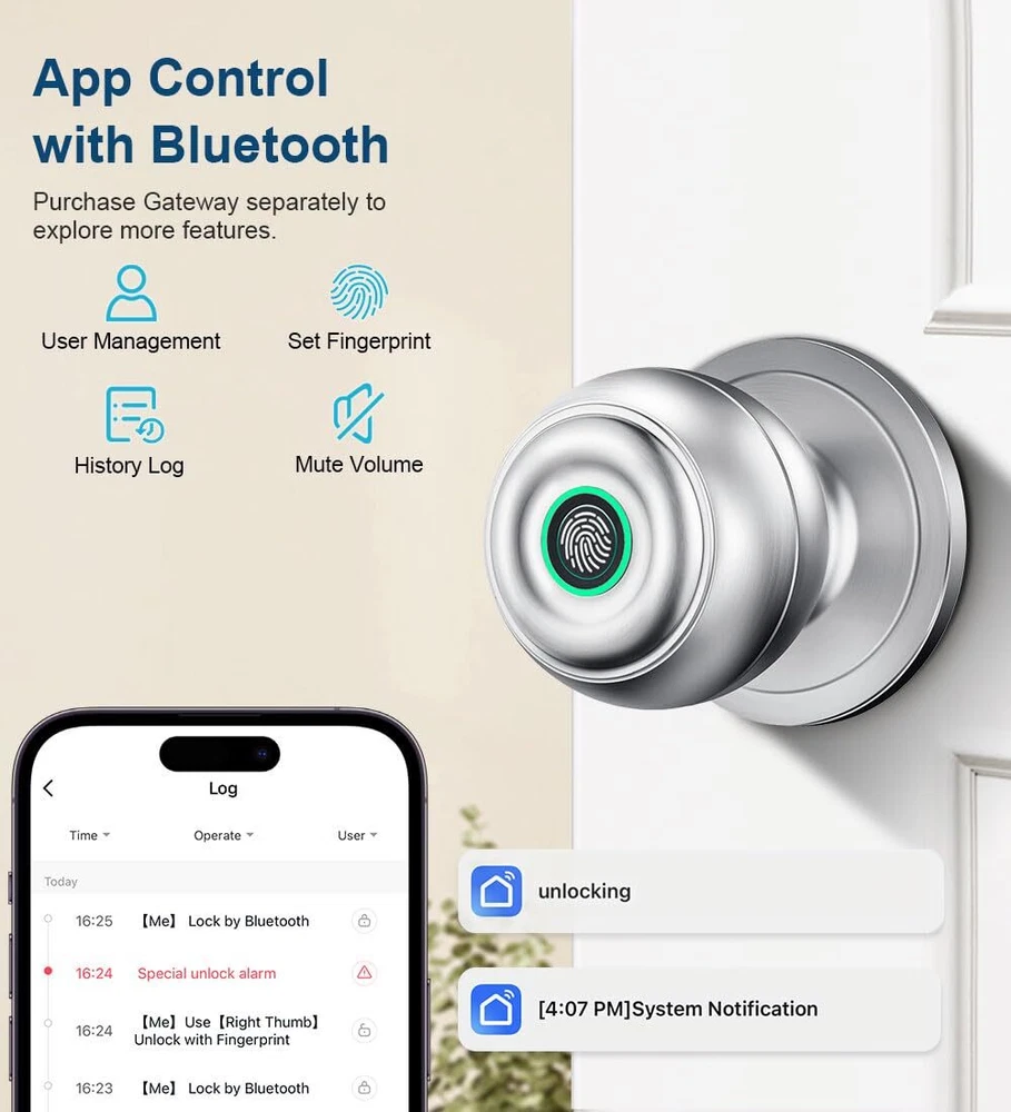 Fingerprint Door Lock, Smart Fingerprint Door Knob with Lock, Biometric Door Lock with App Control & Key, Keyless Thumbprint Entry Door Lock for Bedroom, Front Door, Home, Apartment-Dark Black 3-IN-1 BIOMETRIC DOOR KNOB: The ultimate security solution for your smart home or office. Whether you prefer the convenience of a thumbprint door knob, the security of App control, or the reliability of traditional keys, the smart door knob meets your need. Great fingerprint door lock for bedroom, living room, apartment etc. THREE MODES FINGERPRINT DOOR KNOB: Designed to provide convenience and enhanced privacy to homeowners. Easily switch modes by rotating your thumbprint around the smart door knob. The modes are passage mode, entrance mode, and privacy mode. Perfect bedroom door knobs with lock to keep unwanted guests like roommates or kids from entering your peaceful space. SMART AND CONVENIENT: finger print door Knobs come with an app (Detailed in the manual) to manage fingerprints, view unlocking records, lock/unlock and privacy mode to help create smarter door locks for bedrooms. Note: App Control within Bluetooth Range. If you want Wi-Fi control, need a separately purchased gateway. Whether you own a hotel or Airbnb, you can grant temporary access to guests and revoke it easily, all from your smartphone. SECURITY DESIGN DOOR LOCKS: The biometric door knob with lock blends style and functionality. It can recognize your fingerprints, store 20 fingerprints, and 5s Auto locking feature to ensure your home is safe. Fingerprints are stored locally and not uploaded to the cloud to ensure your family's privacy. This keyless entry door lock also features a visual power display and a low-battery alarm function. Note that the battery is not removable and life may vary depending on how often the biometric door lock is used. Please check the dimensions before purchasing the smart lock. RECHARGEABLE & EASY INSTALLATION: The fingerprint door lock has a built-in 400mAh rechargeable battery that takes 3 to 4 hours to charge fully(Need to use USBA-TypeC cable). The door lock is easy to install with a screwdriver and fits most US doors. Tips: When install interior knob, both Exterior and Interior Knobs have to be inserted according to the 'UP' sign on the top so that they can stay in place. And the spindle bar is in the vertical position. The thumb turn adjustment arrow points to the center dot and the 'UP' sign, then the arrow is inserted upward on the mounting, you can use a little force to get the rear lock completely in. Shipping We offer FREE shipping on all orders! We ship within Three business days of payment, usually sooner. We use a selection of shipping services such as UPS, FedEx, USPS etc. We only ship to the lower 48 states, no APO/FPO addresses or PO Boxes allowed. Local pickups and combined shipping options are not provided at this time. Return You can return a product for up to 30 days from the date you purchased it. Please send us an eBay message for dedicated return support. Any product you return must be in the same condition you received it and in the original packaging. Please keep the receipt. Payment We accept payment by any of the following methods: PayPal, eBay Checkout Please pay as soon as possible after winning an auction, as that will allow us to post your item to you sooner! Feedback Customer satisfaction is very important to us. If you have any problem with your order, please contact us and we will do our best to make you satisfied. Contact Us If you have any queries, please contact us via ebay. We usually respond within 24 hours on weekdays. Please visit our eBay store to check out other items for sale! Thank you for shopping at our store.