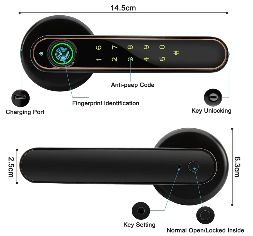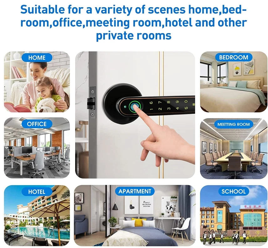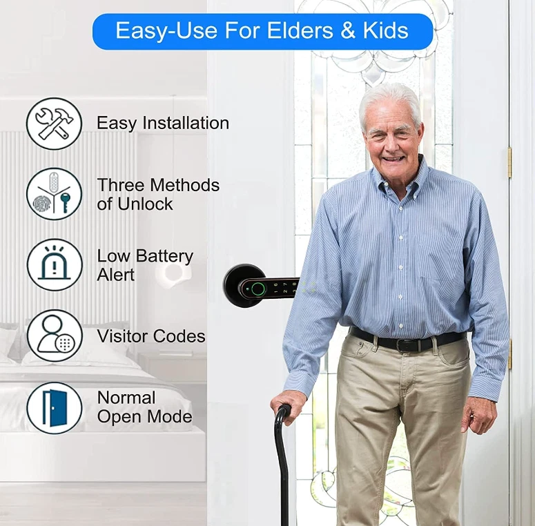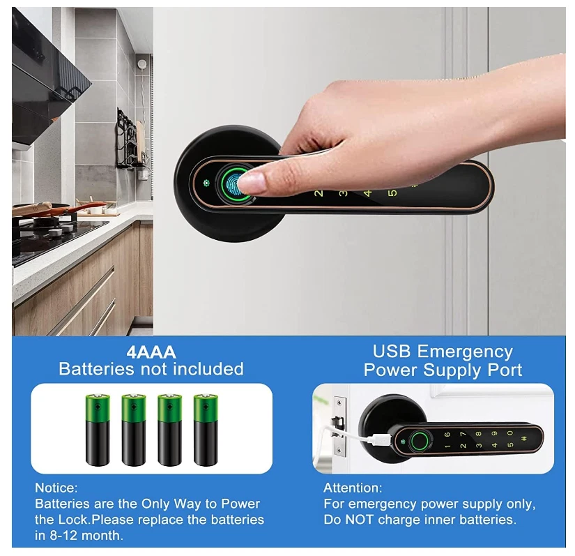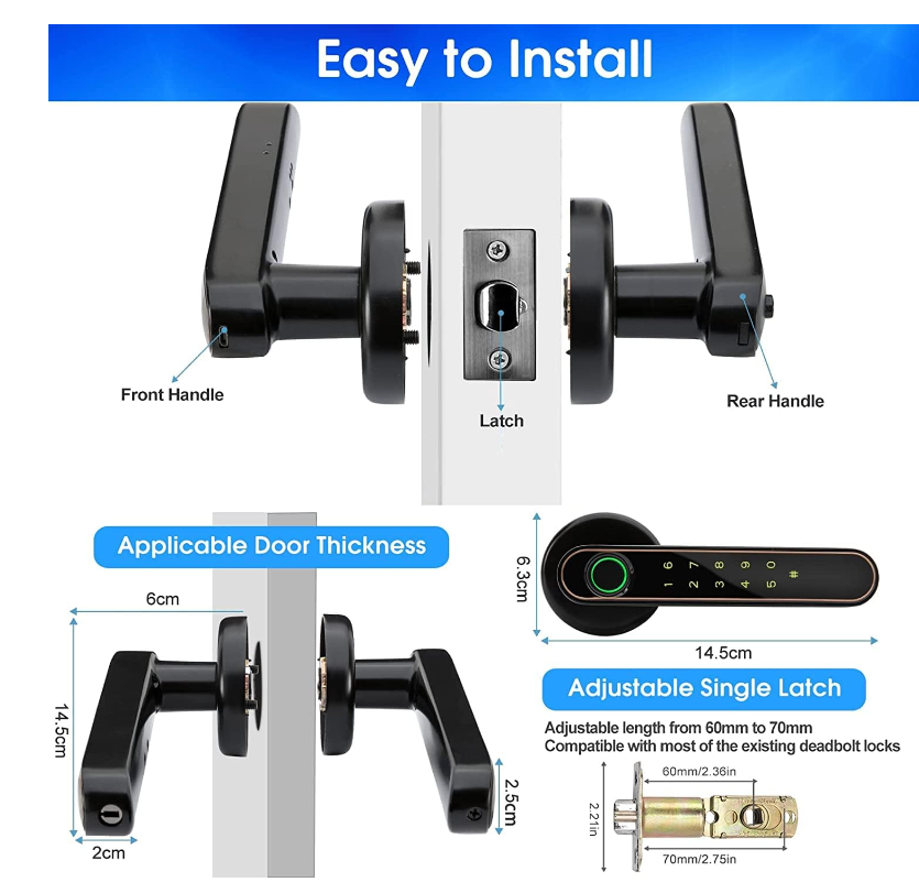4 Ways to Unlock: This 4-in-1 Keyless Entry Smart Lock offers multiple access options, including fingerprint, passcode, Bluetooth (App), or mechanical keys, providing maximum flexibility and convenience. Quick Fingerprint Access: Equipped with advanced biometric fingerprint technology, this door lock recognizes fingerprints with 98% accuracy and unlocks in just 0.3 seconds. Say goodbye to key worries—your fingerprint is all you need for instant access. Easy DIY Installation: Designed to fit most standard single-cylinder US interior doors, this smart lock installs in minutes with just a screwdriver, requiring no extra drilling. It’s compatible with door thicknesses from 1-3/8" (35mm) to 2-3/16" (55mm) and features an adjustable latch (2-3/8" or 2-3/4"). Ensure your door measurements before purchasing. Low Battery Reminder: The door handle includes a battery indicator and requires 4 AAA batteries (not included), lasting 8-10 months. If the battery dies, simply use an Android charging cable through the USB port for emergency unlocking (Note: This port does not charge the battery—please replace the batteries in a timely manner). Versatile & Secure: This smart lock fits all door-opening configurations (left or right) and is perfect for bedrooms, hotels, offices, apartments, and more. It provides enhanced security in various settings.