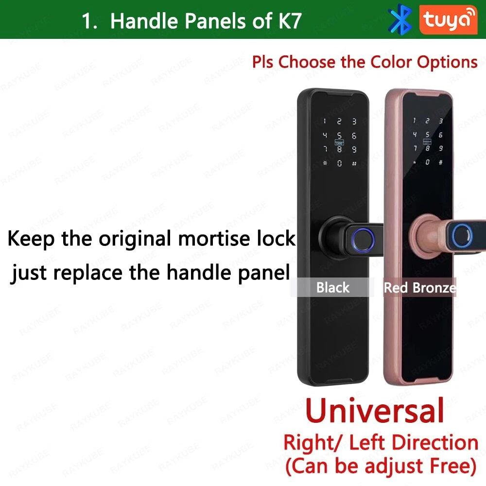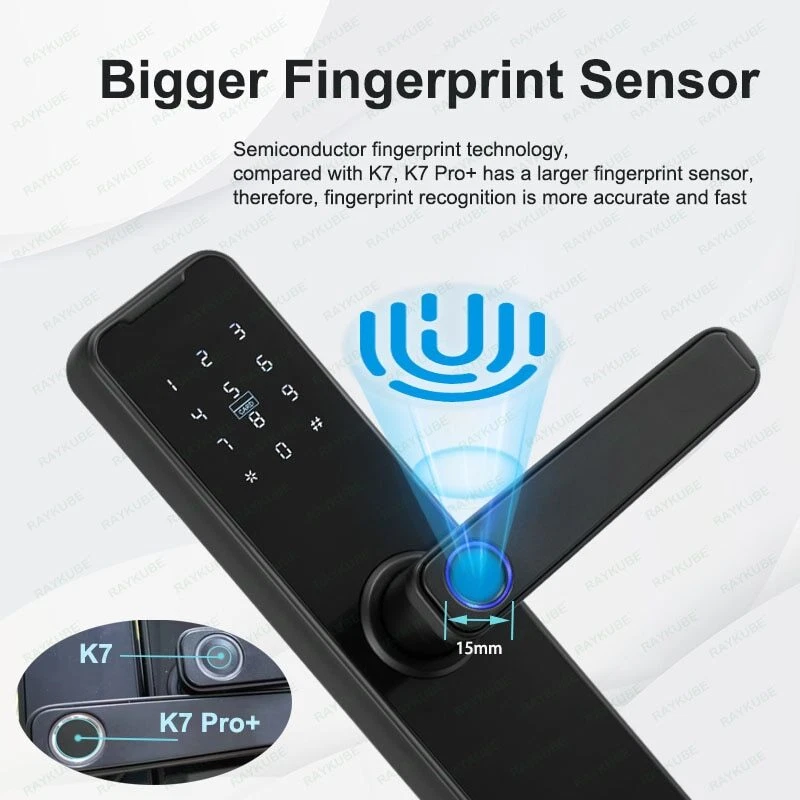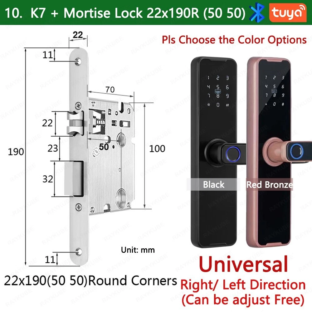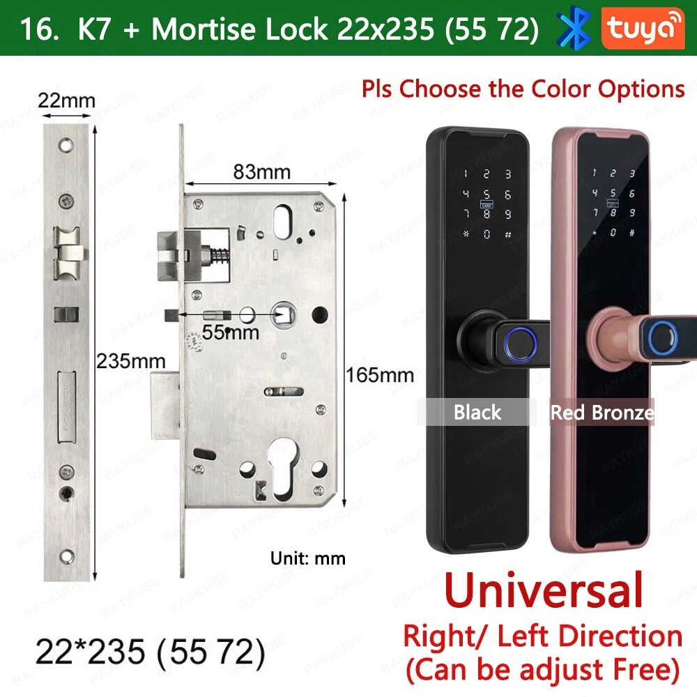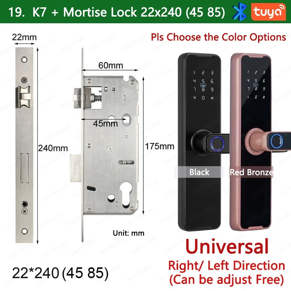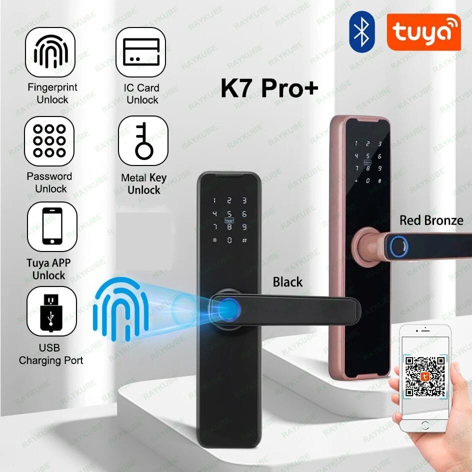 RAYKUBE Biometric Fingerprint Door Lock K7 Pro+ Black Smart Lock Tuya App Remote Unlocking Keyless Lock Electronic Door Lock Portuguese English Voices Supported How to save more money? Get the store coupons before ordering, then the store coupons will be automatically deducted, no need to enter the coupon code. Overview-K7 Pro+ K7 pro+ is the latest version of K7 smart lock. Compared with K7, in terms of function, a Portuguese voice system has been added; In appearance, a larger fingerprint sensor has been made, and the fingerprint recognition speed is faster and more accurate. Notice Before Buying Dear friend, Pls noted the option of " without" is " without mortise lock" , if you keep the original mortise lock, just replace the handle panel. Differences Between The Three Versions Functions K7 K7 Pro K7 Pro+ Tuya Bluetooth / Fingerprint / Password / IC Card / Key Unlock Yes Yes Yes Tuya APP Management Yes Yes Yes Diameter of Fingerprint Sensor 10 mm 15 mm 15 mm Fingerprint Recognition Speed Fast Faster Fastest Fingerprint Sensitivity High Higher Highest System Voices English English English / Portuguese Difference between Tuya Bluetooth version and Tuya WiFi version Because the Wifi version needs to be connected to the smart lock, the battery consumption is faster compared to the Bluetooth version;The Tuya Bluetooth version of the K7 Pro+ has longer battery life, up to 8 months; Features 5 unlock methods: Tuya APP/ Fingerprint / Password / Smart Card / Key Unlock Tuya APP Remote Control,Bluetooth connection, convenient and fast Add USB Bluetooth gateway also can connect to WiFi Original K7 Pro+ supports Portuguese/English voice system Support remote temporary password setting Virtual Password Anti-peeping Unlock Supported Mechanical keys and emergency power supply (USB) can be used when the door lock is out of power. Compared with the Tuya Wifi version, the Tuya Bluetooth version of the K7 Pro+ has longer battery life, up to 8 months Universal for left and right doors, suitable for 35-55mm door thickness. 24+ Sizes of Mortise Lock available Original K7 Pro+ supports Portuguese/English voice system Original K7 Pro+ supports the system voice in Portuguese and English, which is easy to install. The non original K7 Pro+version does not support Portuguese, all the original K7 Pro+ in RAYKUBE Official Store are original. 5 Unlock Methods Tuya APP/ Fingerprint / Password / Smart Card / Key Unlock Bigger Fingerprint Sensor Semiconductor fingerprint technology, compared with K7, K7 Pro+ has a larger fingerprint sensor, therefore, fingerprint recognition is more accurate and fast Press down the handle to open the door in one step without waiting. The fingerprint identification area is added with groove guiding design, which makes the hand feel more comfortable. Tuya APP Temporary Password Remotely Unlock Bluetooth connection; Easy to connect and save power Add B4 USB Bluetooth gateway can connect to WiFi, pls click the following picture to order the B4 gateway, Tuya WiFi Function Upgrade (Discount only 7$ extra need to contact the seller ) that is B4USB Bluetooth Gateway(only 7$) need to be order with K7 Pro+ shipping from China When not at home, you can use the Tuya app to generate a temporary password to unlock Encrypted Smart IC Card ,Easy to Use IC Card to Unlock The Door The smart card core is copy proof and has high security. It is convenient for every member of the family to manage comfortably. If the card is lost, it can be deleted and invalidated Normally Open Mode, Setting More Convenient To Open The Door Frequently Open the normally open mode, the door is unlocked, and the handle can be pressed directly to open the door without fingerprint password Free Handle Design ,Prevents Violent Unlock Prevent malicious pressing on the handle,damage the internal structure and prolong the service life of the motor Artificial Intelligence Algorithm Every time the fingerprint is unlocked, the chip will continuously reduce the rejection rate and improve the pass rate through fingerprint splicing, image recognition, and self-learning algorithms. Virtual Password,Anti-peeping Unlock Anti-peep virtual password, enter it casually, as long as one of them is correct. Safe and Reliable No Fear Of Small Black Box,To Prevent Electromagnetic Attack It has the opening ability of anti magnetic and electric field technology to prevent Tesla coil from unlocking and effectively improve the safety of locks Multiple Anti Test ,Opening Alarm , Continuous Input Error, Automatic Locking Multiple anti trial opening alarm, continuous wrong operation of password/fingerprint/ card, and the system will lock automatically Use 4pcs AAA 1.5V Battery Please use the not rechargeable Alkalin battery. (battery not include in the package) Not Afraid Of No Electricity;USB + Key Double Support If the fingerprint lock has no power, it can be unlocked with mobile power supply or mechanical key Specifications: Model: K7 Pro+ System: Tuya Bluetooth 4.0 Material: Aluminium Alloy Unlock modes: Tuya APP / Fingerprint / Password / Smart card / Key Fingerprint read: FPC Sensor (Semiconductor Sensor) Color: Black / Red Bronze User(fingerprint/card/password): Total 99 Chip Type: Dual Core Driver Touch screen: IML Material Working power: 4 x AAA 1.5V batteries (not include) Operating temperature: -20 to 55 Centigrade Password function: support virtual password Suit for the door thickness about 35-55mm Installation Video https://youtu.be/mBkmKHg8S50 Set up Video https://youtu.be/gRKK8zZuoes How to select the correct mortise lock size We have over 24 different mortise lock size for choose, so please measure the old lock size follow this picture that you would know which size suit for your door. (once you select the correct size, you will very easy to replace the old lock) About Installation This lock suit for the door thickness 35-55mm door thickness. Please measure your old mortise lock size, and check our all options different mortise lock size wh