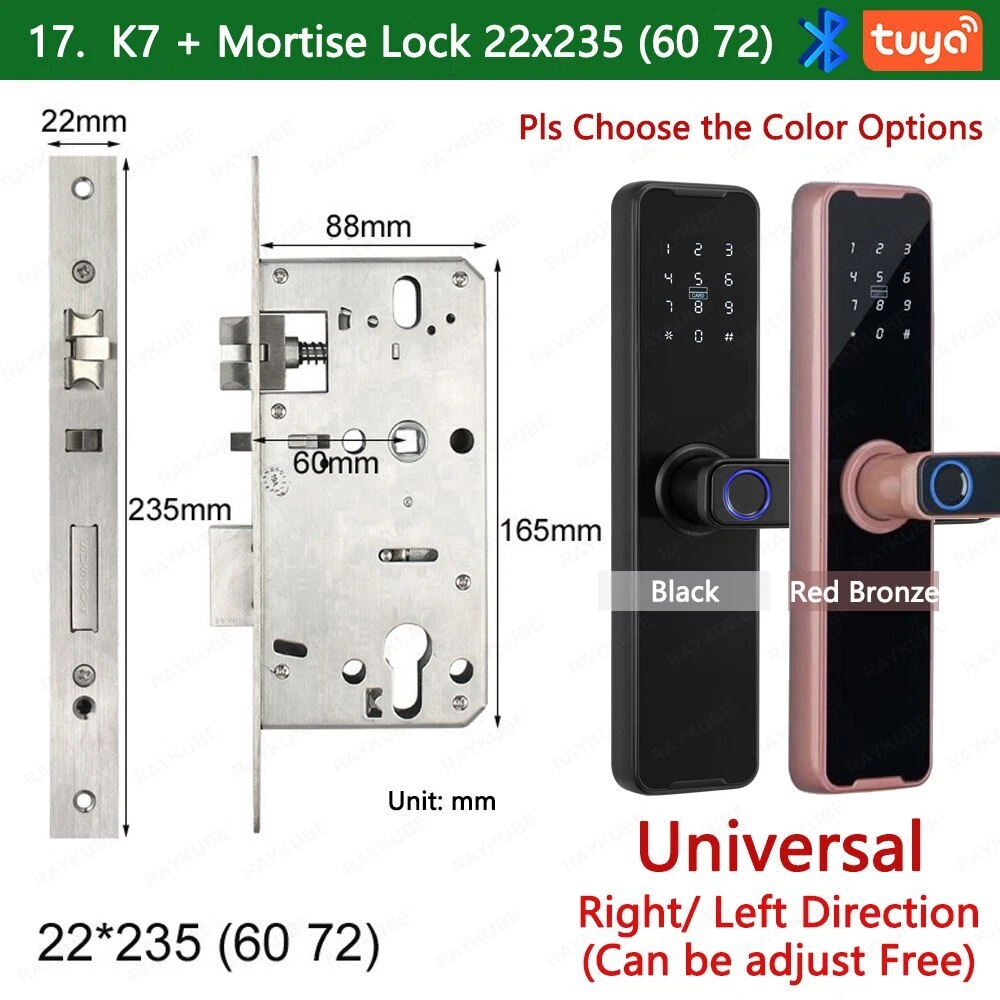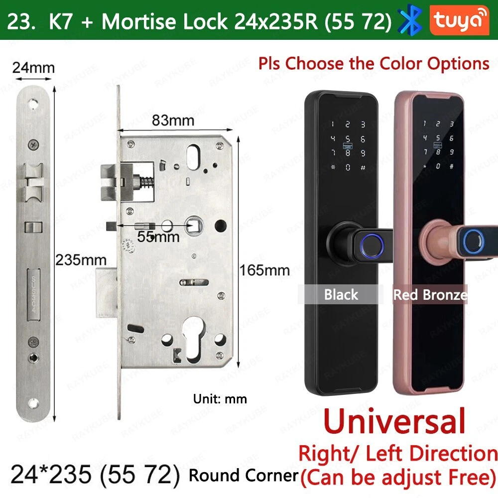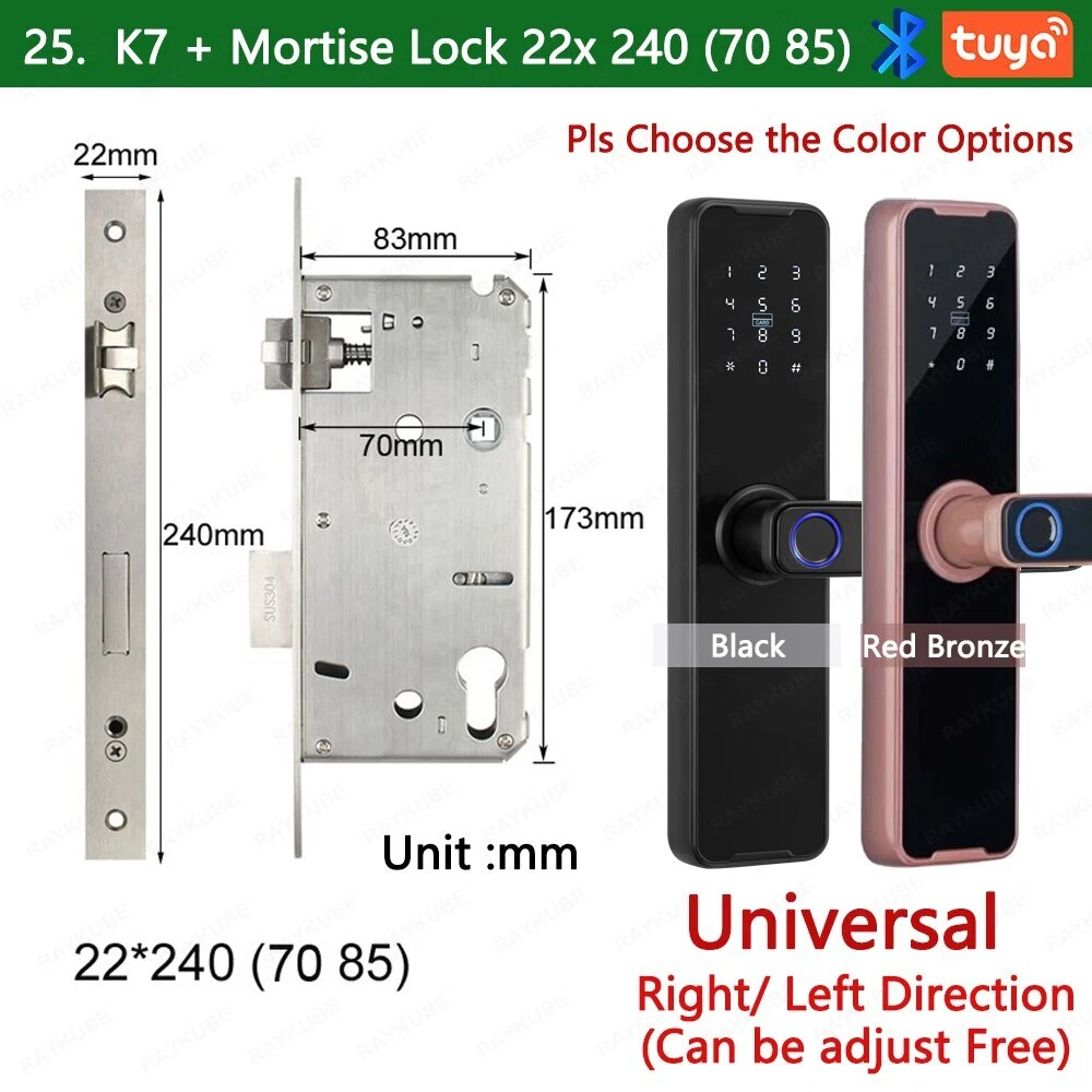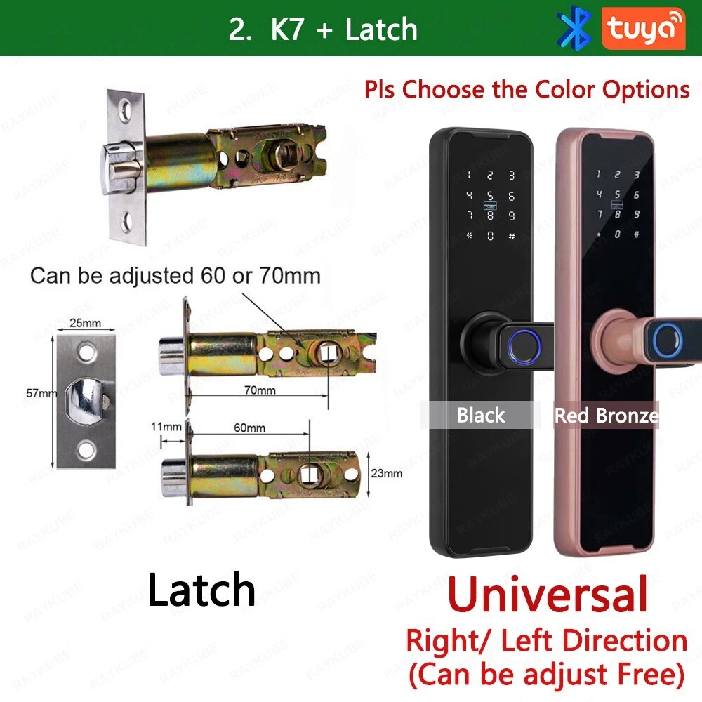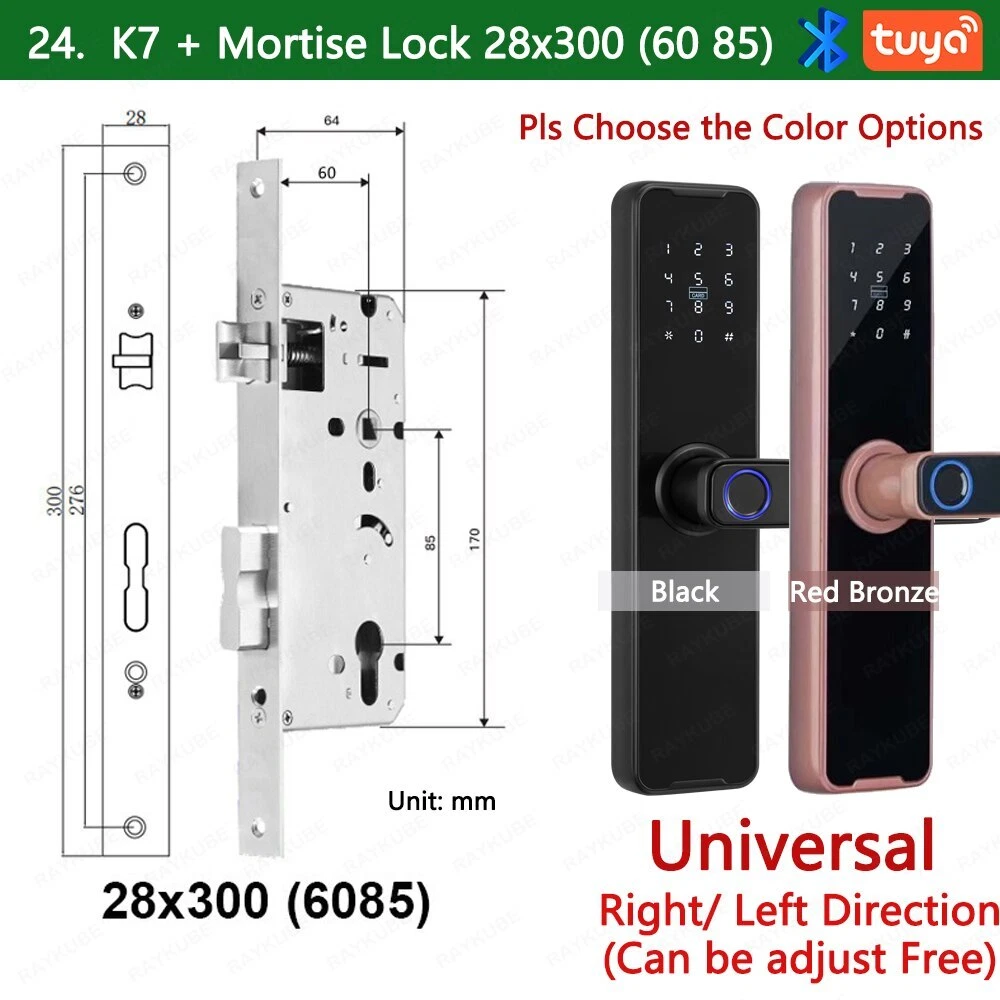 RAYKUBE Biometric Fingerprint Door Lock K7 Pro+ Black Smart Lock Tuya App Remote Unlocking Keyless Lock Electronic Door Lock Portuguese English Voices Supported How to save more money? Get the store coupons before ordering, then the store coupons will be automatically deducted, no need to enter the coupon code. Overview-K7 Pro+ K7 pro+ is the latest version of K7 smart lock. Compared with K7, in terms of function, a Portuguese voice system has been added; In appearance, a larger fingerprint sensor has been made, and the fingerprint recognition speed is faster and more accurate. Notice Before Buying Dear friend, Pls noted the option of " without" is " without mortise lock" , if you keep the original mortise lock, just replace the handle panel. Differences Between The Three Versions Functions K7 K7 Pro K7 Pro+ Tuya Bluetooth / Fingerprint / Password / IC Card / Key Unlock Yes Yes Yes Tuya APP Management Yes Yes Yes Diameter of Fingerprint Sensor 10 mm 15 mm 15 mm Fingerprint Recognition Speed Fast Faster Fastest Fingerprint Sensitivity High Higher Highest System Voices English English English / Portuguese Difference between Tuya Bluetooth version and Tuya WiFi version Because the Wifi version needs to be connected to the smart lock, the battery consumption is faster compared to the Bluetooth version;The Tuya Bluetooth version of the K7 Pro+ has longer battery life, up to 8 months; Features 5 unlock methods: Tuya APP/ Fingerprint / Password / Smart Card / Key Unlock Tuya APP Remote Control,Bluetooth connection, convenient and fast Add USB Bluetooth gateway also can connect to WiFi Original K7 Pro+ supports Portuguese/English voice system Support remote temporary password setting Virtual Password Anti-peeping Unlock Supported Mechanical keys and emergency power supply (USB) can be used when the door lock is out of power. Compared with the Tuya Wifi version, the Tuya Bluetooth version of the K7 Pro+ has longer battery life, up to 8 months Universal for left and right doors, suitable for 35-55mm door thickness. 24+ Sizes of Mortise Lock available Original K7 Pro+ supports Portuguese/English voice system Original K7 Pro+ supports the system voice in Portuguese and English, which is easy to install. The non original K7 Pro+version does not support Portuguese, all the original K7 Pro+ in RAYKUBE Official Store are original. 5 Unlock Methods Tuya APP/ Fingerprint / Password / Smart Card / Key Unlock Bigger Fingerprint Sensor Semiconductor fingerprint technology, compared with K7, K7 Pro+ has a larger fingerprint sensor, therefore, fingerprint recognition is more accurate and fast Press down the handle to open the door in one step without waiting. The fingerprint identification area is added with groove guiding design, which makes the hand feel more comfortable. Tuya APP Temporary Password Remotely Unlock Bluetooth connection; Easy to connect and save power Add B4 USB Bluetooth gateway can connect to WiFi, pls click the following picture to order the B4 gateway, Tuya WiFi Function Upgrade (Discount only 7$ extra need to contact the seller ) that is B4USB Bluetooth Gateway(only 7$) need to be order with K7 Pro+ shipping from China When not at home, you can use the Tuya app to generate a temporary password to unlock Encrypted Smart IC Card ,Easy to Use IC Card to Unlock The Door The smart card core is copy proof and has high security. It is convenient for every member of the family to manage comfortably. If the card is lost, it can be deleted and invalidated Normally Open Mode, Setting More Convenient To Open The Door Frequently Open the normally open mode, the door is unlocked, and the handle can be pressed directly to open the door without fingerprint password Free Handle Design ,Prevents Violent Unlock Prevent malicious pressing on the handle,damage the internal structure and prolong the service life of the motor Artificial Intelligence Algorithm Every time the fingerprint is unlocked, the chip will continuously reduce the rejection rate and improve the pass rate through fingerprint splicing, image recognition, and self-learning algorithms. Virtual Password,Anti-peeping Unlock Anti-peep virtual password, enter it casually, as long as one of them is correct. Safe and Reliable No Fear Of Small Black Box,To Prevent Electromagnetic Attack It has the opening ability of anti magnetic and electric field technology to prevent Tesla coil from unlocking and effectively improve the safety of locks Multiple Anti Test ,Opening Alarm , Continuous Input Error, Automatic Locking Multiple anti trial opening alarm, continuous wrong operation of password/fingerprint/ card, and the system will lock automatically Use 4pcs AAA 1.5V Battery Please use the not rechargeable Alkalin battery. (battery not include in the package) Not Afraid Of No Electricity;USB + Key Double Support If the fingerprint lock has no power, it can be unlocked with mobile power supply or mechanical key Specifications: Model: K7 Pro+ System: Tuya Bluetooth 4.0 Material: Aluminium Alloy Unlock modes: Tuya APP / Fingerprint / Password / Smart card / Key Fingerprint read: FPC Sensor (Semiconductor Sensor) Color: Black / Red Bronze User(fingerprint/card/password): Total 99 Chip Type: Dual Core Driver Touch screen: IML Material Working power: 4 x AAA 1.5V batteries (not include) Operating temperature: -20 to 55 Centigrade Password function: support virtual password Suit for the door thickness about 35-55mm Installation Video https://youtu.be/mBkmKHg8S50 Set up Video https://youtu.be/gRKK8zZuoes How to select the correct mortise lock size We have over 24 different mortise lock size for choose, so please measure the old lock size follow this picture that you would know which size suit for your door. (once you select the correct size, you will very easy to replace the old lock) About Installation This lock suit for the door thickness 35-55mm door thickness. Please measure your old mortise lock size, and check our all options different mortise lock size wh