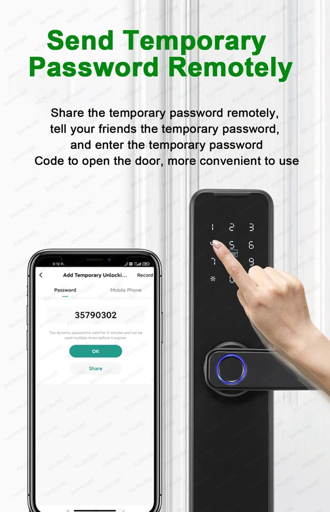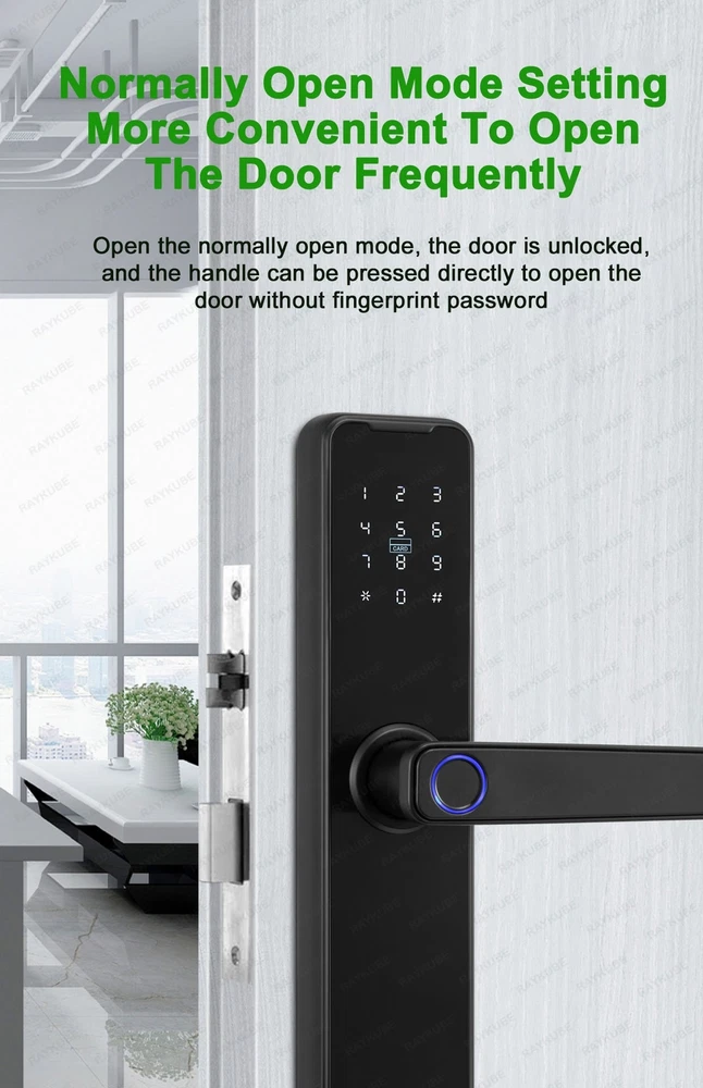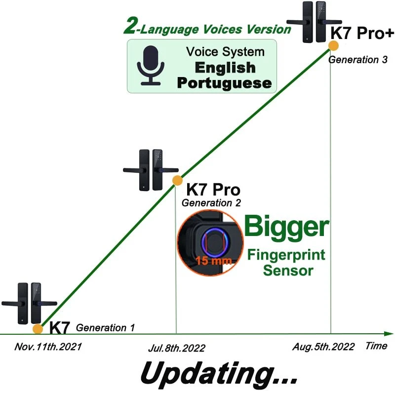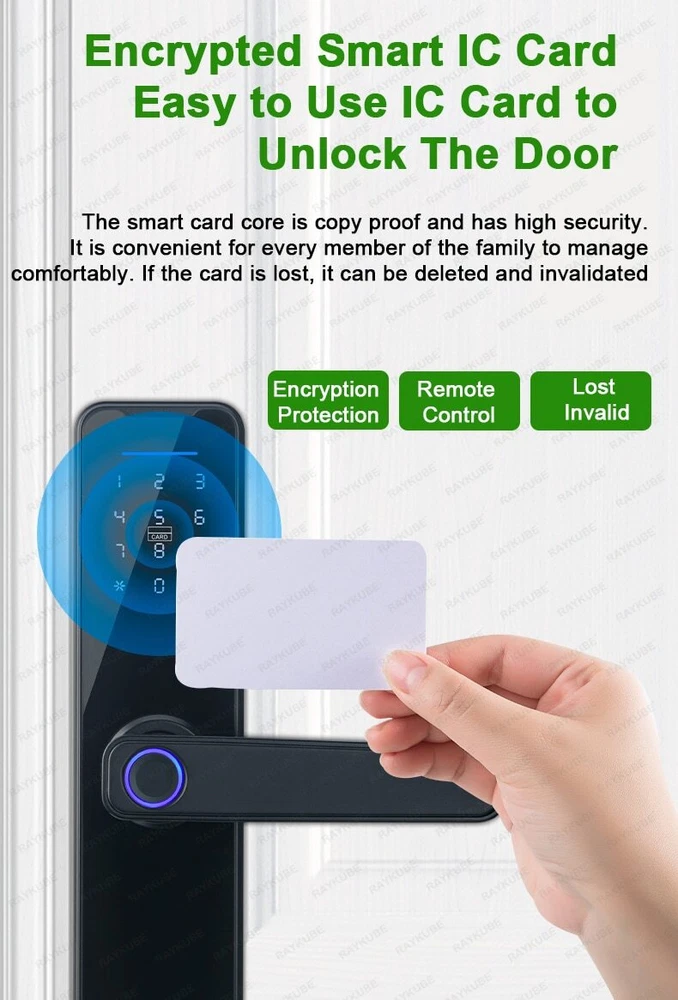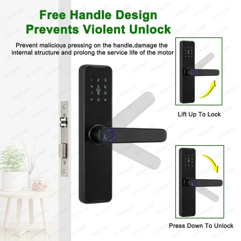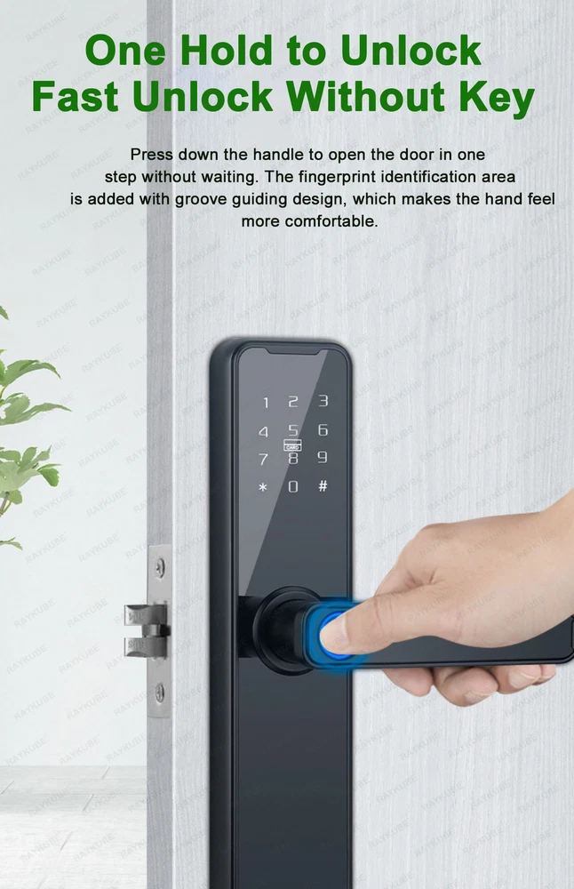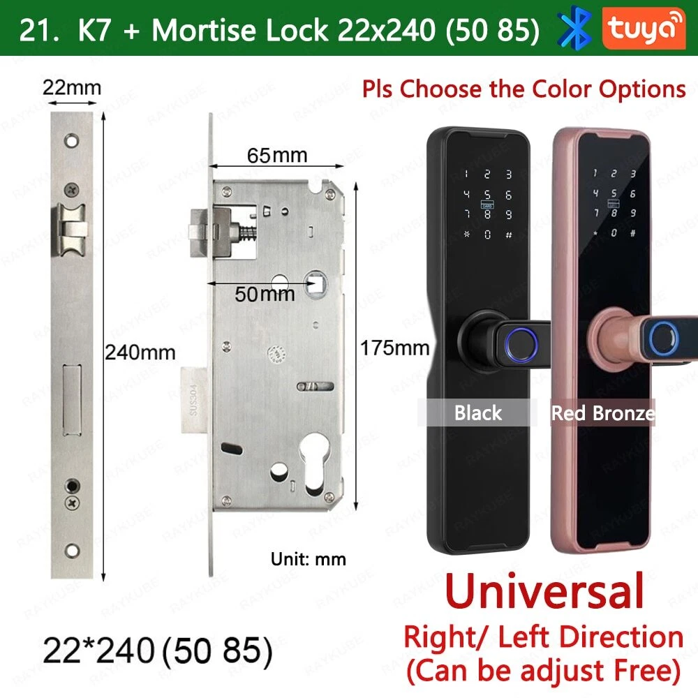 RAYKUBE Biometric Fingerprint Door Lock K7 Pro+ Black Smart Lock Tuya App Remote Unlocking Keyless Lock Electronic Door Lock Portuguese English Voices Supported How to save more money? Get the store coupons before ordering, then the store coupons will be automatically deducted, no need to enter the coupon code. Overview-K7 Pro+ K7 pro+ is the latest version of K7 smart lock. Compared with K7, in terms of function, a Portuguese voice system has been added; In appearance, a larger fingerprint sensor has been made, and the fingerprint recognition speed is faster and more accurate. Notice Before Buying Dear friend, Pls noted the option of " without" is " without mortise lock" , if you keep the original mortise lock, just replace the handle panel. Differences Between The Three Versions Functions K7 K7 Pro K7 Pro+ Tuya Bluetooth / Fingerprint / Password / IC Card / Key Unlock Yes Yes Yes Tuya APP Management Yes Yes Yes Diameter of Fingerprint Sensor 10 mm 15 mm 15 mm Fingerprint Recognition Speed Fast Faster Fastest Fingerprint Sensitivity High Higher Highest System Voices English English English / Portuguese Difference between Tuya Bluetooth version and Tuya WiFi version Because the Wifi version needs to be connected to the smart lock, the battery consumption is faster compared to the Bluetooth version;The Tuya Bluetooth version of the K7 Pro+ has longer battery life, up to 8 months; Features 5 unlock methods: Tuya APP/ Fingerprint / Password / Smart Card / Key Unlock Tuya APP Remote Control,Bluetooth connection, convenient and fast Add USB Bluetooth gateway also can connect to WiFi Original K7 Pro+ supports Portuguese/English voice system Support remote temporary password setting Virtual Password Anti-peeping Unlock Supported Mechanical keys and emergency power supply (USB) can be used when the door lock is out of power. Compared with the Tuya Wifi version, the Tuya Bluetooth version of the K7 Pro+ has longer battery life, up to 8 months Universal for left and right doors, suitable for 35-55mm door thickness. 24+ Sizes of Mortise Lock available Original K7 Pro+ supports Portuguese/English voice system Original K7 Pro+ supports the system voice in Portuguese and English, which is easy to install. The non original K7 Pro+version does not support Portuguese, all the original K7 Pro+ in RAYKUBE Official Store are original. 5 Unlock Methods Tuya APP/ Fingerprint / Password / Smart Card / Key Unlock Bigger Fingerprint Sensor Semiconductor fingerprint technology, compared with K7, K7 Pro+ has a larger fingerprint sensor, therefore, fingerprint recognition is more accurate and fast Press down the handle to open the door in one step without waiting. The fingerprint identification area is added with groove guiding design, which makes the hand feel more comfortable. Tuya APP Temporary Password Remotely Unlock Bluetooth connection; Easy to connect and save power Add B4 USB Bluetooth gateway can connect to WiFi, pls click the following picture to order the B4 gateway, Tuya WiFi Function Upgrade (Discount only 7$ extra need to contact the seller ) that is B4USB Bluetooth Gateway(only 7$) need to be order with K7 Pro+ shipping from China When not at home, you can use the Tuya app to generate a temporary password to unlock Encrypted Smart IC Card ,Easy to Use IC Card to Unlock The Door The smart card core is copy proof and has high security. It is convenient for every member of the family to manage comfortably. If the card is lost, it can be deleted and invalidated Normally Open Mode, Setting More Convenient To Open The Door Frequently Open the normally open mode, the door is unlocked, and the handle can be pressed directly to open the door without fingerprint password Free Handle Design ,Prevents Violent Unlock Prevent malicious pressing on the handle,damage the internal structure and prolong the service life of the motor Artificial Intelligence Algorithm Every time the fingerprint is unlocked, the chip will continuously reduce the rejection rate and improve the pass rate through fingerprint splicing, image recognition, and self-learning algorithms. Virtual Password,Anti-peeping Unlock Anti-peep virtual password, enter it casually, as long as one of them is correct. Safe and Reliable No Fear Of Small Black Box,To Prevent Electromagnetic Attack It has the opening ability of anti magnetic and electric field technology to prevent Tesla coil from unlocking and effectively improve the safety of locks Multiple Anti Test ,Opening Alarm , Continuous Input Error, Automatic Locking Multiple anti trial opening alarm, continuous wrong operation of password/fingerprint/ card, and the system will lock automatically Use 4pcs AAA 1.5V Battery Please use the not rechargeable Alkalin battery. (battery not include in the package) Not Afraid Of No Electricity;USB + Key Double Support If the fingerprint lock has no power, it can be unlocked with mobile power supply or mechanical key Specifications: Model: K7 Pro+ System: Tuya Bluetooth 4.0 Material: Aluminium Alloy Unlock modes: Tuya APP / Fingerprint / Password / Smart card / Key Fingerprint read: FPC Sensor (Semiconductor Sensor) Color: Black / Red Bronze User(fingerprint/card/password): Total 99 Chip Type: Dual Core Driver Touch screen: IML Material Working power: 4 x AAA 1.5V batteries (not include) Operating temperature: -20 to 55 Centigrade Password function: support virtual password Suit for the door thickness about 35-55mm Installation Video https://youtu.be/mBkmKHg8S50 Set up Video https://youtu.be/gRKK8zZuoes How to select the correct mortise lock size We have over 24 different mortise lock size for choose, so please measure the old lock size follow this picture that you would know which size suit for your door. (once you select the correct size, you will very easy to replace the old lock) About Installation This lock suit for the door thickness 35-55mm door thickness. Please measure your old mortise lock size, and check our all options different mortise lock size wh