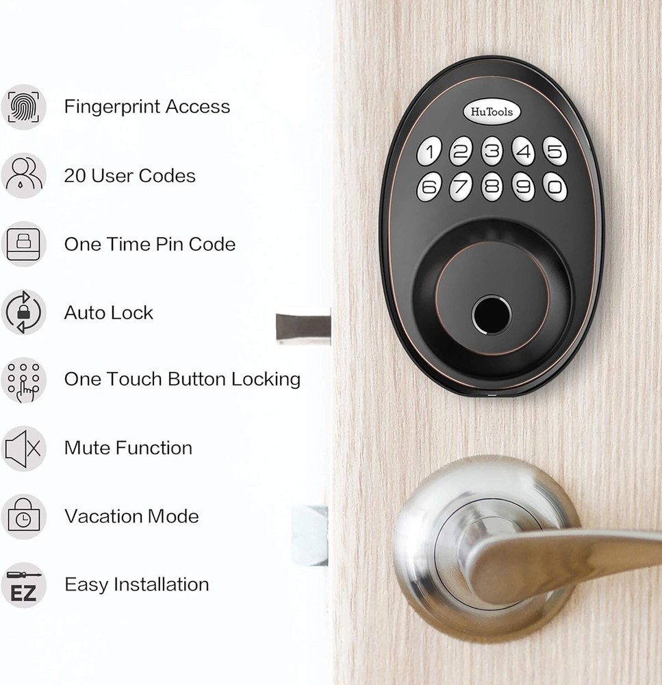 Keyless Entry Door Locks with Keypads, Electronic Deadbolt Lock Fingerprint with 20 User Codes, Auto Lock, Biometric Digital Locks for Interior Doors, Oil Rubbed Bronze Fingerprint identification, biometric door lock recognizes your fingerprint in just 0.3 seconds; equipped with advanced biometric fingerprint technology, the recognition rate is up to 98%; can register up to 20 fingerprints for your family and yourself 20 customizable user codes, keyless entry door lock supports to unlock with fingerprint and code; create 20 user codes plus one temporary code for your visitors and maintenance workers, no need to rush back home to open the door for them Automatic locking, the keypad deadbolt lock will auto-lock in 30 seconds for peace of mind, you could set the auto-lock time delay between 10 and 99 seconds, or one touch on the keypad to lock the door; keeping your home secure even when you’re in a hurry Secure and reliable, when someone comes with you, an anti-peep password allows you to enter random digits before or after the correct access code, don't worry about leaking personal information to others; these electronic fingerprint door locks allow you store your fingerprint locally rather than on the cloud, keep your personal information safe and private Easy to install and program, no professional locksmith required; following the detailed instructions, you can install and program digital biometric door lock by yourself; this fingerprint deadbolt lock fits most of the standard American single latch locks; suitable for aluminum, wooden, and swing door of office, home, apartment, garage On Apr 4, 2025 at 23:55:18 PDT, seller added the following information: