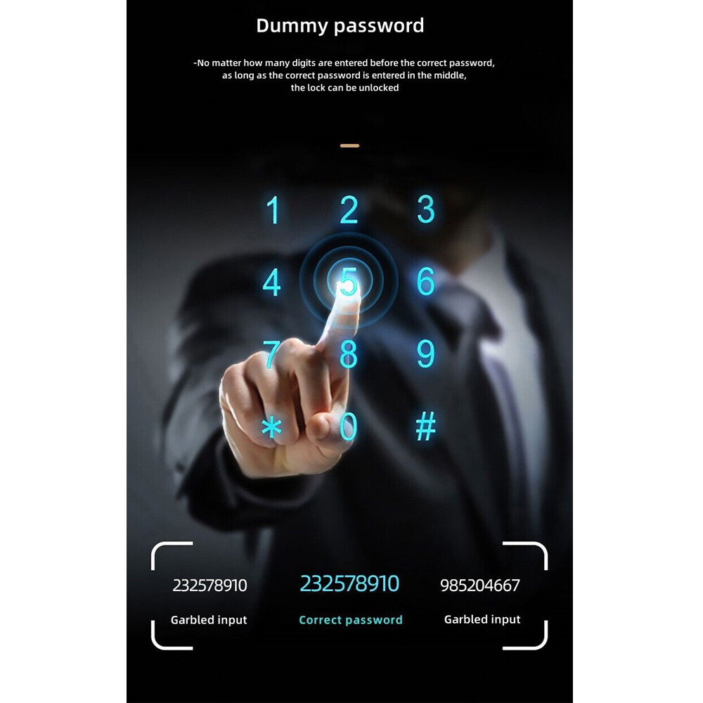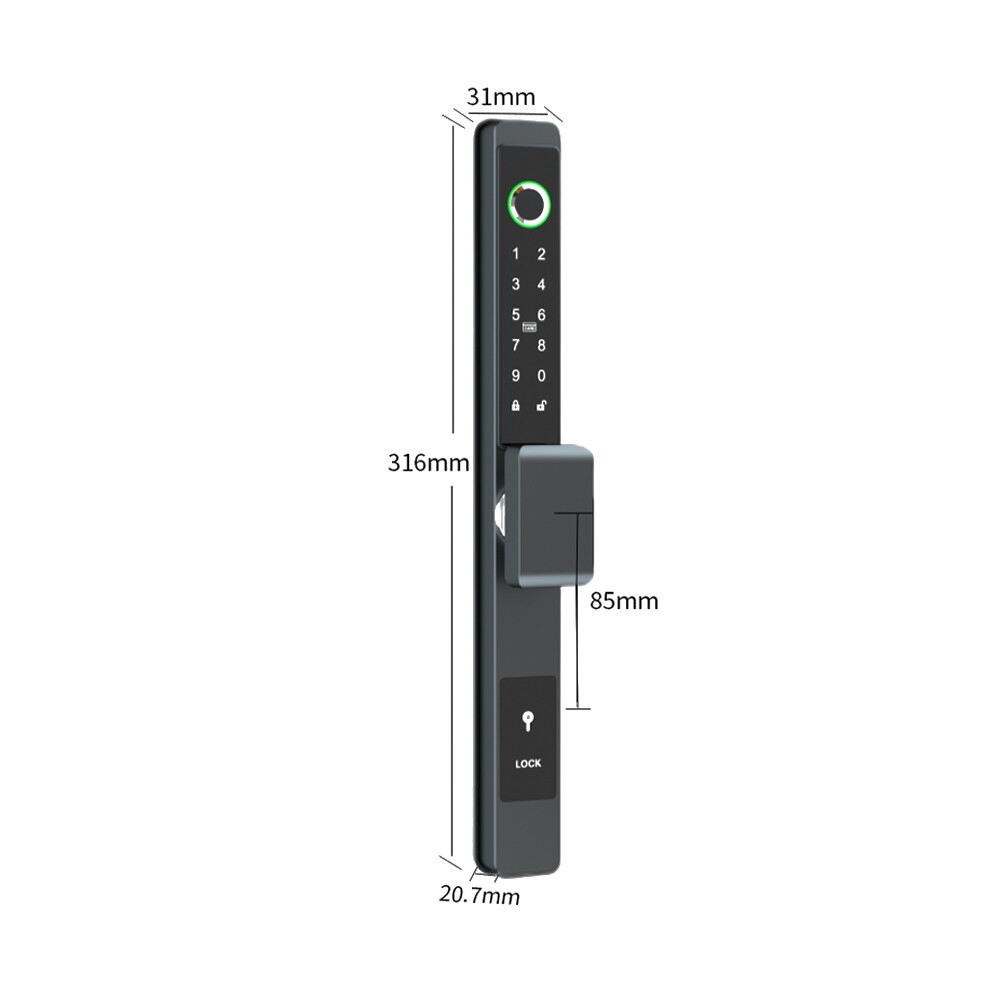 Specifications Main materials:Insulating aluminum alloy Main board adopts Financial-grade security chip Original bio-semiconductor fingerprint scanner imported from Sweden. Modern fashion touchscreen panel. Changeable function between passage lock and household lock. Dry finger can use the fingerprint lock normally. 9V batteries backup power interface. Low voltage alarm function. Unlock ways: fingerprint + code + card + key+app Fingerprint collected time: <1s. FAR: <0.00001%. FRR: <0.01%. Capacity: 250pcs fingerprints + 1000 cards + 250 group codes. Available cards: Mifare1 IC/S50 card Working Temperature: 0 °C ~ + 70 °C Static current/Dynamic current :< 65μA/<350mA. Power supply: 6V (4*1.5V AA alkaline batteries). Battery life: normally opening door for 50,000 times Size:316mmx31mmx19mm App software:TTLock app