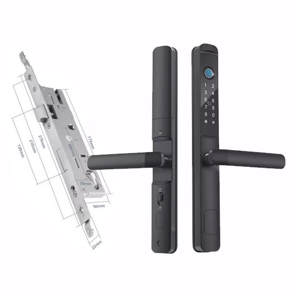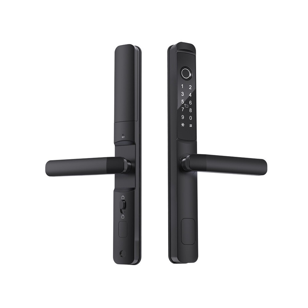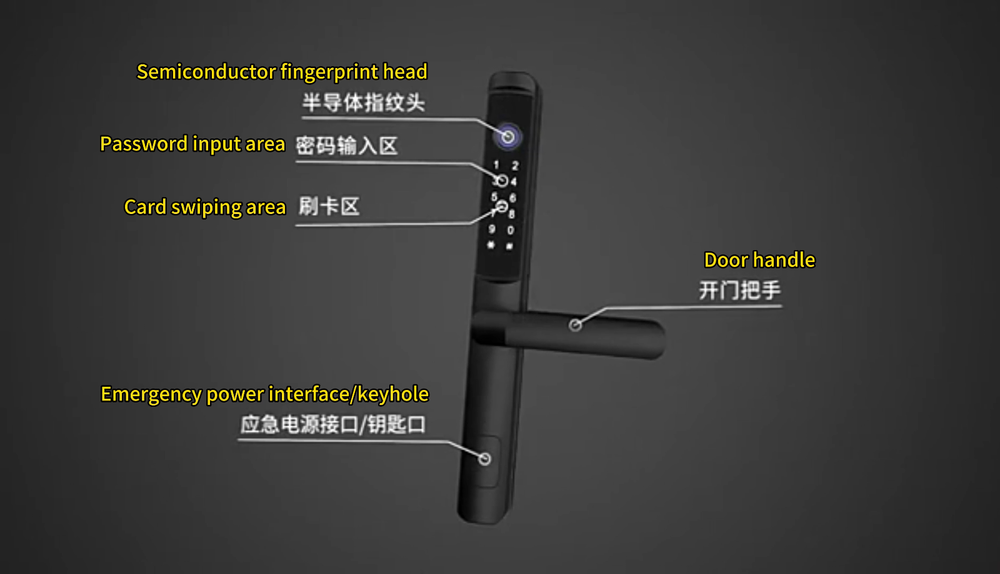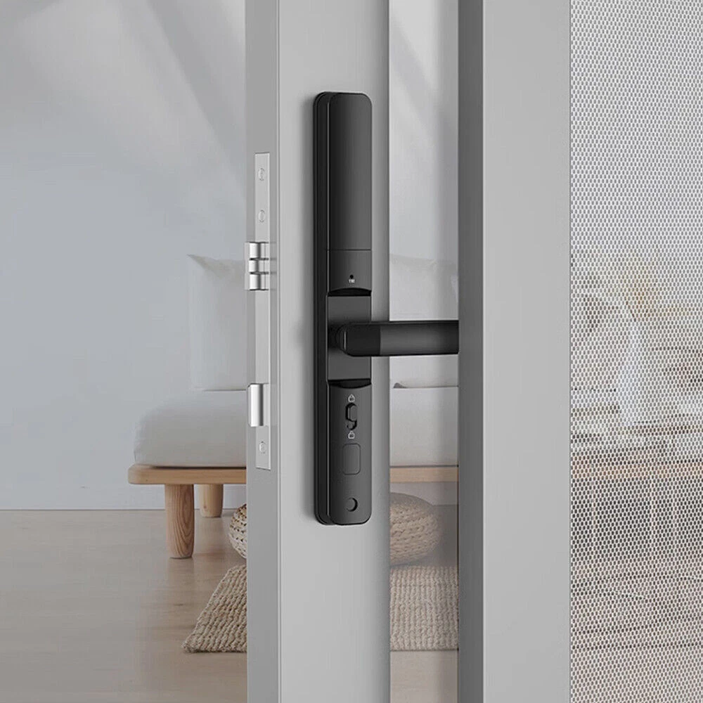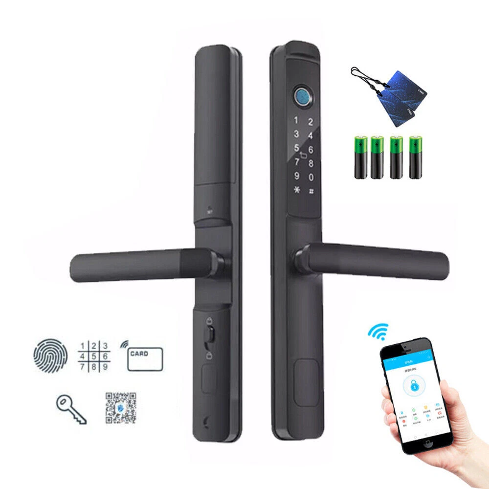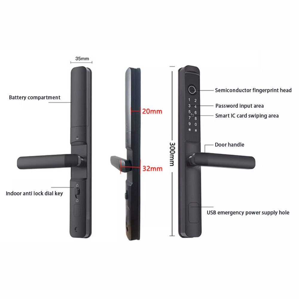 Specifications: Main materials:Insulating aluminum alloy. Main board adopts Financial-grade security chip Original bio-semiconductor fingerprint scanner imported from Sweden. Modern fashion touchscreen panel. Changeable function between passage lock and household lock. Dry finger can use the fingerprint lock normally. 9V batteries backup power interface. Low voltage alarm function. Unlock ways: fingerprint + code + card + key+app. Fingerprint collected time: <1s. FAR: <0.00001%. FRR: <0.01%. Capacity: 100pcs fingerprints + 200 cards + 150 group codes. Available cards: Mifare1 IC/S50 card. Working Temperature: -30 °C ~ + 60 °C. Static current/Dynamic current :< 65μA/<350mA. Power supply: 6V (4*1.5V AA alkaline batteries). Battery life: normally opening door for 100,000 times. Size:300mmx35mmx20mm. App software:TTLock app.