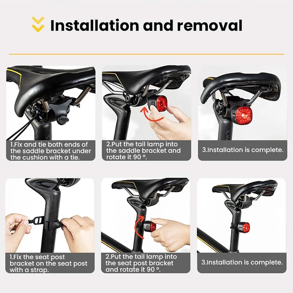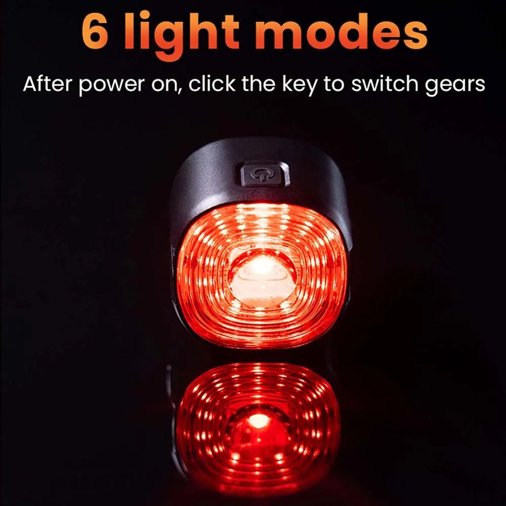 LED Bike Taillight High Brightness USB Rechargeable Bike Safety Rear Lights Waterproof 6 Lighting Modes Night Riding Accessories Feature: 1. Intelligent Light Control: Automatically detect the brightness of the riding environment after the tail light is on for a period of time in the flashing mode, automatically turn off when it is on, automatically turn on when it is dark, and automatically turn off the light after parking in a dark environment for a period of time. 2. Brake Sensing: Built-in high-density speed sensor. When sensing the deceleration of the vehicle body, the red light will highlight for 3 seconds and then return to the current mode, prompting the rear to pay attention to improve safety. 3. High Brightness: High brightness LED lamp beads, high brightness. Three installation methods are applicable to more bicycles. 4. Waterproof: Good sealing, no fear of riding in rainy days. 5. Satisfaction Guarantee: We strive to provide each customer with the highest standard of customer service to ensure you have a pleasant shopping experience. If you have any issues, inquiries or need assistance, please feel free to contact us directly. Specification: Main material: ABS+PC Product color: black Product specification: WT09-ordinary model/WT09S-smart brake model (optional) Product size: about 33x33x30mm/1.29x1.29x1.18inch Net weight of product: about 20g Other parameters: Bead parameters: red LED Beads Light gear: 6, always on and various flashing Charging mode: Type-C USB charging Product battery: 250mAh polymer battery/400mAh polymer battery (included) Endurance: 10H/12H The difference between WT09 ordinary model and WT09S smart brake model: The WT09 ordinary model has no intelligent braking function, just a simple tail lamp; The WT09 ordinary model battery has a capacity of only 250mAh. Warm Tips: By default, the two logo colors are shipped randomly, but generally the WT09 ordinary model logo is white, and the WT09S smart brake model logo is red. Note: Due to the different monitor and light effect, the actual color of the item might be slightly different from the color showed on the pictures. Thank you! Please allow 1-2cm measuring deviation due to manual measurement. 1 x Bicycle tail lamp 1 x Charging cable (black and white random delivery)