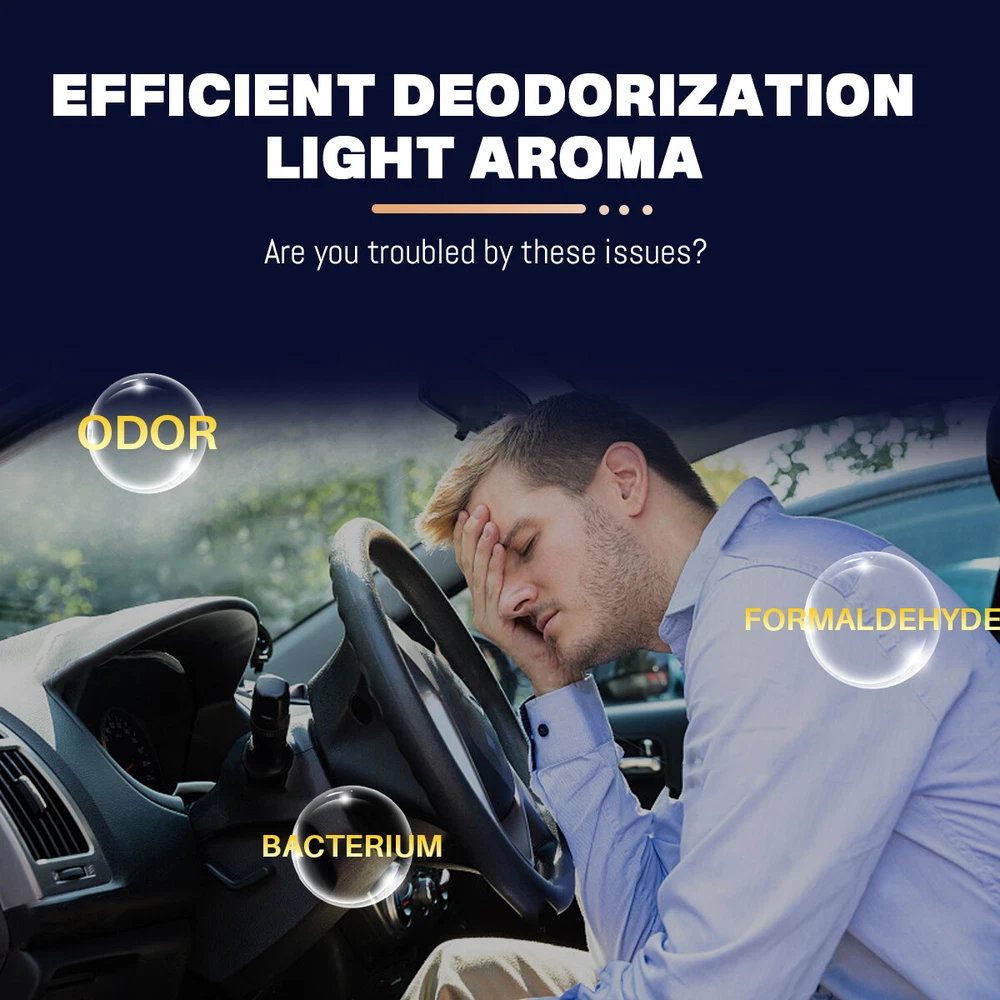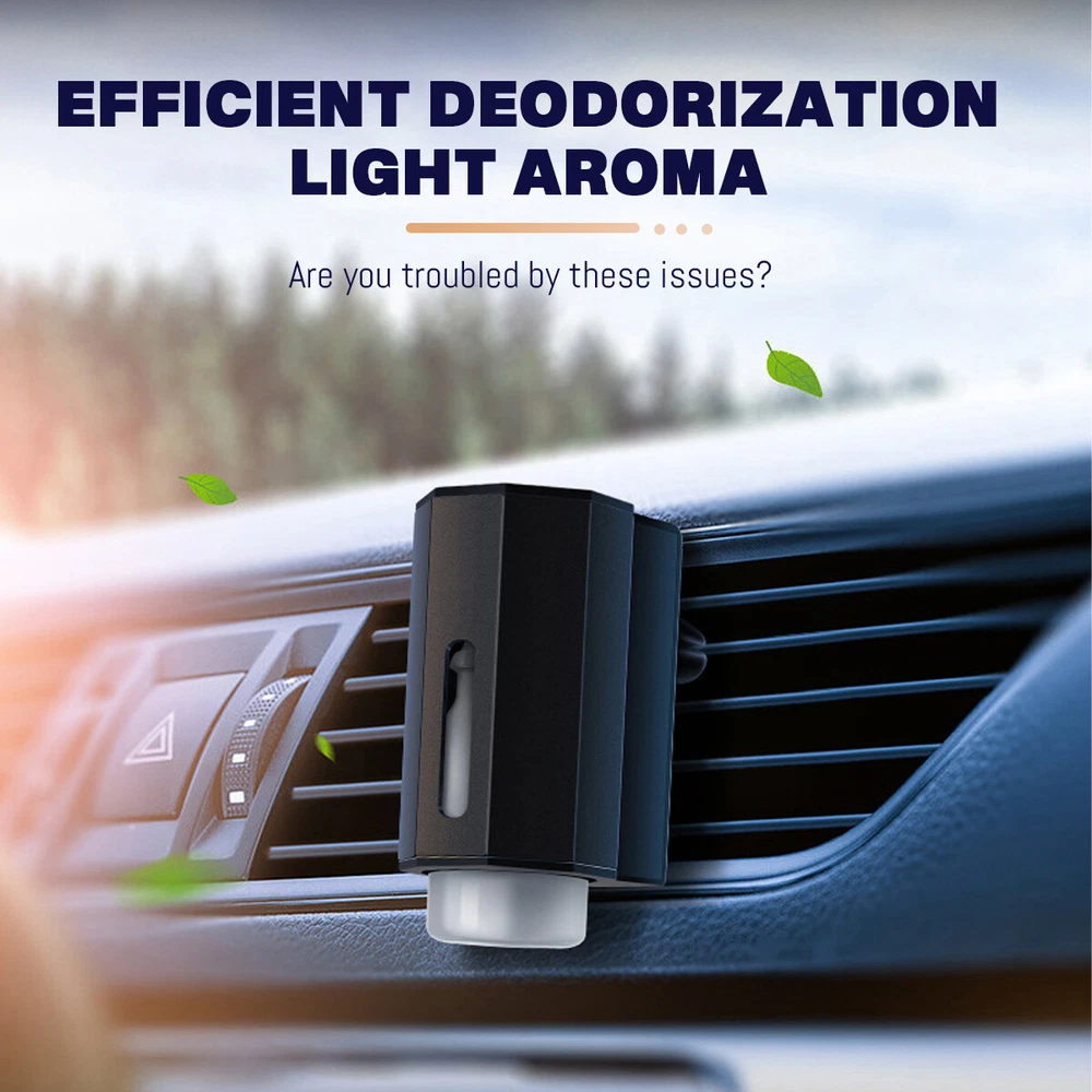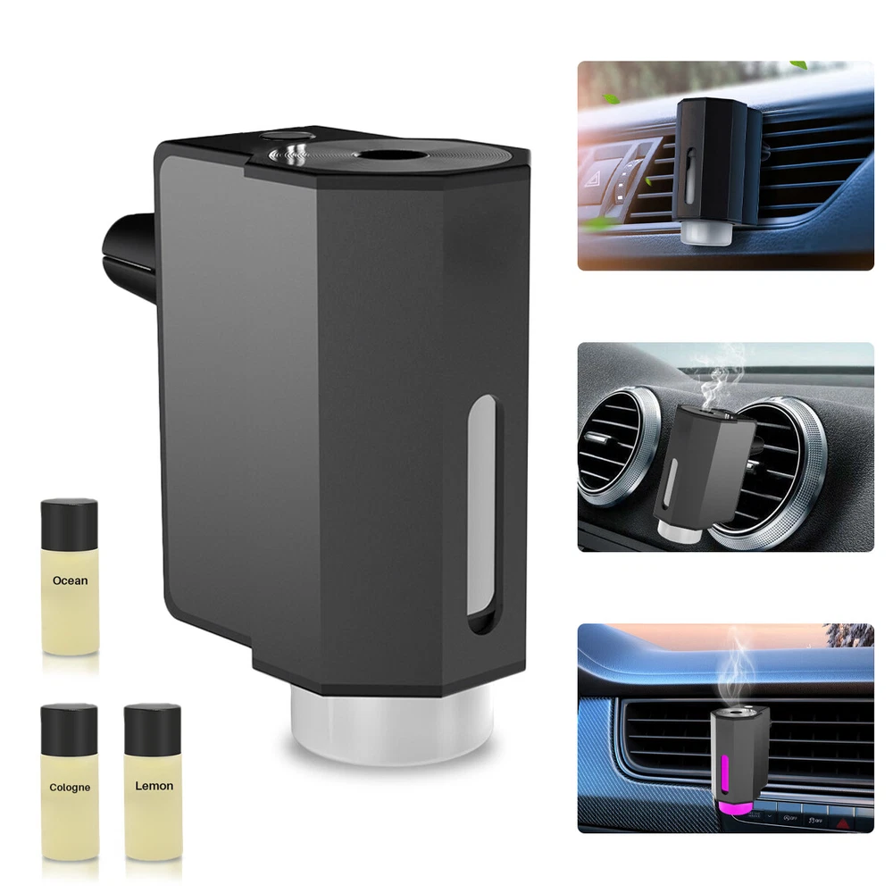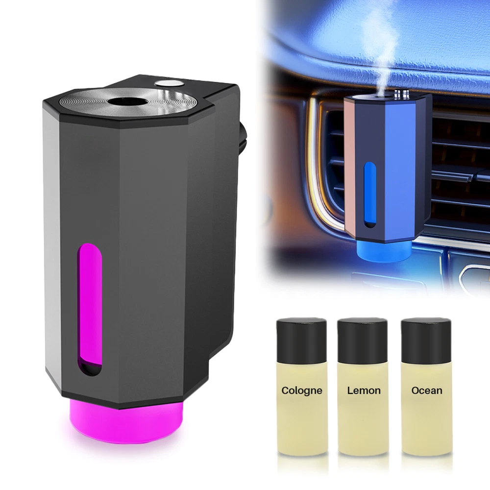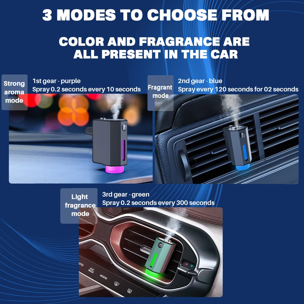 Car Air Fresheners - 3*10ML Natural French Perfume Lasts 45 Days, Portable Waterless Car Diffuser Air Freshener Car Aromatherapy Diffuser, Adjust Concentration Scent Features: 1. Intelligent car air freshener: Intelligent car air freshener with three adjustable modes: intelligent start, automatic shutdown, and intelligent fragrance adjustment. It can detect the condition of the air conditioning in the car and match it with the ambient light, automatically adjusting the duration of the fragrance. It provides three modes that can be freely adjusted. 2. Exquisite Design - This intelligent car air freshener has a fashionable design that can not only serve as a car diffuser, but also as a decorative accessory. It can be used in various environments, including inside cars, as well as in places such as bathrooms, bedrooms, or pet areas at home. 3. High quality: The intelligent car air freshener is made of durable aluminum alloy, with a long service life. Equipped with a 220mAh lithium battery, fully charged in 60 minutes, with a battery life of up to 45 days. 4. Three adjustable modes with projection lights: The intelligent car air freshener is equipped with projection lights and provides three injection modes: - Mild mode: Green light, spraying every 300 seconds for 0.2 seconds- Medium mode: Blue light, sprayed every 90 seconds for 0.2 seconds- Strong mode: Purple light, spraying for 0.2 seconds every 10 seconds. 5. Intelligent car air freshener: Easily eliminate various odors and provide a refreshing experience. Our waterless car diffuser ensures no clutter and requires minimal cleaning, making it the perfect choice for cars, bedrooms, living rooms, offices, and other spaces. Specifications: Battery capacity: 22mAh Spray mode: Green spray 0.2 seconds every 300 seconds, blue spray 0.2 seconds every 90 seconds, purple spray 0.2 seconds every 10 seconds Package List: Aromatherapy machine * 1 Charging cable * 1 Aromatherapy liquid * 3