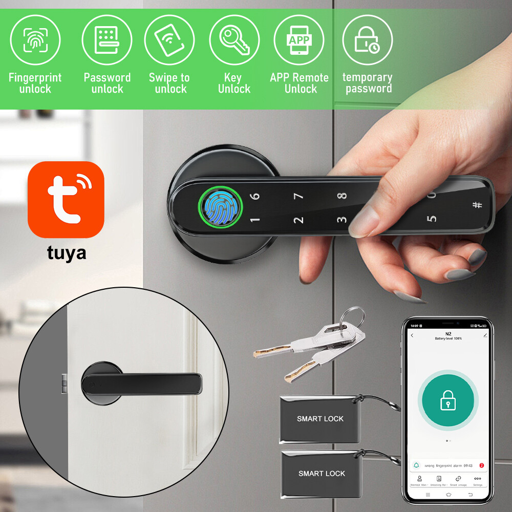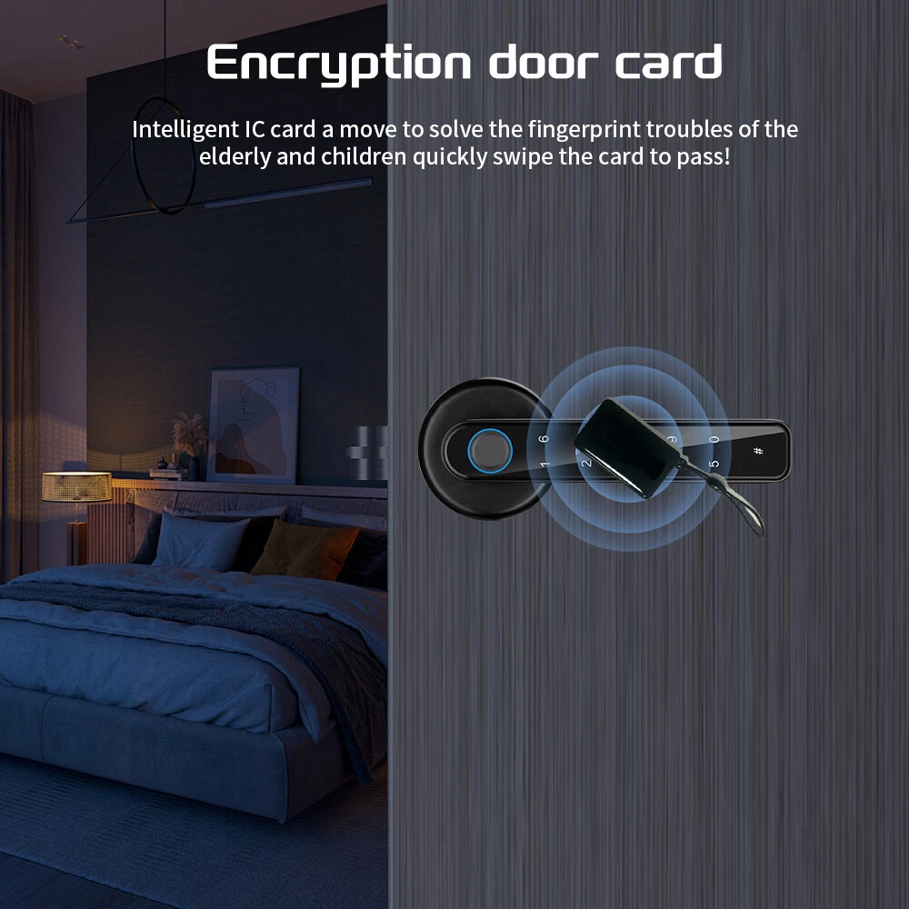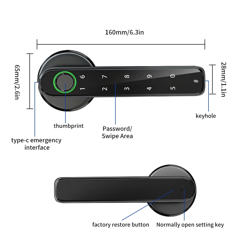 [5 Multiple Ways To Unlock]: Fingerprint + Passcode + APP Control+ IC Cards (4 PCS for 12-15 MHZ) + Physical Keys (2 PCS). The door lock supports to add 50+ fingerprints, 100 pcs IC cards. TMEZON smart door knob will provide more options for you to unlock & lock your door easier and safer. Let’s make your life more convenient and secure without keys. [TUYA APP Smart Control]: You can lock/unlock door, share E-codes, check Log records, alert prompt, manage users via TUYA Bluetooth App to unlock and manage your smart door lock more convenient anywhere anytime. (Not WIFI, No any fees charged for the APP) [Fingerprint Quick Unlock]: One touch unlock your door much more faster within 0.2 seconds with new upgraded 99% recognition rate fingerprint access technology. You don't have to worry about forgetting the key when you go out, you can use your fingerprint to unlock at any time. Note: Please wake up the lock first before unlock by fingerprinter or passcode. [Auto-Lock & Anti-Lock]: This keyless entry door lock can set to be locked automatically in 5s after the door closed while you leave home in hurry. One-Key Anti lock function set on the backside lock handle and only support the Admins to unlock it. It provide an more secure and privacy space option for you. [Voice Guide Easy Installation]: The door knob lock is designed to fit most US standard left handed and right handed doors, which can be easily installed with no drilling. The door lock handle is security for all kinds of scenarios, bedroom, hotel, offices, storeroom, apartment, room. APP:TUYA Main material: Zinc alloy Emergency power supply: Type-C (shipped without wires) Power supply: 4 No. 7 alkaline dry batteries (batteries not included in shipment) Keyboard: Touch keys Sound prompt: Chinese/English voice Suitable door thickness (mm): 35-65mm Fingerprint capacity: 100 sets Standby duration:>8 months Fingerprint scanner: FPC semiconductor fingerprint head Product size: 6.5 * 15 * 2.8cm