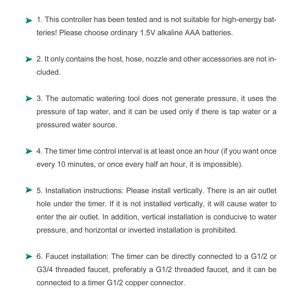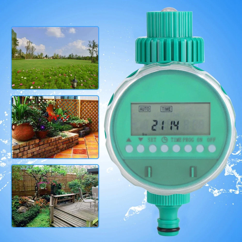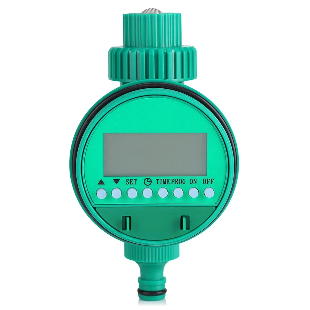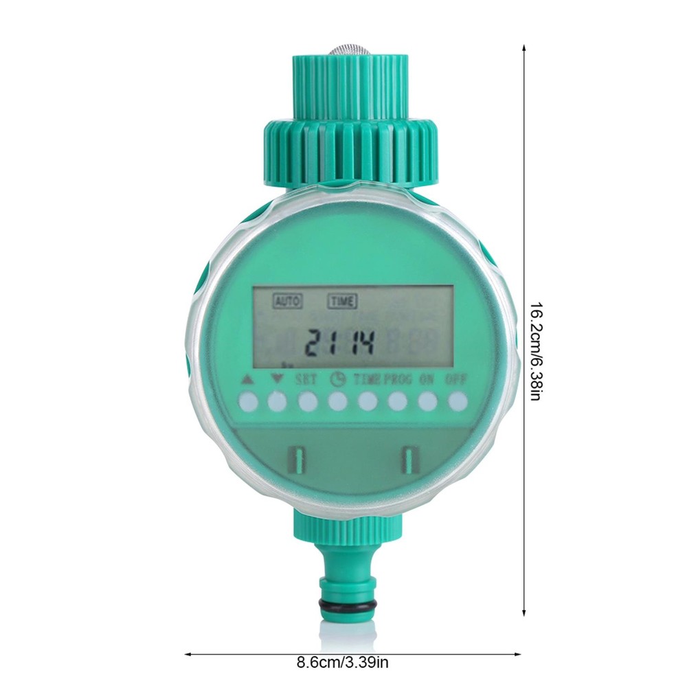 Description: Watering a large area of plant everyday is really tiring. This automatic electronic irrigation timer is of great use for watering home garden planting especially suitable for the people are not at home or too busy to take care of their family garden. Mainly adopts quality plastic, high quality and durable. Intelligent flowers watering timer, the standard clock, you can set the watering for your garden when you are not at home. Very practical and can be applied in your home garden, roof garden, lawn, balcony, courtyard etc. With this irrigation, you can now maximize the efficiency of your irrigation system. Practical product at good price, worth buying. Features: Automatic & intelligent: with a timer, you only need to press the buttons to set the irrigation and it will water the plants on. Multi-functional LCD screen: displays day of the week, hour, minute and programming for easy reference; buttons for easy setting and re-setting. User-friendly: 16 groups of watering can be set per day at most; different programs for your special demands: single and multi program, regular and cycle, program of one day or several days. Versatile use: suitable for the control of irrigation systems in the domestic sector, such as lawn sprinkler, sprinklers, greenhouse and more. Battery powered: only 2 AAA batteries required; not tethered to socket, you can use it any corner in your garden. Specification: Condition: Brand New Material: ABS Color: Green as Picture Batteries: 2 x AAA batteries ( Not included ) Suitable Water Pressure: 0-400KPA Irrigation: shortest 1 min, longest 9 hours 59 min Irrigation Frequency: at least once a day, up to 16 times, and the longest for two days Product Size: Approx. 162 x 86mm / 6.38 x 3.39inch Package Weight: Approx. 280g Package Included: 1 x Irrigation Timer 1 x User Manual Note: 1. Please allow 0-1inch error due to manual measurement. Thanks for your understanding. 2. Monitors are not calibrated same, item color displayed in photos may be showing slightly different from the real object. Please take the real one as standard.