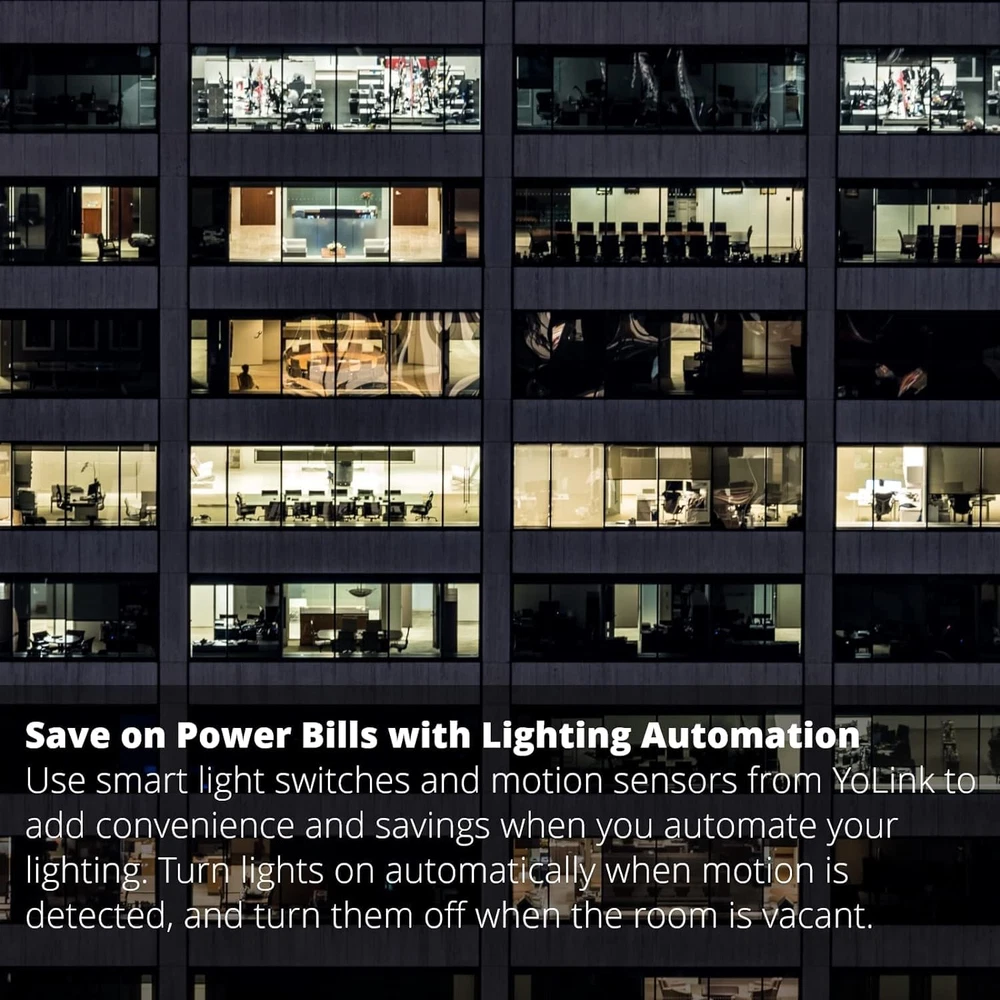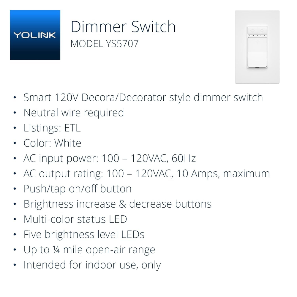 ADD SMART LIGHT DIMMING to your YoLink system! Control and adjust your light brightness from the app, on motion detection (motion sensor not included), doors opening, and on schedules. ADD SAFETY, SECURITY, CONVENIENCE & SAVINGS when you replace your non-smart switches. Turn on lights automatically, hands-free, when you enter a room. Turn them off automatically if the room is empty (YoLink motion sensor not included) REQUIREMENTS: a neutral wire is required, and for full functionality the switch must wirelessly connect to one of our Hubs. An Android phone running version 4.4 or newer, or an Apple phone iOS version 9 or newer is required. WORKS WITH dimmable LED, incandescent, CFL/fluorescent, and halogen bulbs/lights, which can be mixed & matched on the same circuit. 3-WAY operation requires using our Control-D2D device-to-device pairing method between two YoLink Dimmer Switches, which is explained in the user guide. The switch is not compatible with 3-way wiring style, the traveler wire must be abandoned or reused to provide a hot, neutral, ground, and at least one switch leg at each switch. Product Description 1 Introduction 2 Dimensions 3 Long-Range Connectivity 4 Smart Integration 5 Hub Required 1 Installation Step 1 2 Installation Step 2 3 Installation Step 3 4 Installation Step 4 5 Installation Step 5 1 Remote Control & Monitor 2 Dual Button Control 3 Customizable Schedules 4 Precise Timer Functions 5 Automations 1 Overheat Protection 2 Device-to-Device Control 3 Long-Lasting Battery Life 4 Durable Design 1 Low-Power Lighting System 2 Automate Small Appliances 3 Manage Ventilation Fans 4 Enhance Security Lighting 5 Small-Scale Automation 1 App Push 2 Email Notification 3 SMS Notification 4 Device Action 5 Phone Call 1 Expert Support Available 2 Online Resources 3 Raedius Platform