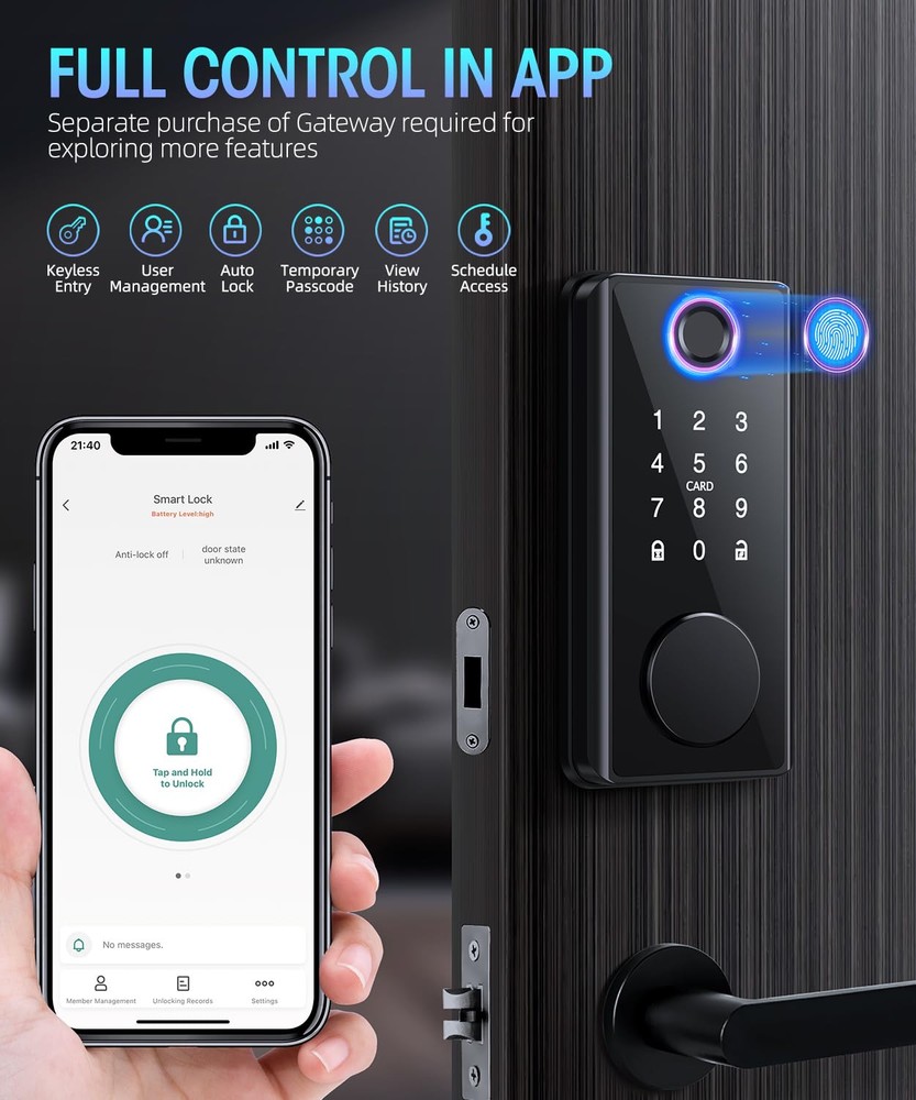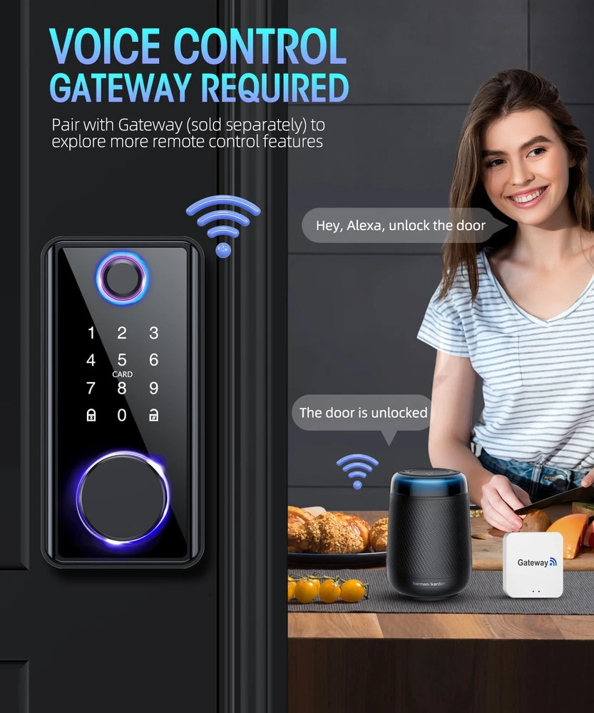 Enhanced Home Security: The Smart Deadbolt Lock provides advanced security features for your front door, keeping your home safe and protected. With its keyless entry door lock technology and seamless integration into any modern smart home setup, you can have peace of mind knowing that only authorized individuals can access your home. Convenient Keyless Entry: Say goodbye to fumbling for keys or worrying about misplaced keys with this deadbolt smart lock. The fingerprint door lock offers a convenient keyless entry solution, allowing you to unlock your front door using a fingerprint, keypad code, or even your smartphone. Experience hassle-free entry every time. Tailored for Front Doors: Designed specifically for front doors, this smart door locks for front door seamlessly blends in with your home's exterior while providing unmatched security. Its sleek and modern design ensures it complements any architectural style, making it the perfect choice for homeowners looking to upgrade their front door locks. Cutting-Edge Technology: Equipped with the latest technology, the electronic door lock is a must-have addition to any smart home. Compatible with various smart home devices, you can control and monitor your lock remotely, receive real-time notifications, and even integrate it with voice assistants for hands-free convenience. Enjoy the benefits of a fully connected home security system. Easy Installation and Versatility: Installing the smart deadbolt is a breeze, thanks to its user-friendly design and clear instructions. Whether you have an exterior wooden or metal door, this deadbolt lock is compatible and can be easily installed. It combines durability, functionality, and sleek aesthetics to provide you with the ultimate door security solution.