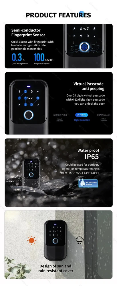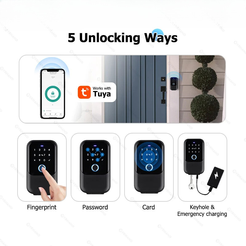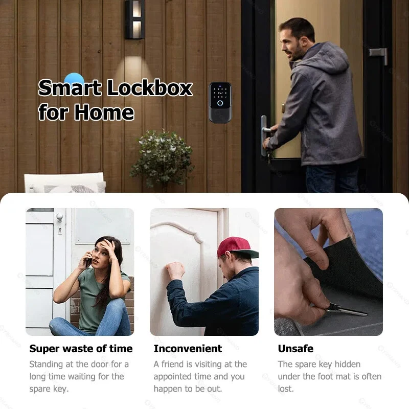 password Smart Fingerprint Digital card Inteligente Tuya BluetoothElectronic Portable IP66 Lock Boxes For Smart home Tuya version and Ttlock version (optional) YRHANG Waterproof Safe Ttlock Code Combination Storage Smart Key Box for House Key Storage Manage access to your property no matter where you are.smart lock boxes offer more control and access logs, so you know exactly who accessed your property and when. Whether you’re a realtor, a rental property manager, or you just want a spare key accessible outside your home, you need a key lock box. This way, you can control exactly who has access to your home. 1.5-in-1 Smart Storage Key Box: Not only bring you security and trust, but also bring you a brand-new smart home. Four ways to unlock your door - APP, Keypad, Fingerprint, IC Card,USB temporary power unlock 2.Smart and Convenient:Provides multiple ways to unlock,control or grant access to others, and track unlock records. Support remote access, no need to be present in person, manage guest access anytime, anywhere. Permanent, one-time, duration, recurring passwords can be set for guests as needed to ensure privacy and security; 3.Long Lasting, Robust and Weatherproof: The material body supports waterproof IP65, and the durable shell can adapt to various bad weathers and maintain stable and trouble-free use; 4.Large Capacity, Designed for Convenience: Tediton Lock Box has large internal space, Bigger than most of the key boxes on the market. Which can easily hold car keys, house cards, and 8-10 keys; 5.Installation:You could hang it exactly where you need like door knob or car.Or you can fix the lock box on the door or wall.Lock box suitable for indoor and outdoor use. About thr Tuya APP About The Ttlock App More product details