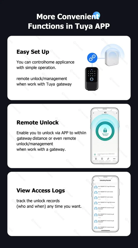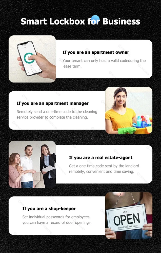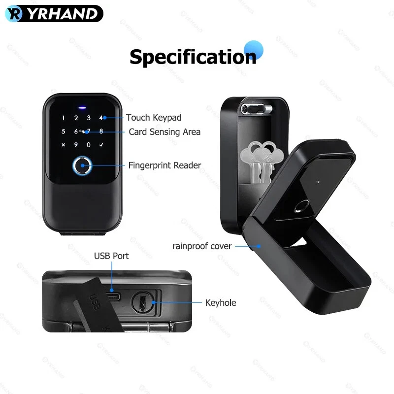TTlock password Smart Fingerprint Digital card Inteligente Tuya BluetoothElectronic Portable IP66 Lock Boxes For Smart home Tuya version and Ttlock version (optional) YRHANG Waterproof Safe Ttlock Code Combination Storage Smart Key Box for House Key Storage Manage access to your property no matter where you are.smart lock boxes offer more control and access logs, so you know exactly who accessed your property and when. Whether you’re a realtor, a rental property manager, or you just want a spare key accessible outside your home, you need a key lock box. This way, you can control exactly who has access to your home. 1.5-in-1 Smart Storage Key Box: Not only bring you security and trust, but also bring you a brand-new smart home. Four ways to unlock your door - APP, Keypad, Fingerprint, IC Card,USB temporary power unlock 2.Smart and Convenient:Provides multiple ways to unlock,control or grant access to others, and track unlock records. Support remote access, no need to be present in person, manage guest access anytime, anywhere. Permanent, one-time, duration, recurring passwords can be set for guests as needed to ensure privacy and security; 3.Long Lasting, Robust and Weatherproof: The material body supports waterproof IP65, and the durable shell can adapt to various bad weathers and maintain stable and trouble-free use; 4.Large Capacity, Designed for Convenience: Tediton Lock Box has large internal space, Bigger than most of the key boxes on the market. Which can easily hold car keys, house cards, and 8-10 keys; 5.Installation:You could hang it exactly where you need like door knob or car.Or you can fix the lock box on the door or wall.Lock box suitable for indoor and outdoor use. About thr Tuya APP About The Ttlock App More product details Feedback and Rewards 1. Dear buyers, your satisfaction and Fsitive feedback is very important to our business development. Please leave rate the details oftransaction (Detailed Seller Ratings) with a "PERFECT 5 STARS" 2. Ifyou are not satisfied with the transaction for ny reason, plese feel free to (ontact us,instead of giving negative feedback or open dispute we will try our best to help you until the problem solvecd