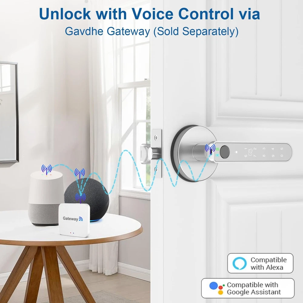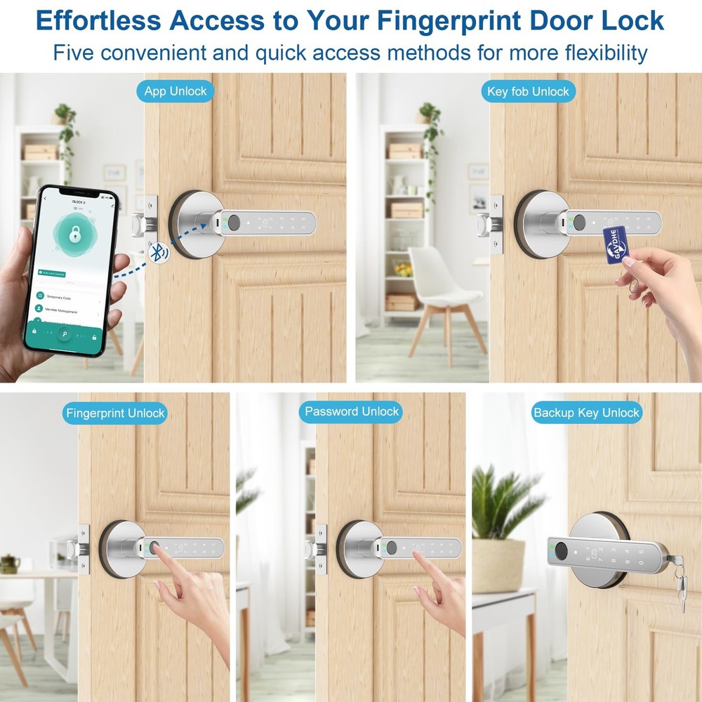 finger print door knob, fingerprint door knob for bedroom, Biometric Door Knob with App Control, door lock fingerprint with Keypad, keyless entry door lock with handle Features: **Material:** Crafted from durable aluminum alloy for long-lasting performance. **Power Supply:** Powered by 4 AAA alkaline batteries (not included). Includes a Type-C port for emergency power supply. **Storage Capacity:** Accommodates up to 100 fingerprints, 100 cards, and 100 codes, providing versatile and secure access options. 1. **Versatile 5-in-1 Access:** Enjoy multiple unlocking options with the fingerprint door lock front door, including app unlock, fingerprint recognition, fob card entry, code entry, and traditional key access. Choose the method that suits you best for enhanced convenience and security. 2. **Advanced Security Features: ** anti-peep code and auto-lock functionality, and app show battery level. The fingerprint bedroom door knob also includes a silent mode. 3. **Effortless Installation:** Upgrade your bedroom door lock easily with our biometric door knob’s straightforward installation process. Designed to fit standard door preparations with included tools and instructions. 4. ** Voice Control:** Pair the thumbprint bedroom door knob with the gateway for intuitive remote and voice control via your smartphone. Manage access, check lock status, and control settings from anywhere. 5. **Flexible Operational Modes:** Adapt the fingerprint door lock app to your needs with passage mode for uninterrupted access and silent mode for quiet entry. Fingerprint Door Lock with Key FOB