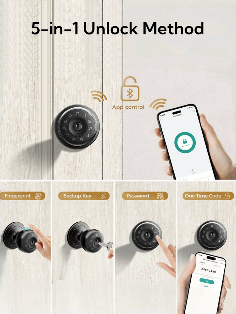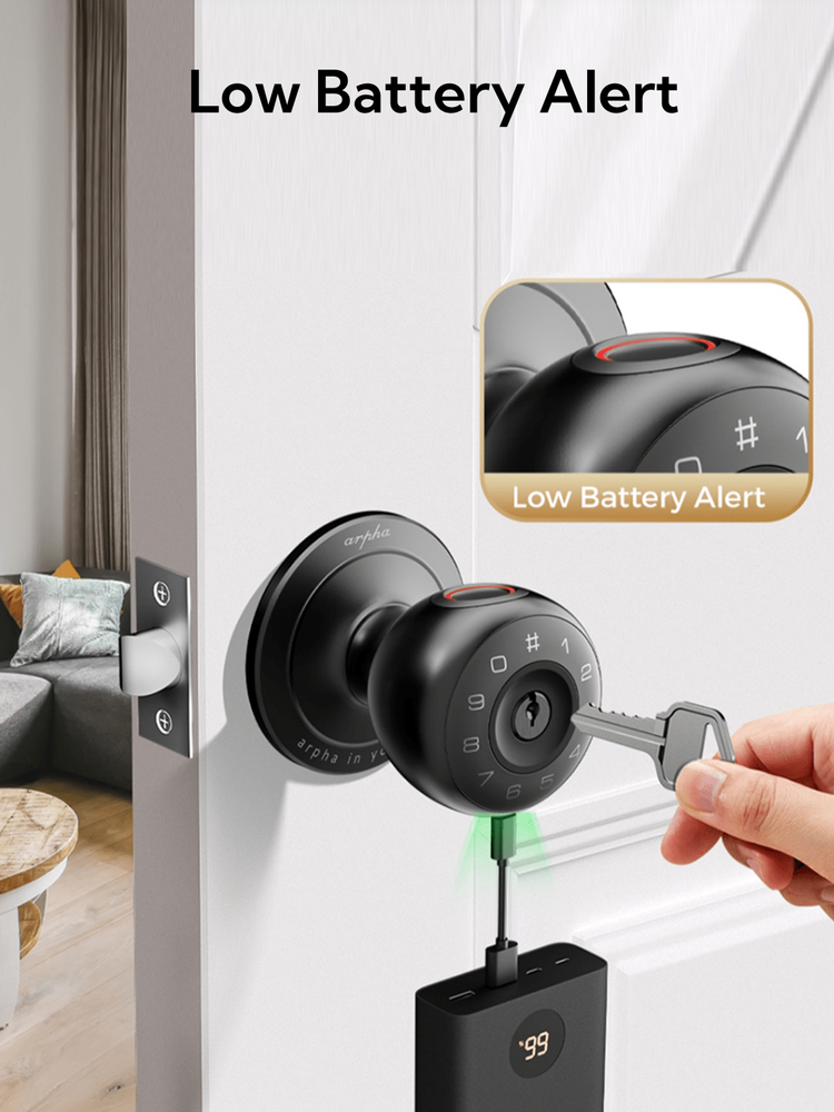 4-IN-1 Unlock Ways: Arpha fingerprint door lock provides 4 unlocking methods, including APP control, fingerprint unlocking, key unlocking, and spare key unlocking. The smart door knob with keypad support 50 fingerprints with 50 passwords, which is very convenient for multi-person households, and the fixed password can use 6-10 digits. App Control: You can set passwords, add fingerprints, temporary password, anti-peep passwords, auto-lock, etc. for this smart door lock on Tuya App. More functionality settings for you to explore! When the door lock is paired with the app, you can lock or unlock the door handle with just one tap. Biometric Fingerprint Unlock: This smart door lock with advanced fingerprint technology allows for 50 sets of codes, which is great for large families. And with a 99.99% recognition rate, this fingerprint door lock can recognise your fingerprint in just 0.3 seconds, allowing you to get in quickly. Smart & Convenient: Backed by advanced technology, this door lock is practical in more ways than one. This lock has an emergency Type-C charging port, you can use the portable power source to charge the lock if it runs out of power indoors. What's more, this smart door lock is adaptable to most weather conditions, whether it's -4°F or +140°F, it will work just fine, and this door lock has an IP54 waterproof rating.