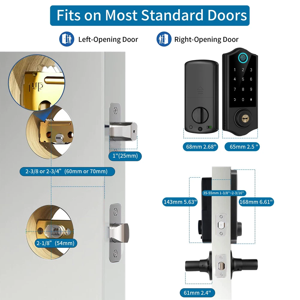 [Advanced App Control] Unlock and manage your door lock with a user-friendly smartphone app, add and remove user codes, access user logs, and website management system. Notice: Paired with gateway (sold separately), you can unlock your keyless entry door lock anywhere anytime. [Auto Lock & One Touch Lock] Access your smart deadbolt lock via App + Fingerprint + 3 IC Cards + Passcode + eKey sharing + Authorized Admin + 2 Physical keys + Thumb turn. Set auto lock in 5-900s and simply press "#" on the keypad for 2 seconds to lock. [Easy Installation] Suitable for American standard left and right-handed doors. Installation could be finished in minutes, includes all necessary hardware and detailed instructions, with no wiring needed. Door thickness range: 1 3/8 inch to 2 3/16 inch 35mm-55mm thick. [Smart Home Integration] With the gateway(sold separately), You can voice control your alexa or google assistant to lock/unlock the lock, remotely access your smart deadbolt lock, receive real-time push notifications, monitor smart door lock status, etc. [Multiple Users & Function] 50 fingerprints, 250 passcodes, 1000 ic cards (3 include). Anti Peeping password keypad, privacy mode, passage mode, silent mode, Anti-wrong password, emergency power port to plug in a temporary power supply.