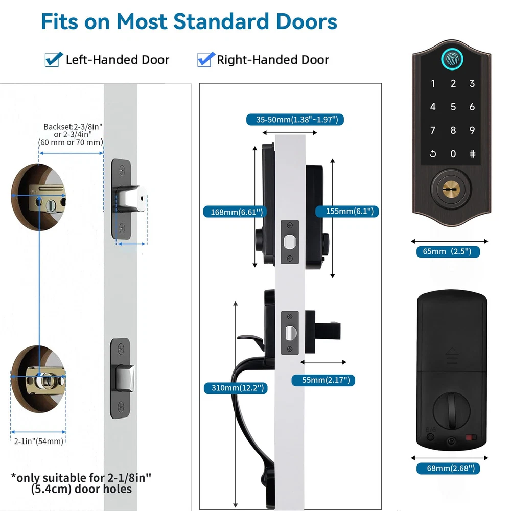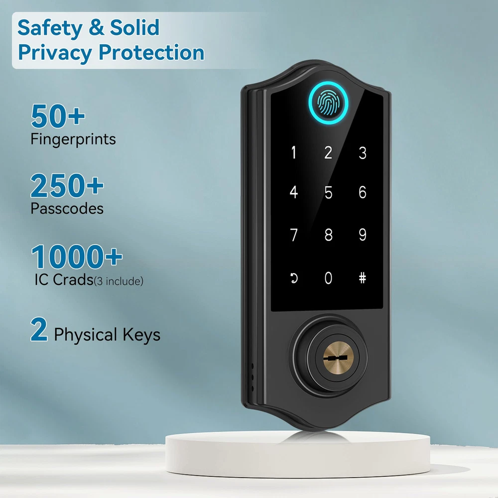 [All in 1 Fingerprint Door Lock] Fingerprints/ App/Passcode/IC Cards/Physical Keys/E-key. Smart deadbolt locks are always ready to protect your home, allowing you to set auto lock between 5~900 seconds or apply 1-touch motorized locking, press # on keypad for 2s to activate one-touch lock. [Biometric Fingerprint Access] Unlock your door instantly with a quick fingerprint scan, offering secure and convenient entry without the need for keys or codes. Never worry about lost, stolen, or copied keys again. [APP Management] You can generate and share one-time, permanent, scheduled, and recurring code to your visitors, manage access rights and view access logs. Keyless lock features 50 fingerprints, 250 passcodes, 1000 ic cards (3 include). [Remotely Control & Voice Control] Pair the keypad lock with Gateway(sold Separately.) You can remotely control via App, you can unlock or lock your door anytime, anywhere, while also working with Alexa/Google Assitant to enable voice control,receive real-time push notifications, monitor smart door lock status, etc. [Enhanced Security] The smart deadbolt features auto-lock, one-touch locking, Anti Peeping password keypad, privacy mode, passage mode, silent mode, Anti-wrong password, emergency power port to plug in for a temporary power supply. [Warm Tips] Door thickness range: 1.38 inch to 1.97 inch 35mm-50mm thick, work with standard wooden, left and right handed doors, great solution for Airbnb rental. Please use 4pcs 1.5V AA dry batteries (No include). Rechargeable batteries are not recommended, because most rechargeable battery's voltage is 1.2V.