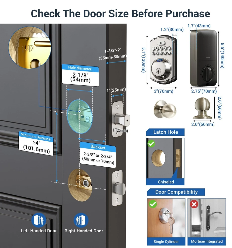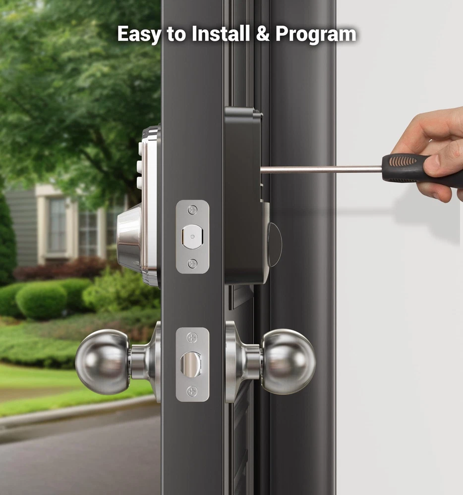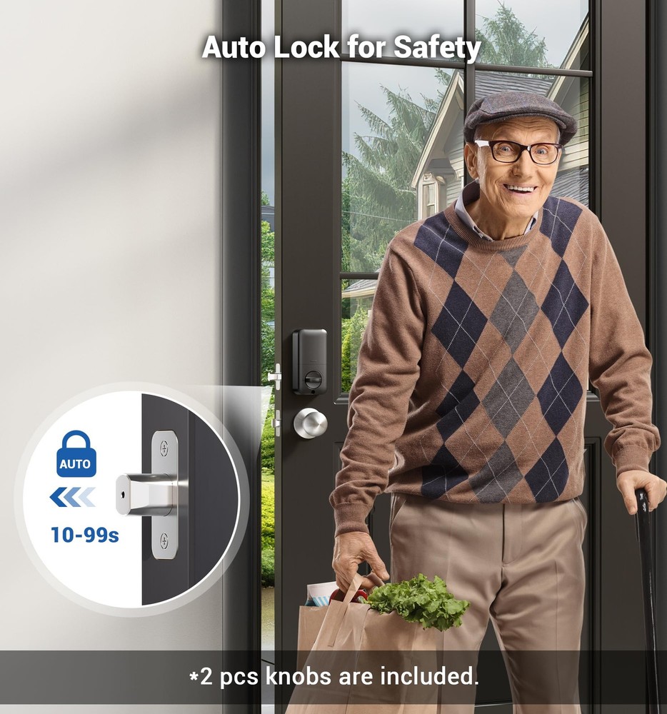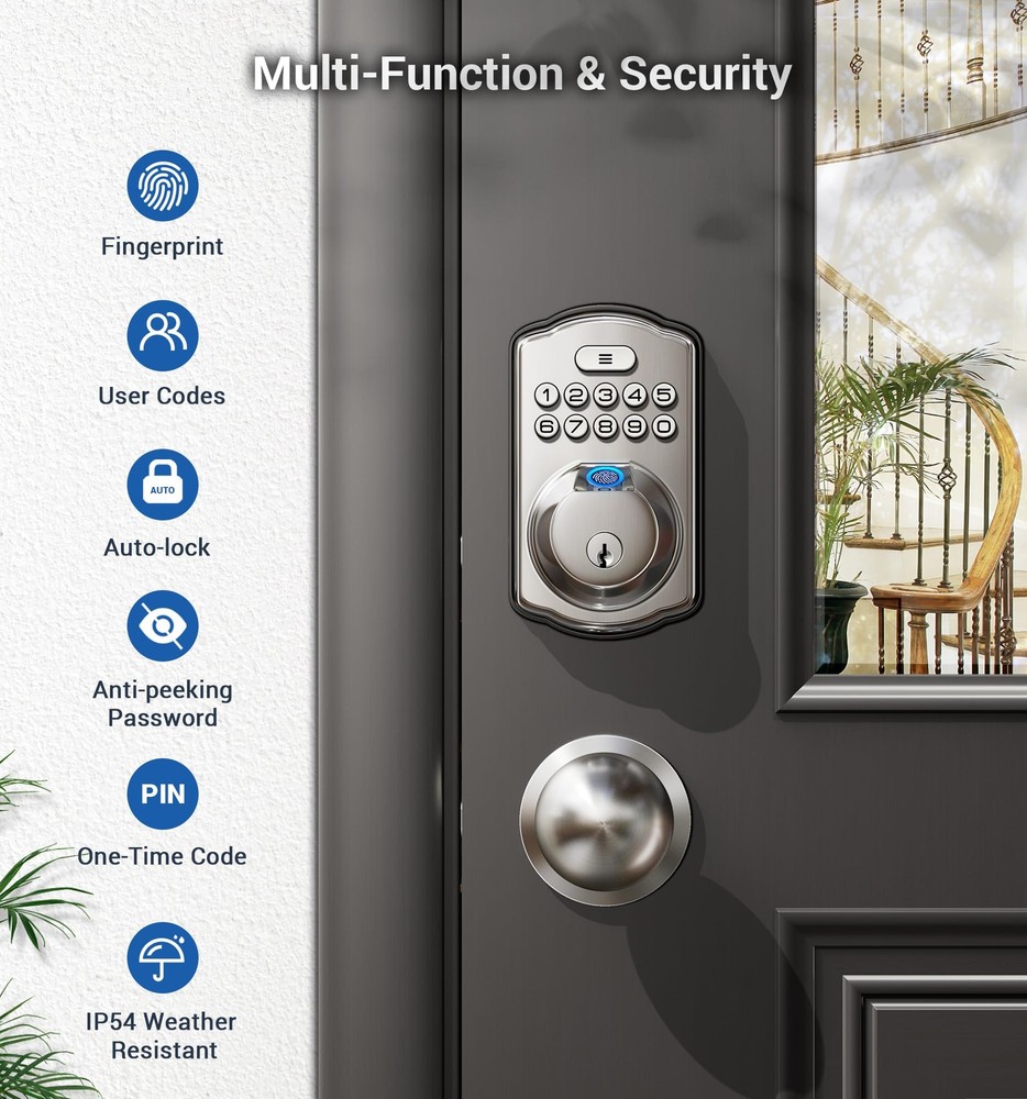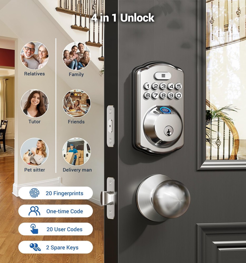 Fingerprint Door Lock recognizes your fingerprint within 0.3 second, and unlocks your door within 1 second. Multiple unlocking methods: Fingerprint + Passcode + Key. Make your life safer and more convenient. Includes all the necessary hardware components you need for an easy installation. Always forget to lock your door? Enable Auto Lock for peace of mind, or quickly lock your door on your way out by pressing and hold any single button for 2 seconds. Low battery indicator Last with 4 AA batteries (not included); Get flashing red lights when batteries are getting low; 2 backup keys are included as well, so you’ll always have access to your home. Support virtual password Enter digits before or after your access code to confuse prying eyes. Back-lit keypad makes the numbers readily visible in the dark with just one touch. Wrong entry code limits Keypad is disabled after 10 incorrect access attempts, to ensure your property secured.; Apply for all kinds of weather Built to work under low and high temperature (-31 °F to 150 °F). Fingerprint Unlock: Identifies your fingerprint within 0.3 seconds and unlocks your door within 1 second, with a 99.99% recognition rate [4-in-1] Unlock: Fingerprints, codes, one-time codes, and keys can all be used to unlock Keypad Door Lock with Handle: Features a fingerprint keypad deadbolt combined with 2 knobs, anti-peeping codes, backlit keypad, low battery alerts, mute mode, and vacation mode Built to Last: The ANSI Grade 3 fingerprint door lock is made with a sturdy lock cylinder and alloy, powered by 4 AA batteries, and lasts for more than 1 year Smart and Convenient: Set the front door lock to "auto lock" in 10-99 seconds, or press any key for 2 seconds to lock the door manually Easy to Install: With just a screwdriver, you can easily finish installation and programming in minutes. It is compatible with all American standard left- and right-handed doors offers online phone support from Monday to Friday 9 AM to 5 PM PST, and 24/7 after-sales email service