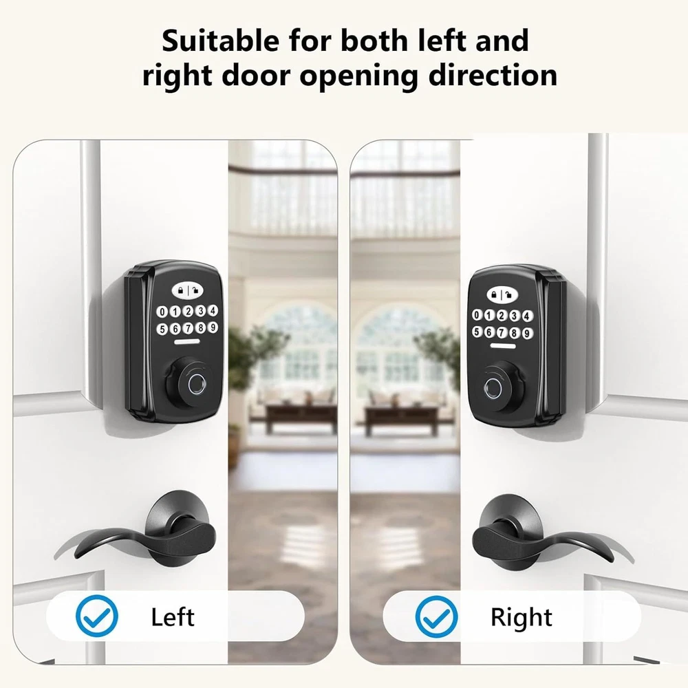 Muti-Function Fingerprint Door Lock - Fingerprints+Passwords+One-time Codes+2 Backup keys+Low battery indicator+Mute mode+Anti-peeping password; Come with keyless entry door lock, 2 Lever Handles, adjustable latch*2, setup assembly kits Keypad Code & Advanced Fingerprint Unlock - Identify your fingerprint within 0.3 seconds and unlocks your door within 1 second with a 99.99% recognition rate. This keypad door lock with handle can be added 100 user codes and 100 fingerprints,provide your family members with unique access codes & fingerprints, and create temporary codes for guests to use Smart Front Door Lock Set Features - Set the automatic electronic door lock to lock in 5-99 seconds, and use the one-touch auto-lock feature by pressing the lock key on the keypad. So you never have to worry about leaving your door unlocked Security and Durability Lock For Door - The keyless entry door lock deadbolt with handle set is made with a sturdy lock cylinder and alloy, Its IP65 rating makes it weather-resistant to keep your front door protected, no matter rain or shine. Easy To Install - Just with a screwdriver can easily finish installation and program by yourself in minutes, our keyless entry door lock with handle is compatible with all American standard left and right-handed doors