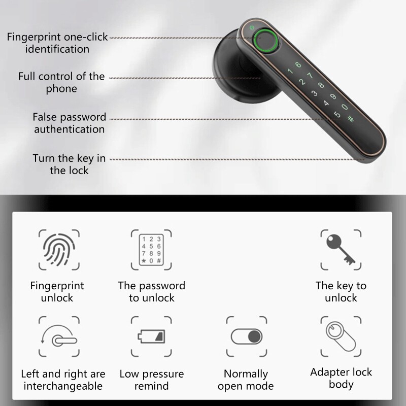 Features: brand new and high quality for SMART INTERIOR DOOR-LOCK. Multiple unlock methods: fingerprint unlock, passwords unlock, and for key unlock. A kind of modern technological lifestyle, providing you more security and convenience. Widely used for home, office, homestay, apartment, B&B, hotel, and more. LEFT & RIGHT AVAILABLE. Both left handed and right handled doors are available. Easy to install in minutes. NO Wiring or NO Drilling required. Fit for majority interior doors of apartment, bedroom door, entry doors, homestay gates. BACK-UP for KEY INCLUDED. Package contains: pair fingerprint lock; mouting 2 mechanical keys; user manual. High quality alloy doorlock, rust-proof, designed to last. ANTI-PEEP You can set 2 groups of virtual passwords before and after the right password, in for case of peeping. Upgraded designed, 360° full direction identification function of dry, wet and incomplete fingerprints. HIGH Low porwer alarm. Usb is for incident happened that the for smart lock was power off, while it can be recharged by power-bank inmmediately. 4 gears sound volumes adjustable. The mute is for not disturbing your family when come back at midnight. Specifications: Color: Black Passsord: 100 Groups Fingerprint: 50 Fingerprints Recognising Time: 0.1s Language Support: Chinese; English; French; Spanish; Thai, Indonesian Power Supply: USB Charging Bettery: 4 x AAA Batteries (Not Included) Low Current <150ma Low Alarm: 4.3V Current: <30Ua 6V Size: Approx. 14.6x6.4cm/5.74x2.51in Handle Width: Approx. 2.8cm/1.1in Material: Alloy Weight: Approx. 900g Package Includes: Set Fingerprint Door Lock note: NOTICE: 4 AAA Batteries are not included in the package! Please allow 0-1cm error due to manual measurement. pls make sure you do not mind before you bid. Due to the difference between different monitors, the picture may not reflect the actual color of the item. Thank you!