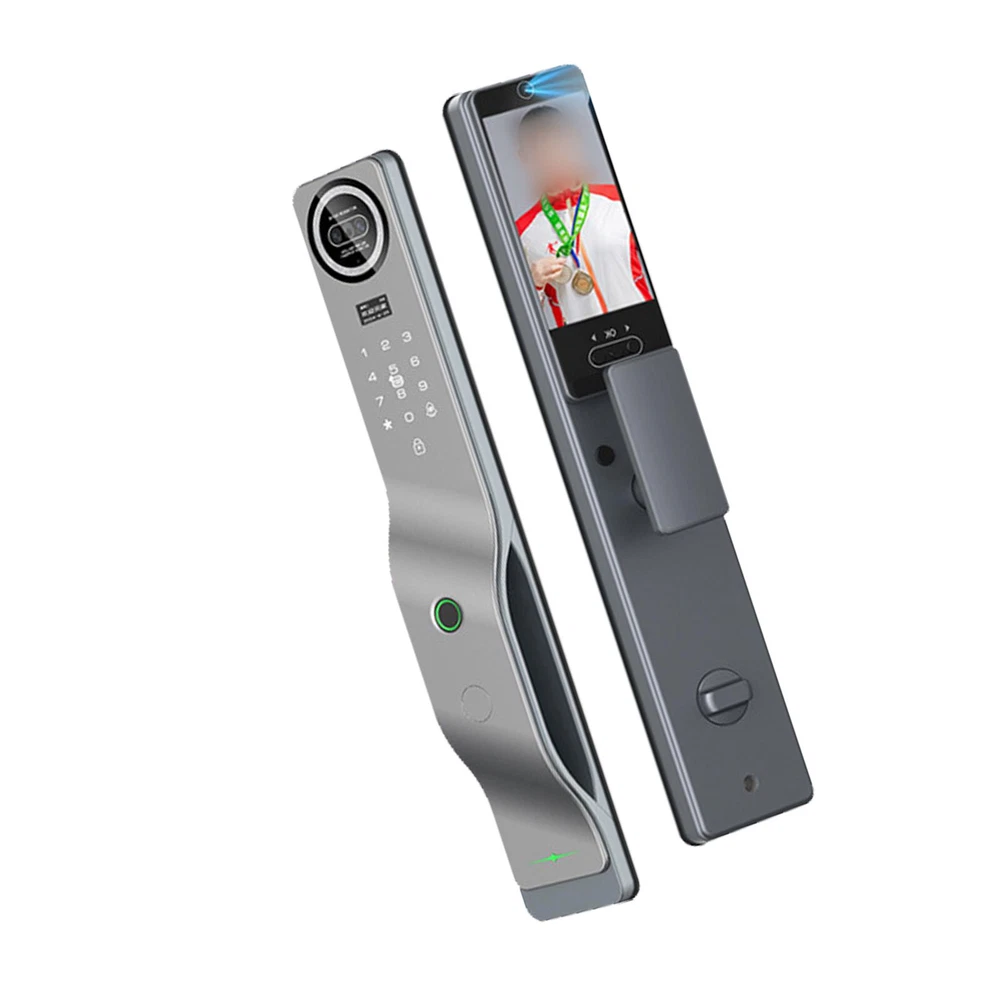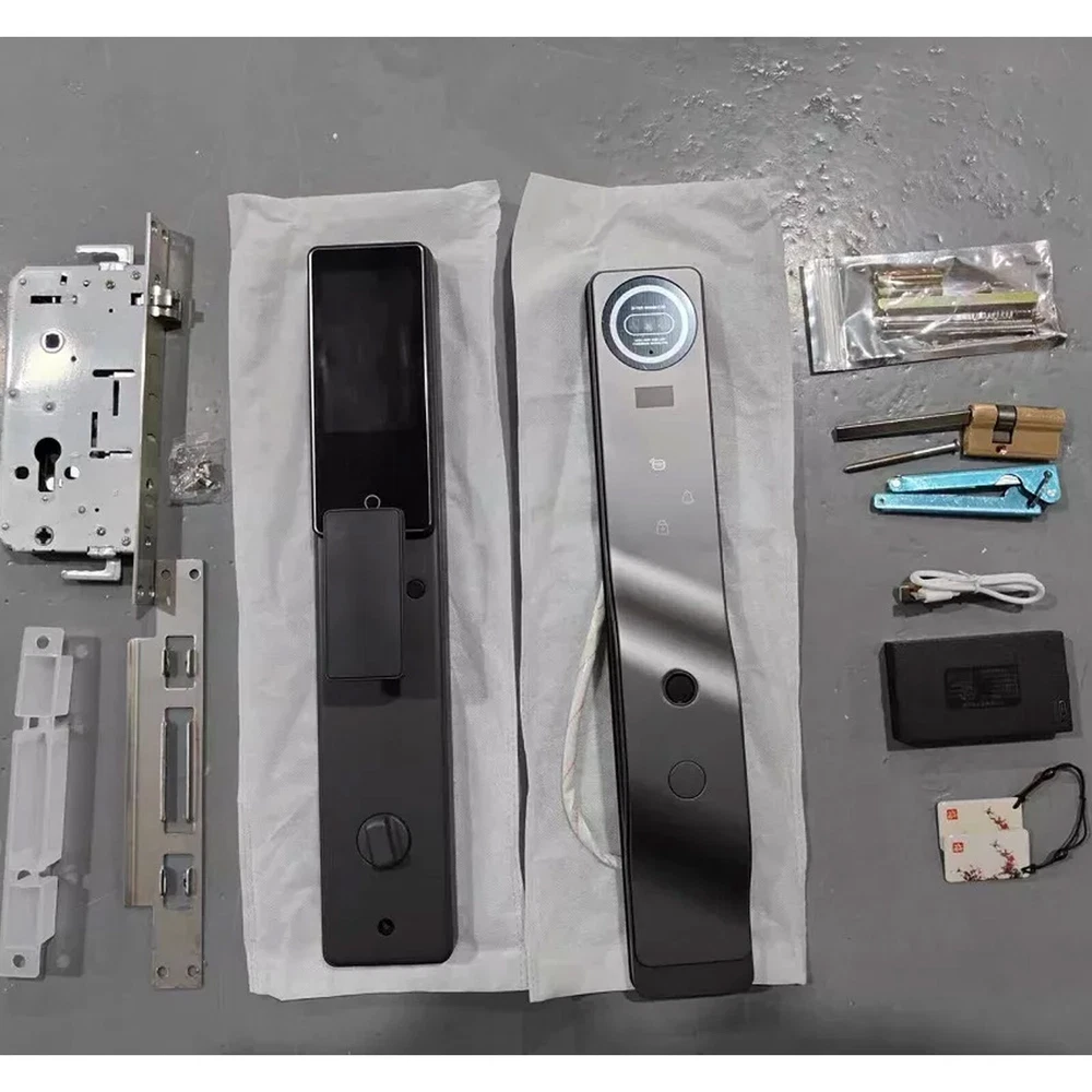 Built-in battery: 7.4V 4200mAH Tuya app Wi-Fi version 3d face Intelligent Wifi Digital Smart Lock Fingerprint Visual Intercom Palm Vein Recognition security door lock. Upgrade your home security with the Smart Door Lock featuring 3D face recognition, palm vein, fingerprint, and password options. Made of durable Aluminium alloy in a sleek silver gray finish, this modern lock is suitable for front door and residential interiors. Easy to install with universal mounting for both left and right doors, this lock comes with all fixings supplied including door handle set, IC card, lithium battery, lock body and lock cylinder. The high-tech features and user-friendly design make this security lock a necessary part for home, office or apartment. Product Parameters Lock body(mortise): 6068 mortise Material:aluminum alloy Color: Star gray Motor :super-large torgue special motor Battery:4200 mAh special lithium battery Unlock method: Palmar vein,face recognition, fingerprint,password,swipe card, mobile phone remote, mechanical key Feature functions: watch ousting in real-time, active two way intercom, doorbell reminder, anti-prizing alarm, indoor peepholescreen, fast open, automatic self lock function Power supply: DC(7.4V lithium battery) static current: <70 micro-ampere Fingerprint capacity:100 Operating temperature:-10°C-60°C Passwords capacity:100 Relative humidity:20%--93% Cards capacity: 100 Emergency power supply: USB Administrators capacity: 10 Lock core level: C Suitable for door thickness:40-120MM Package including 6068 lock body.