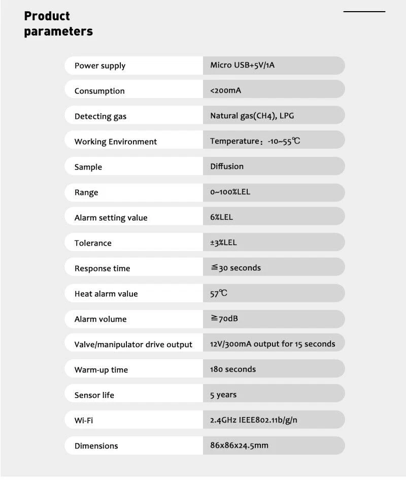 Product Description Description: 1.Detectable Gas:The natural gas leak detector detects the main deadly gases: Natural gas (Methane, butane, ethane, LNG, etc) and Propane (LPG or liquefied petroleum gas). 2.On-site Alarm and APP Remote Alarm:This gas alarm can be connected with mobile phone APP in a wireless environment. After connection, you can always receive the information of the alarm when you go out and once the alarm occurs. 3.High Precision:The has an LCD screen that displays precise, real-time gas readings so that you know the exact gas concentration in the air of your home at all times. 4.Installation Location:This propane alarm has an long 6 foot power cord which allows you to install it in the exact ideal location in your house to allow for proper gas detection. Screw fix or paste installation. 5.Stylish Appearance:This newly released natural gas alarm is sleek and modern and has a beautiful blue LCD screen that will complement the style of your home or camper without detracting from your interior design. How to connect to the app 1. Download tuya smart app 2. One minute after plugging in the power, use the card pin to press and hold the pairing button, the green light flashes to enter the pairing mode. 3. Add devices in the App 4. Pairing is successful Specifications: Power supply:Micro USB+5V/1A Consumption:<200mA Detecting gas:Natural gas(CH4), LPG Working Environment:Temperature:-10~55℃ Sample:Diffusion Range:0-100% LEL Alarm setting value:6% LEL Tolerance:±3% LEL Response time:≤ 30 seconds Heat alarm value:57℃ Alarm volume:≥70db Valve/manipulator drive output:12/300MA output for 15 seconds Warm-up time:180 seconds Sensor life:5 years Wifi:2.4GHZ IEEE802.11b/g/n Dimensions:86X86X24.5mm Package Included: 1*Gas detector 1*USB cable 1*Power plug 1*User Manual On Sep 30, 2024 at 00:13:37 PDT, seller added the following information: On Oct 2, 2024 at 07:26:05 PDT, seller added the following information: Shipping Returns Payment Contact US Items are generally shipped out in 1-3 business day after your payment has been cleared (Sat. & Sun. excluded.) Orders from the United States Warehouse will be shipped out via USPS or UPS. The shipment usually takes 2-5 business days(Saturday and Sun day excluded), if you need the item urgently, please contact us for detail before purchasing. Local pick up is not available. Orders from China will be shipped via EDIS or China Post.The shipment will take 10-15 working days to US,take 20-35 working days to other countries,part of countries will take more days,please contact us if you didn't get the parcel for a long time. You have 60 days to return it from the date it was received. All returned items must be in the original package and you must provide us with the shipping tracking number,specific reason for the return and your ebay ID. We will refund your full winning bid amount , upo n receipt of the item in its original condition and package with all components and accessories included. Import duties,taxes and charge are not included in the item's price or shipping cost.These charges are the buyer's responsibility. Please check with your country's customs office to determine what these additional costs will be prior to bidding or buying. Insurance is included in the Shipping & Handling costs paid. Dear buyers,we appreciate your business, if you are satisfied with our service , please leave us a Positive feedback and rate the details of the transaction (Detailed Seller Ratings) with a "Pefect Stars ". We aim to provide best services and products in exchange your maximum statifaction. We will do our best to resolve your issue till your satisfaction. All emails will be answered within 24 hours except weekends and holidays. Shipping Items are generally shipped out in 1-3 business day after your payment has been cleared (Sat. & Sun. excluded.) Orders from the United States Warehouse will be shipped out via USPS or UPS. The shipment usually takes 2-5 business days(Saturday and Sun day excluded), if you need the item urgently, please contact us for detail before purchasing. Local pick up is not available. Orders from China will be shipped via EDIS or China Post.The shipment will take 10-15 working days to US,take 20-35 working days to other countries,part of countries will take more days,please contact us if you didn't get the parcel for a long time. Returns You have 60 days to return it from the date it was received. All returned items must be in the original package and you must provide us with the shipping tracking number,specific reason for the return and your ebay ID. We will refund your full winning bid amount , upo n receipt of the item in its original condition and package with all components and accessories included. Payment Import duties,taxes and charge are not included in the item's price or shipping cost.These charges are the buyer's responsibility. Please check with your country's customs office to determine what these additional costs will be prior to bidding or buying. Insurance is included in the Shipping & Handling costs paid. Contact US Dear buyers,we appreciate your business, if you are satisfied with our service , please leave us a Positive feedback and rate the details of the transaction (Detailed Seller Ratings) with a "Pefect Stars ". We aim to provide best services and products in exchange your maximum statifaction. We will do our best to resolve your issue till your satisfaction. All emails will be answered within 24 hours except weekends and holidays. You may also like Adjustable Radius Flex Longboard Sanding File Block Hand Grinder For Car & Home 22.99 USD 25.54 USD Free shipping 10% off Paquete De 3 Pantis De Encaje Sexy Para Mujer Ropa Interior Tangas Bikinis Moda 14.98 USD 16.65 USD Free shipping 10% off 2024 New C138 RC Helicopter Optical Flow Location 6 Channel Drone Helicopter 128.99 USD 143.32 USD Free shipping 10% off 10PCS New Battery Cable For Dell Latitude 7400 E7400 EDC40 DC02003AW00 0VVFNX 27.99 USD 