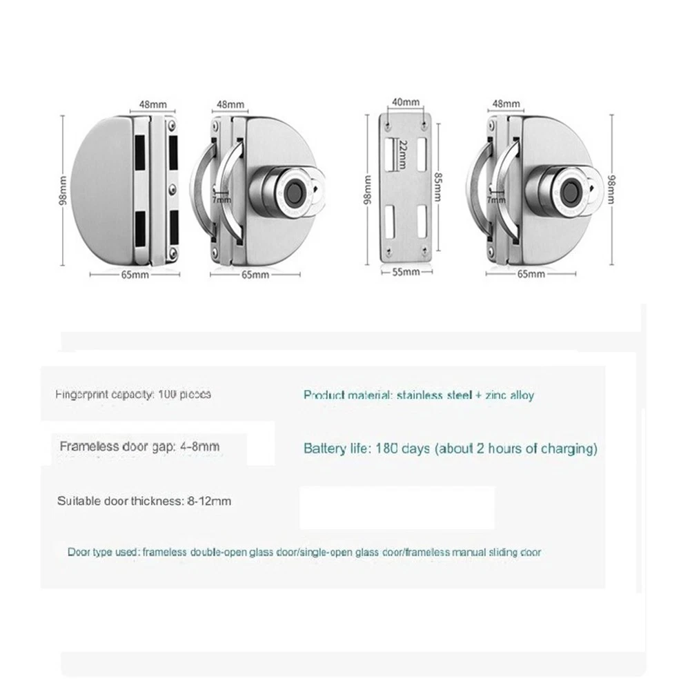 Product Description Features: *Fingerprint recognition technology: This intelligent electronic lock features advanced fingerprint recognition technology, providing a secure and convenient way to for Unlock your glass door. *Suitable for single and double doors: Whether you have a single glass door or a double sliding door, this lock is designed to fit perfectly. Its versatile design makes it suitable for various types of doors in residences, offices, and shops. *Easy installation: Installing this glass door lock is a breeze. It comes with the necessary mounting hardware and a user-friendly manual, allowing you to quickly and effortlessly set it up on your door. *Multiple access options: In addition to fingerprint recognition, this electronic lock offers mechanical key. You can choose the most convenient and secure method to for Unlock your door. * and reliable: Made from high-quality materials, this glass door lock is built to last. It is resistant to wear and tear, long-term reliability and performance. You can trust that your door is securely locked with this intelligent electronic lock. Specifications: *Product Name:Fingerp rint Glass Door Lock Intelligent Electronic Lock *Material: Stainless steel + zinc alloy *Size: Show as the picture *Color: Silve r Single door : side glass and side wall Double door: Both sides are made of glass for Unlock method: fingerprint/-compatible/app/ key APP:OKLOCK Batteries included: Yes Suitable for 8-12mm glass doors Features: -compatible unlocking, fingerprint unlocking, can store 100 fingerprints with mechanical key unlocking (equipped with keys) It takes about 2 hours to charge and has a battery life of 180 days. Package Content: * Glass Door Ele ctronic Lock( with key) * Data cable * Manual Note: . The real color of the item may be slightly different from the pictures shown on website caused by many factors such as brightness of your monitor and light brightness. 2. Please allow slight manual measurement deviation for the data. Payment Payment must be completed within 5 days. If you have any problems about payment, please contact us via message. Delivery details We only ship to confirmed Order addresses. Please comfirm that your Order address is in line with your shipping address. Please kindly note that the c ombined shipping is not provided because the shipping fee is calculated by weight. Also, the each additional item means exactly the the same color and size. It takes about 7 -15 working days to US; about 10-30 working days to other countries. for TRANSIT time may be a little delayed because of the bad weather and customs inspection . If you do not receive your item within 30 working days since payment finished, please contact us immediately for further assistance. Contact us We strive for 100% customer satisfaction! Positive is very important to us. If you have any questions, p lease feel to contact us via "Ask seller a question" . We will reply your email within 24 working hours.
