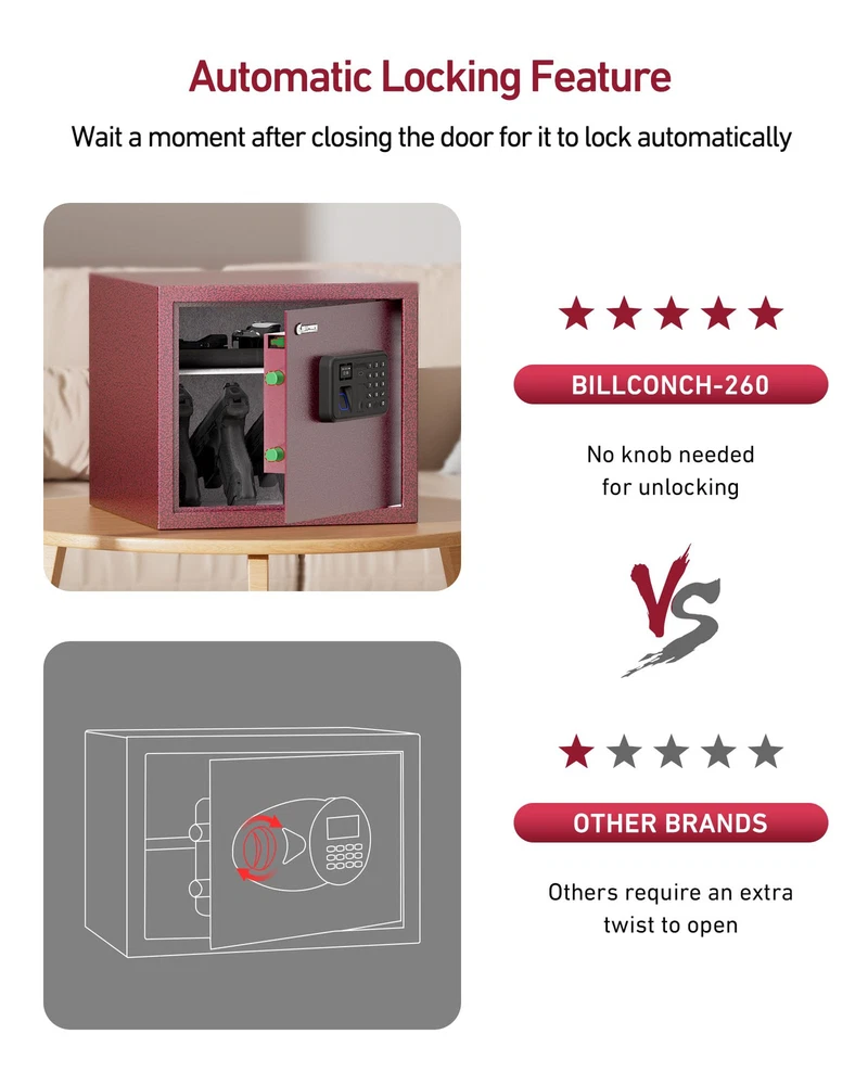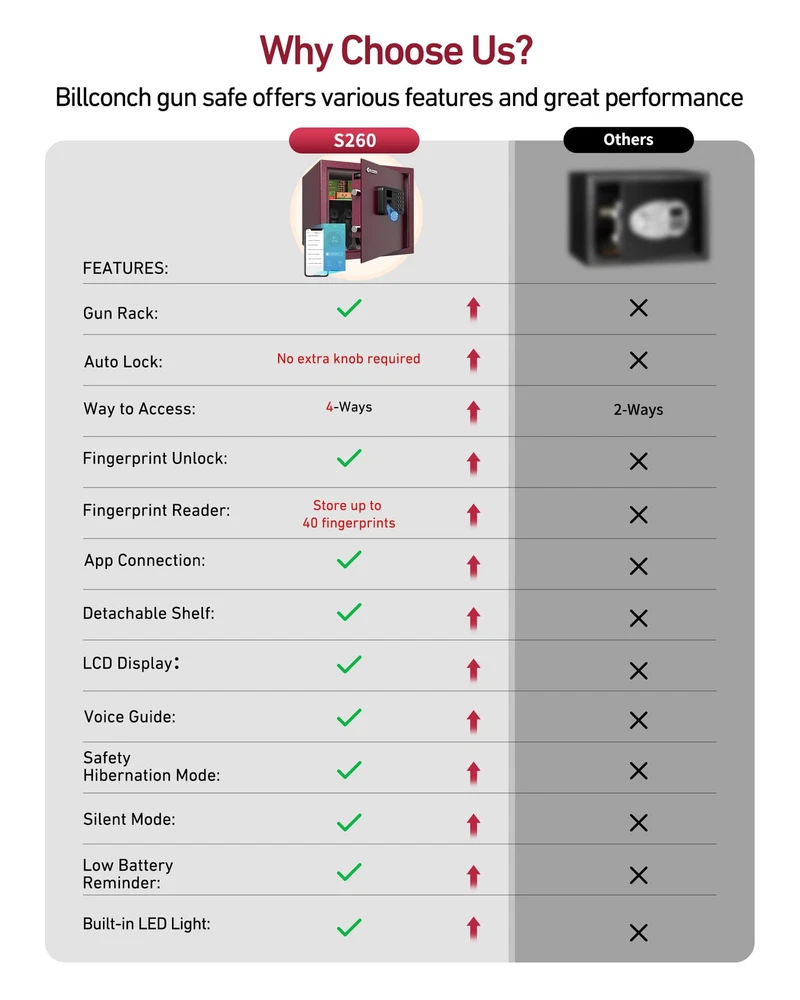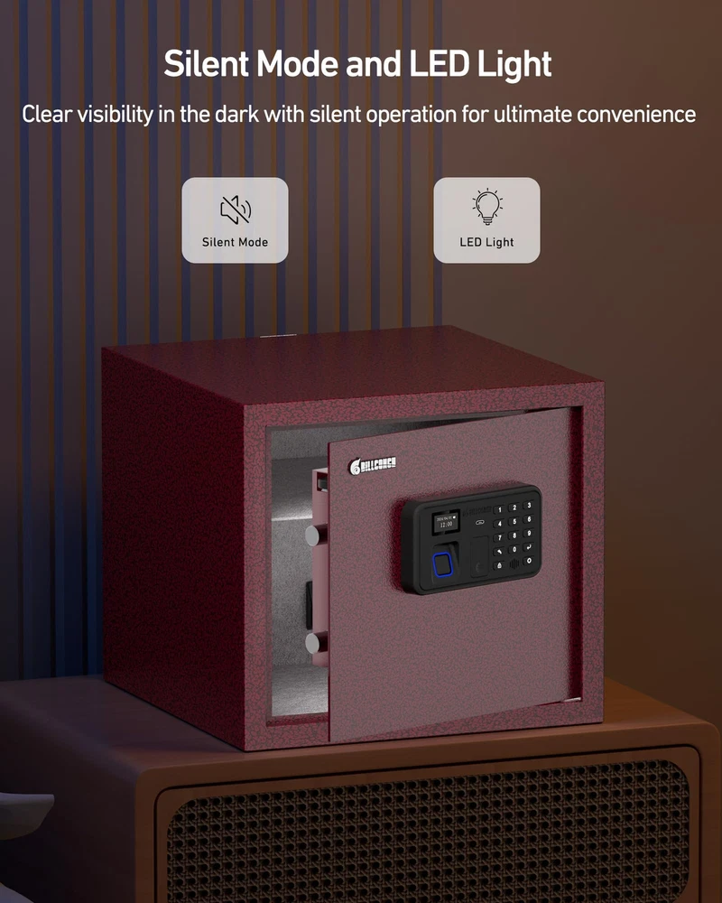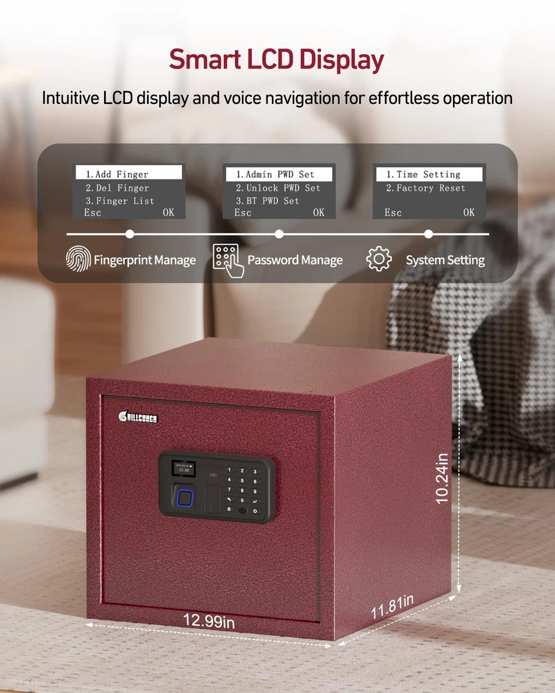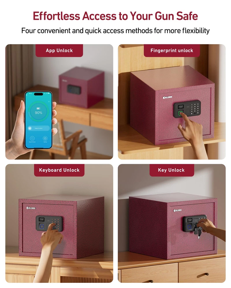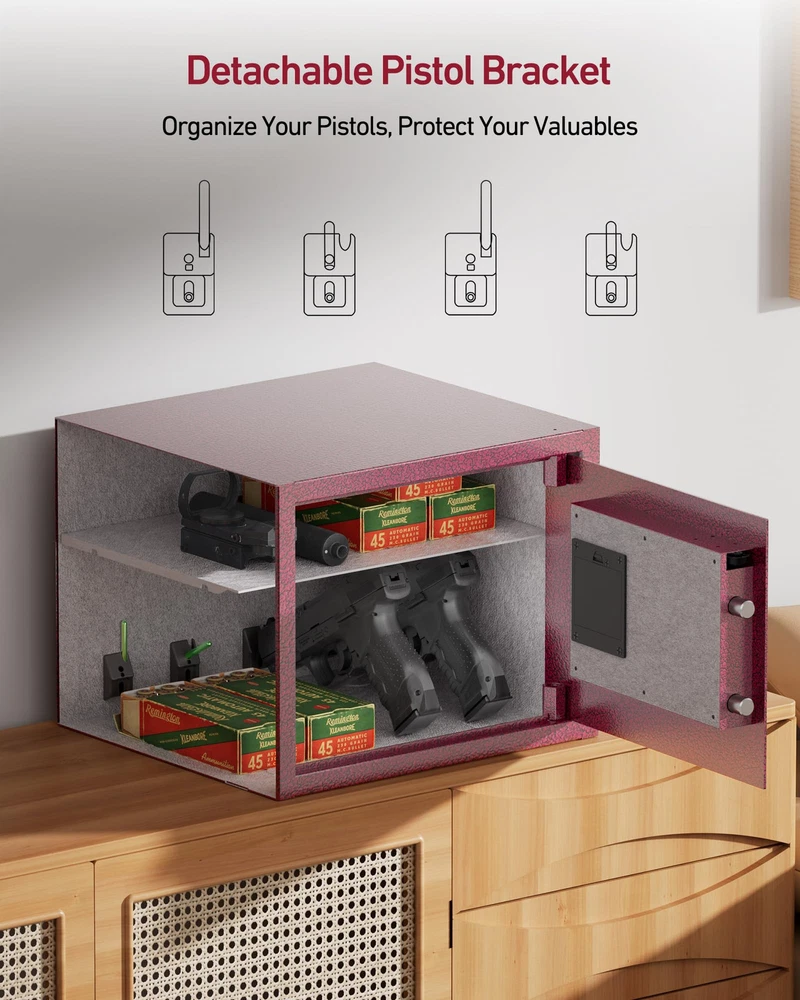 【Unique Pistol Bracket Design】This fingerprint gun safe can easily store 4 pistols and other precious items. You can scientifically and safely to store your pistols, protect your children,The support bar which holds guns can be unscrewed and put to the hole at the side of the pistol bracket base to save space. 【Fast Auto-Locking Door】Smart switch lock. If you have the correct password or fingerprint, gun cabinet will automatically open and does not require other operations. Gun case locks will automatically lock the door as long as you close the door. Built-in automatic LED lighting allows users to easily access the safe handgun in darkness. Let you get the gun quickly when you are in danger. 【Smartphone App】 Innovatively developed smartphone app allowed you to make simple, easy to pleasure on your mobile phone, set up management authority and passwords, and view unlock records, so that you can set the gun lock as simple as play the phone. 【Voice Guide and LCD screen of smart UI interface】This pistol safe has LCD screen of smart UI interface and voice guide function, so that you can set security or use it more conveniently as it set the mobile phone interface. If you don't like the voice mode, you can also set it as a silent mode as needed. 【The large space design and the strong steel structure】The large space design can safely accommodate 4 pistols, passports, cash, The main housing structures are made of high tensile strength cold-rolled steel with a powder coating for corrosion protection, for living Room Bedroom Cloakroom Office and RV.