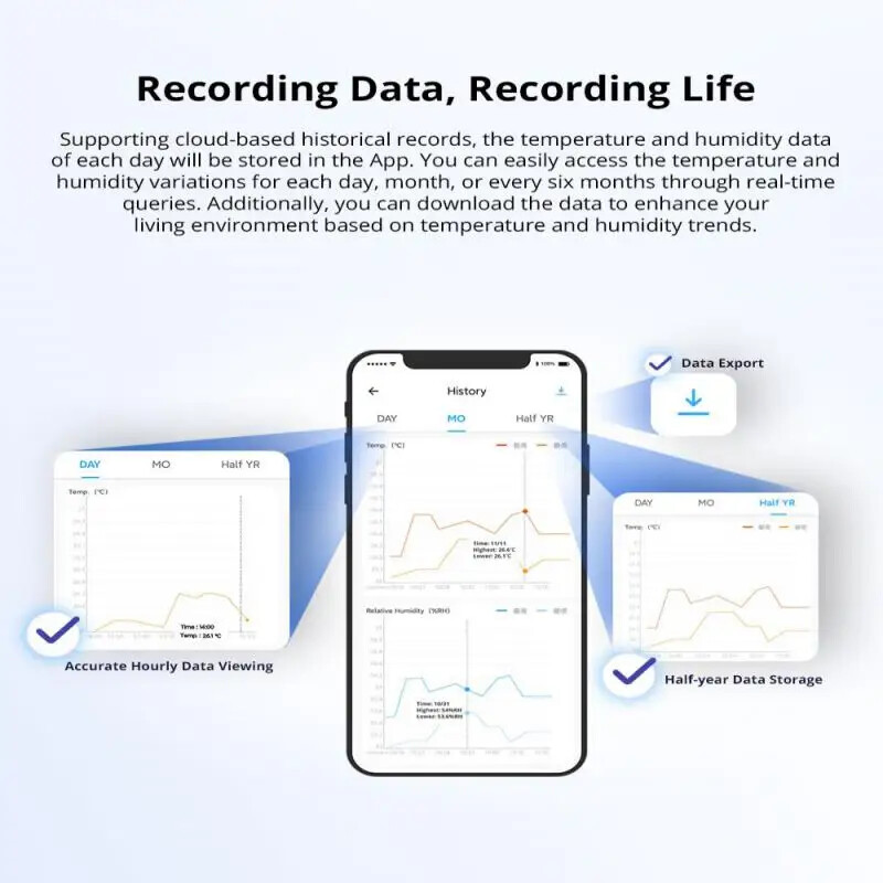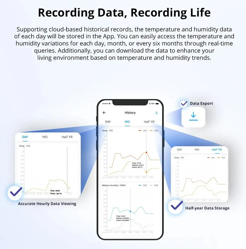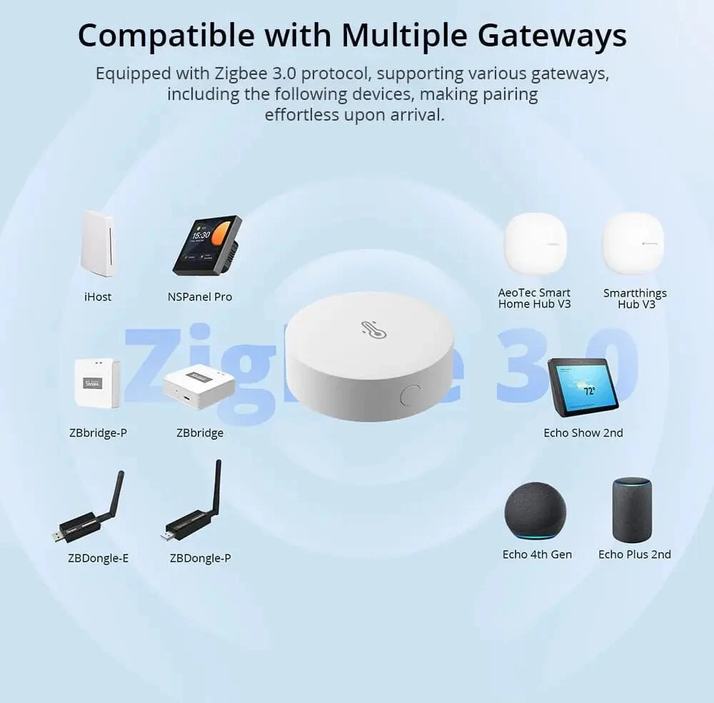 SNZB-02P Zigbee Temperature Humidity Sensor Smart Home Works with SONOFF iHost, NSPanel Pro, ZB Bridge Pro, ZBDongle-E Description: Model:SNZB-02P Working temperature:-10°C~60°C Wireless connection:zigbee 3.0 Product dimension:45x45x17.7mm Battery model:CR2477 Casing material:PC Specifications: SNZB-02P is an upgraded version of SNZB-02, it is a temperature and humidity sensor with low power consumption. Equipped with Zigbee 3.0 protocol, supporting various gateways, including SONOFF Zigbee 3.0 gateways like SONOFF iHost , NSPanel Pro , ZB Bridge Pro , and ZBDongle-E , Alexa with Built-in Zigbee Hub, etc. High accuracy built-in Swiss-made sensor ensures accurate measurement of room temperature and humidity, the temperature is accurate up to ±0.2℃ while the humidity is ±2%RH, data is updated every 5s, and always gives you the latest changes in the environment. You can set the comfort alert, when the room temperature or humidity exceeds your set comfort range, you will receive immediate notifications on your phone, helping you maintain room comfort and ensuring life quality. Supporting cloud-based historical records, the temperature and humidity data of each day will be stored in the App. You can easily access the temperature and humidity variations for each day, month, or every six months through real-time queries. Additionally, you can download the data to enhance your living environment based on temperature and humidity trends. SNZB-02P supports 3 mounting methods, stick with 3M Adhesive, stick with 3M Adhesive and Metal Plate, or screw mount, just place the sensor anywhere you wish such as the living room, baby room, bedroom, greenhouse, reptiles terrarium, equipment cabinet to monitor temperature and humidity remotely. Package Included: Sensor*1 User manual*1