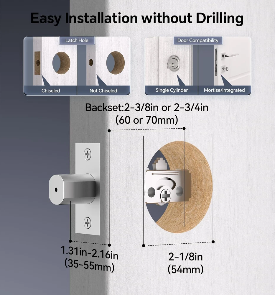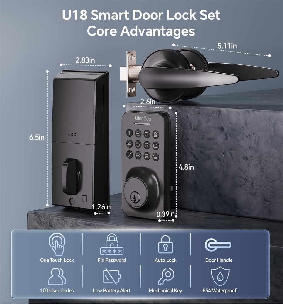 Keyless Entry Door Lock Deadbolt with Handle Set, Keypad Door Lock with Handle Smart Door Locks for Front Door with Set Code Door Lock with Easy Installation, Auto Lock, Matte Black Keyless Entry Deadbolt with Handle Set: smart keyless entry door lock supports multiple ways to access, 100 user codes (97 users and 3 admin passcodes), one- time code, 2 backup keys. Everything you need in 1 safe and secure smart lock. Smart Access Management: Front door lock set keyless entry with handle are 3 administrators and 97 user codes. Generate and share one-time, permanent and scheduled codes with your family,house sitters, guests. Perfect for homes, Airbnb, apartments, offices, and hotel. Auto-Lock Convenience: Digital door locks for front door is designed with a smart one-touch switch. Keypad door lock offers one-touch lock feature to control the door easily. You can enable the auto-lock feature and set the timer from 10s-30s! Besides, there is a “one-touch lock” function on the rear lock body, making it convenient for you to lock and unlock in a timely manner. Now you don't need to worry about forgetting to lock the door. Safeguard Home Security: Keypad door lock with handle equipped with auto-lock, one-touch locking, anti-peeping code, low battery alert to enhance your home security. Additionally, the lock is powered with 4 AA batteries (not included) could be used for around 180 days without frequent battery . Our door lock is built to withstand extreme temperatures (-4℉ to 140℉) and is IP54 waterproof. It's an essential tool for your home. Easy to Install: The door locks for front door no extra drilling and costly locksmith required, just use a screwdriver to easily install and program the door lock in 15 minutes. It is compatible with left and right-hand doors.