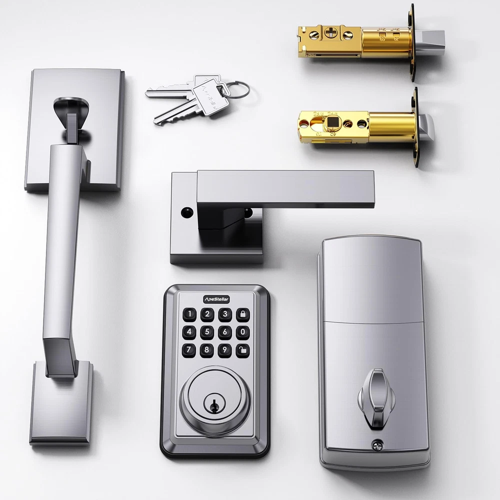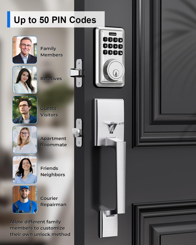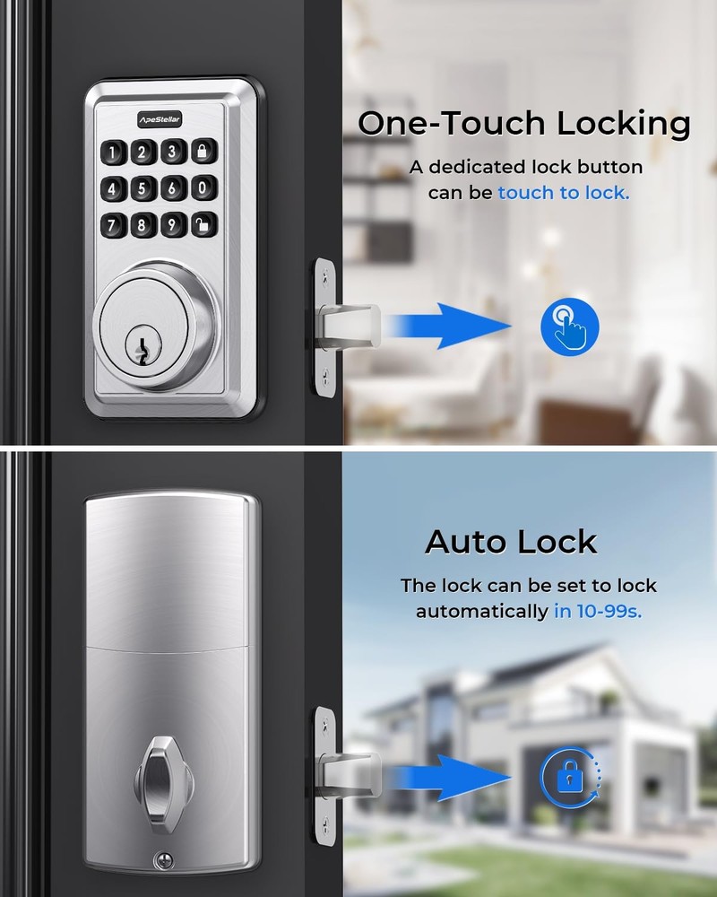 keyless door lock Keyless Entry Door Lock Deadbolt with Handle Set: smart door lock can create 50 passcodes for family daily use along with temporary one-time passcodes, for visitors, service personnel or other single-use entry. Security Front Door Lock Set: This electronic door lock with code is made of heavy zinc alloy instead of light weigh aluminum alloy, with strong motor, stable structure, sturdy cylinder, IP54 weather resistance, keypad deadbolt and handle with high-quality is certified ANSI Grade 3, for use on exterior door lock set where keyed entry and security is needed. Auto Lock & One Touch Lock: Featured anti-peep code protection and backlit keypad, our front door lock set with keypad can customizable automatic door locking after 5-900 seconds. Also a dedicated lock button can be one-touch lock. Friendly for elderly and kids. Keypad Door Lock with Handle: A deadbolt combined with front door handle and lever, featuring wrong code attempt limit, vacation mode, mute mode, low battery warning and excellent style design, perfect for your home or rental, traditional or modern decoration style. Easy Installation:keyless entry door lock deadbolt with handle set includes all necessary hardware, adjustable latch to fit 2-3/8" or 2-3/4" backset.You can replace your existing deadbolt handle set in about 15 minutes with just a screwdriver for just men and women. Compatible with all American standard left and right handed doors.