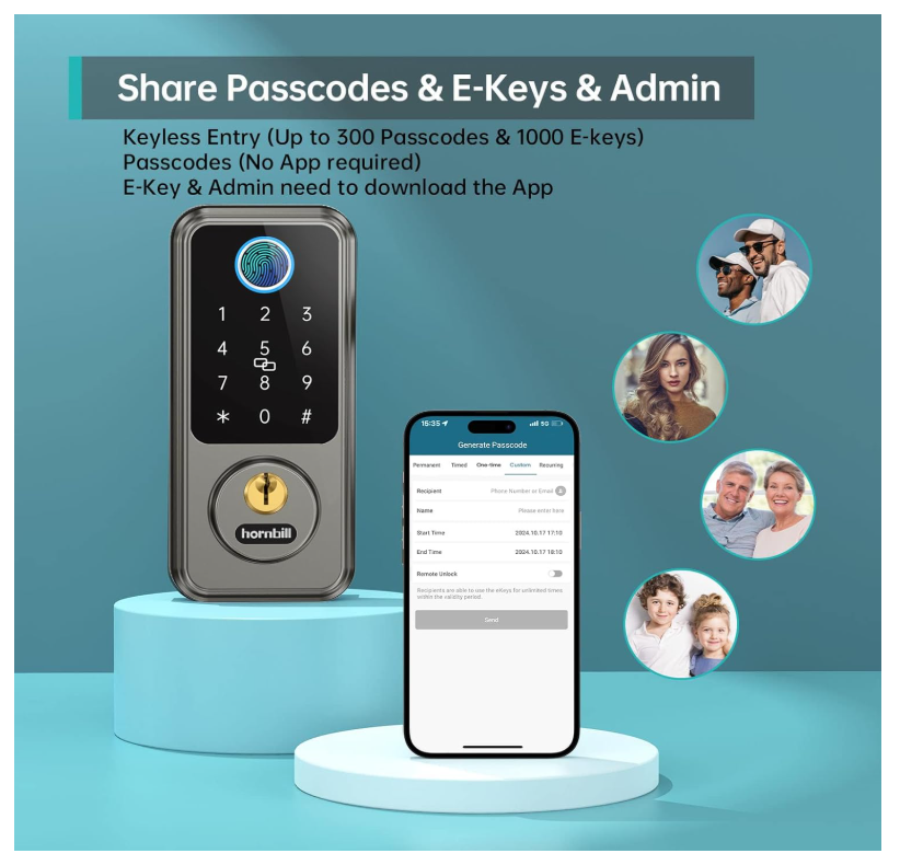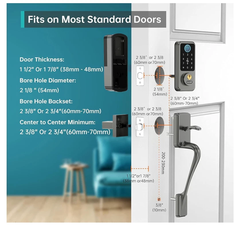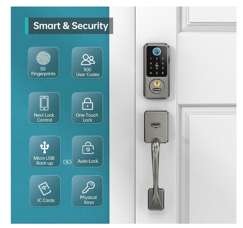 10 in 1 Keyless Entry Door Lock with Handlesets: Integrates with Next Lock App. Features fingerprint recognition, passcodes, IC fobs, keys, auto-lock, 1-touch locking, WiFi, Bluetooth, and voice control. Manage your lock easily from anywhere with the app. Unlock via Alexa/Google Assistant: Add Hornbill Wi-Fi Gateway (sold Separately.) Hornbill Smart Lock integrates smoothly with front/back doors for 2.4GHz WiFi. Control with Alexa or Google Home voice commands. Easily upgrade your home security with this smart lock. Remote Unlock/Lock: Add Hornbill Wi-Fi Gateway (sold Separately.) The smart deadbolt can be unlocked by a remote lock, and you can remotely share or change passwords for visitors—perfect for vacations or when away. Keep the gateway within 16ft (10ft if walls block) of the lock and router for seamless 2.4GHz WiFi. Stay connected and in control from anywhere. Easy Installation: Install effortlessly in just 15 minutes with a screwdriver. Fits most standard doors with thicknesses ranging from 1.49 to 1.88 inches, and adjustable latch depth for 60mm and 70mm. Grant Flexible Temporary Access: Offer temporary access codes for dog walkers, guests, housekeepers, or staff. Assign up to 250 passcodes and revoke them anytime. No more worrying about extra keys floating around, you're in control. Auto-Lock & 1-Touch Locking: Never worry about forgetting to lock your door again. Set the auto-lock to engage 1-900 seconds after closing or tap the "#" sign on the keypad for immediate locking. Perfect for busy lifestyles or added peace of mind. Reliable After-Sales Support: Trust in the Hornbill after-sales support team. Enjoy 24/7 customer service, 30-day returns, one-year replacement, and lifetime technical support. We've got you covered, anytime you need us.