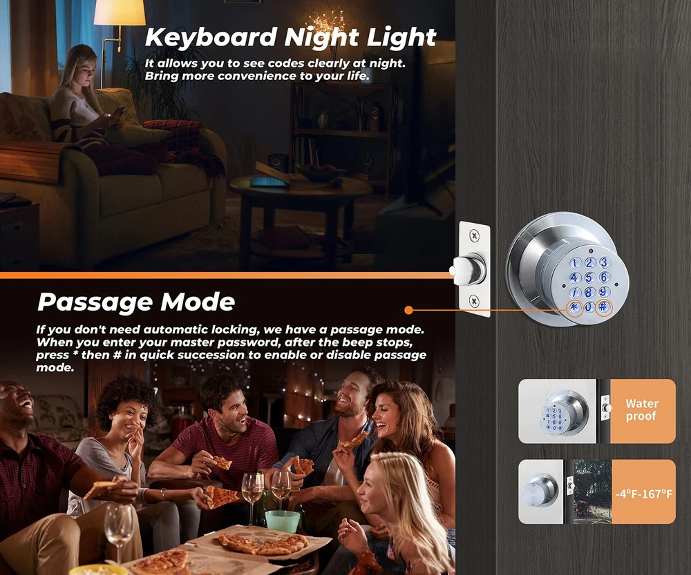 Keyless Electronic Entry Door Knob, Keypad Smart Door Knob, Interior Door Handle with Lock, Automatic Locking, Battery Backup, Backlight, Easy Installation, Great for Home, Hotel and Office 【Easy to Install and Use】 This digital door knob is very easy to install. All you need is a screwdriver and you can install this lock in 10 minutes. This keypad door lock is suitable in most standard doors in the United States.11 【Safe & Useful】 The keypad door knob enter lock is up to 8 changeable codes. Anti spy code encryption. With automatic locking retractor, the door will automatically lock behind you after opening for 3 seconds. IP65 weatherproof,works great in any weather. 【Multi-Function】 The Smart door knobs can be used all year round and has a low power alert mode. An emergency power charger is included in the package, and the lock has a backup battery port that can be recharged at any time in case the battery runs out. 【Smart Keyboard】 The lock key is backlit to prevent password peeking. And the lock button lights up so you can see the numbers clearly when you use lock at night. 【Wide Applicability】 There is a wide range of application of this digital door knob and it can be widely used in all kinds of doors of different materials. This smart lock is suitable for different scenarios, bedroom, study, garage, basement, office, hotel, Apartment, etc.