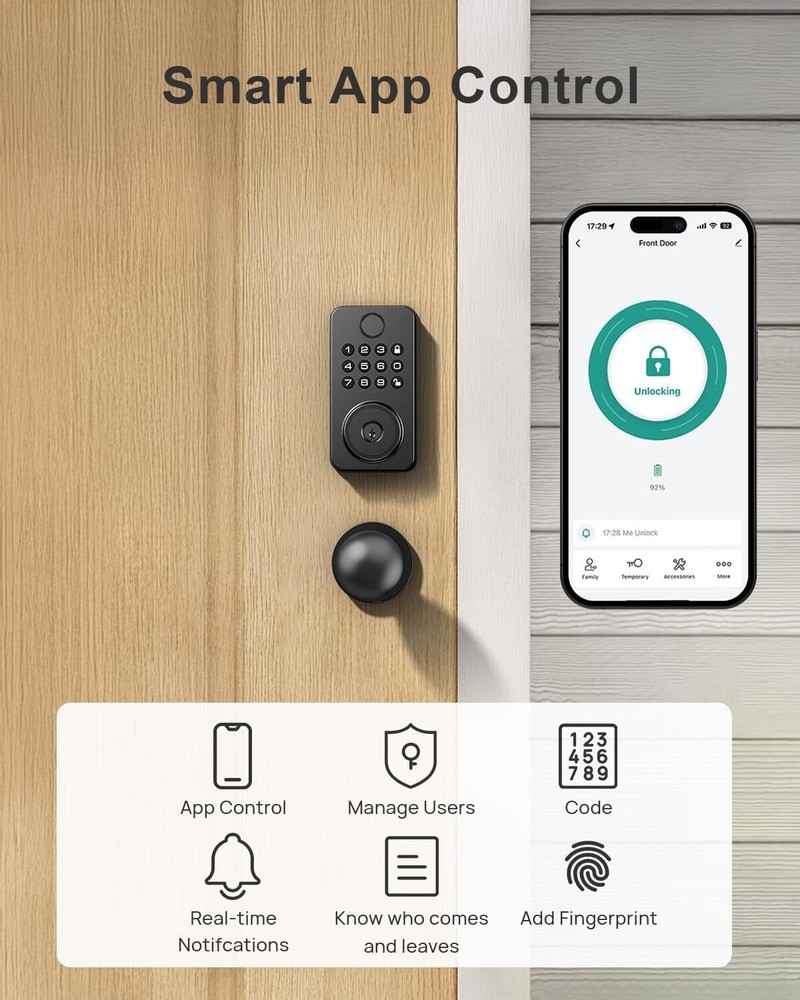 ๐ฌ๐ผ๐๐ฟ ๐๐ถ๐ป๐ด๐ฒ๐ฟ ๐๐ ๐ง๐ต๐ฒ ๐๐ฒ๐: NBBX fingerprint door locks use self-learning AI for faster, more accurate recognition with every touchโunlock in just 0.3 seconds with a 99% success rate. No more repeated attempts or frustration! ๐ ๐๐น๐๐ถ๐ฝ๐น๐ฒ ๐ช๐ฎ๐๐ ๐ง๐ผ ๐จ๐ป๐น๐ผ๐ฐ๐ธ: Choose from fingerprint, code, app control, or key access. Store up to 50 fingerprints and 50 codes, ensuring easy entry for the whole family ๐๐๐ถ๐น๐ ๐๐ผ๐ฟ ๐ฆ๐ฒ๐ฐ๐๐ฟ๐ถ๐๐ & ๐๐๐ฟ๐ฎ๐ฏ๐ถ๐น๐ถ๐๐: Crafted with solid components, tested for 250,000 cycles, and rated IP65 waterproof, this smart lock withstands any weather, operating flawlessly from -4ยฐF to 122ยฐF ๐ฆ๐บ๐ฎ๐ฟ๐ ๐๐ฐ๐ฐ๐ฒ๐๐ ๐๐ผ๐ป๐๐ฟ๐ผ๐น: Grant unique codes to family, guests, or neighbors, and revoke access anytime via the appโperfect for short-term rentals, and temporary or scheduled visitors. You can also assign one-time codes to delivery or maintenance staff for hassle-free, secure access ๐๐ฝ๐ฝ-๐๐ผ๐ป๐๐ฟ๐ผ๐น๐น๐ฒ๐ฑ ๐๐ผ๐ป๐๐ฒ๐ป๐ถ๐ฒ๐ป๐ฐ๐ฒ: Get real-time notifications of door activity, review access history, and set auto-lock from 1 sec. To 30 min. for peace of mind on the free app ๐๐ฎ๐๐ ๐๐ป๐๐๐ฎ๐น๐น & ๐ง๐ฟ๐๐๐๐ฒ๐ฑ ๐ฆ๐๐ฝ๐ฝ๐ผ๐ฟ๐: Install the N201 electronic keypad deadbolt in 15 minutes with a screwdriverโno locksmith needed. Enjoy lifetime customer support, a 30-day worry-free, and one-year product coverage ๐๐๐๐โSecure, Smart, and Effortless