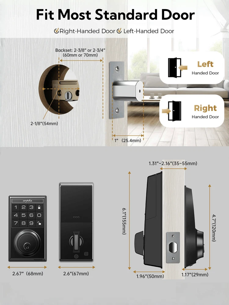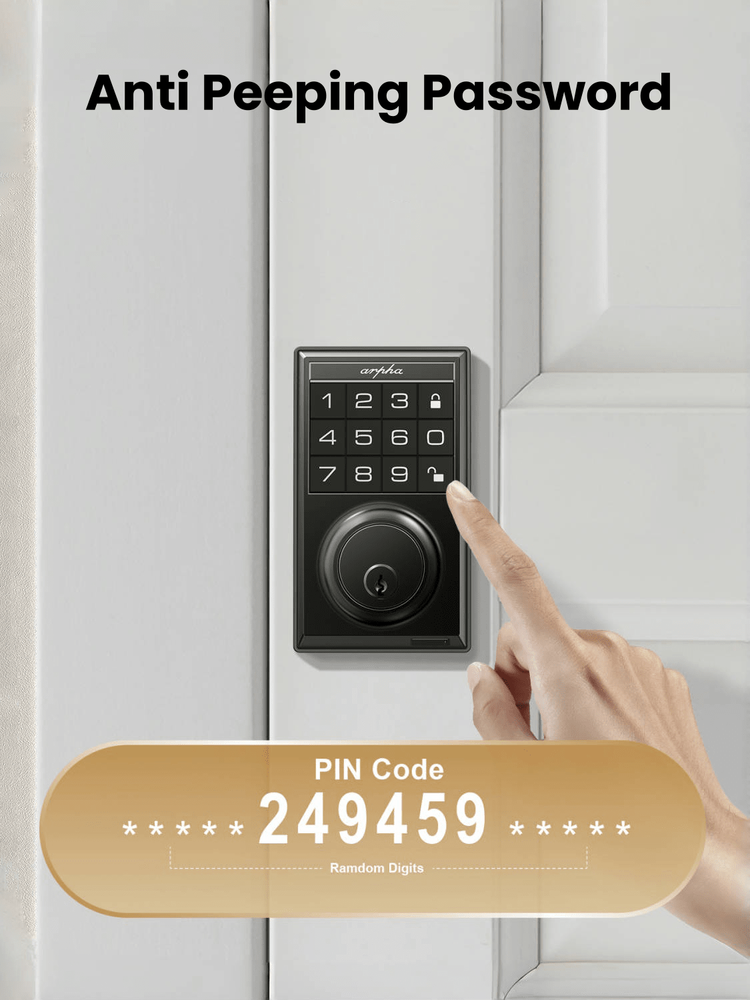 Up to 100 User Passwords: With our keypad deadbolt, you can effortlessly create and manage up to 100 user passwords, comprising 3 administrators and 97 users. This expansive feature allows you to securely manage access for family, friends, employees, and more. Whether for residential or commercial use, our digital door lock provides the flexibility and convenience you need to control who enters your space! Anti-Peeping Password: Boost your door locks for the front door with added protection! Our enhanced password setup allows users to add extra digits before and after entering the 6-10 digit real password to unlock the door, with a maximum of 16 digits. Smart locks for front doors are suitable for various settings including hotels, apartments, homes, offices, and shops. Auto Lock & One Touch Lock/Unlock: Experience the ultimate convenience with our electronic door lock customizable auto-lock feature - set to lock after 10 seconds by default, with an optional 20 or 30 seconds delay. Plus, enjoy seamless control with one-touch locking/unlocking, and whether you're coming home or leaving, our smart deadbolt lock combines convenience and security that's always at your fingertips. Suitable for Indoor/Outdoor: The electronic door lock is made of zinc alloy; IP54 waterproof (lightly sprinkled, can not be placed in heavy rain), fully operating temperature between -13℉and 140℉ (Please note, do not exceed this temperature use). In addition, the bedroom door lock can be adjusted to unlock in silent mode. Effortless Installation: Arpha keyless deadbolt can be easily installed in minutes with a screwdriver. Universally compatible, this door keypad locks seamlessly fits both left and right door orientations. The deadbolt lock accommodates door thicknesses ranging from 1-3/8" to 2-1/8" (35mm - 55mm), with lock edge distances of 2-3/8 inches (60mm) and 2-3/4 inches (70mm). Color: Black Power Supply: Battery Powered(Others Battery) Batteries Included: No