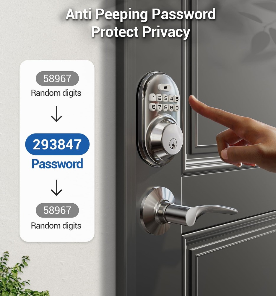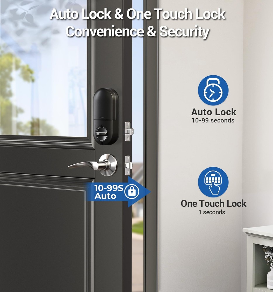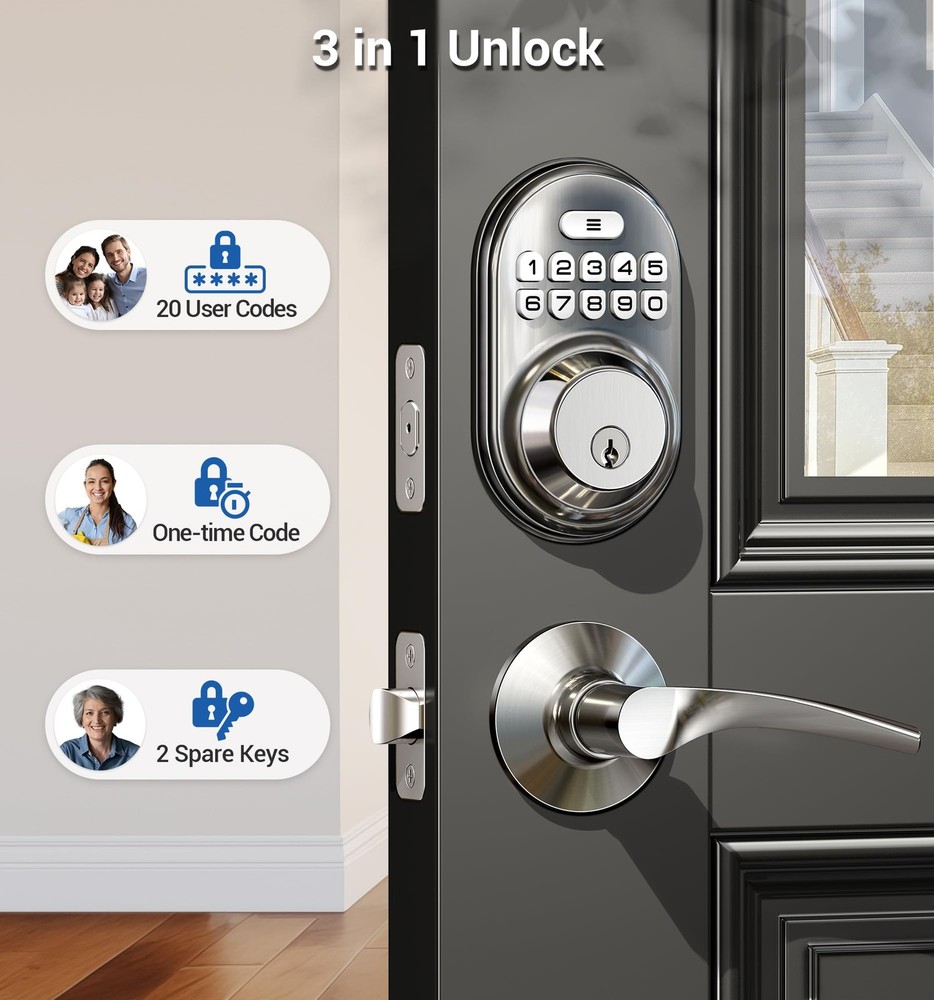 Keyless Entry: Stores twenty permanent PIN codes, retains backup keys, and generates a -time code for guests that automatically deletes after use Quick Locking: Set the door lock to automatically lock within 10-99 seconds. Press any key for seconds to instantly lock from outside Keypad Door Lock with Handle: Features a deadbolt with matching lever handles, backlit keypad, low battery alerts, silent mode, and vacation mode. Waterproof design complements traditional and modern homes Long-Lasting Home Protection: ANSI 3 certified construction with sturdy alloy materials. Powered by four AA batteries (more than year operation in all weather conditions) Easy Installation: Install and program within minutes using a screwdriver. with standard US left and right-opening doors offers at least a 1-year product , online support from Monday to Friday, 9 AM to 5 PM PST, and 24/7 after-sales service