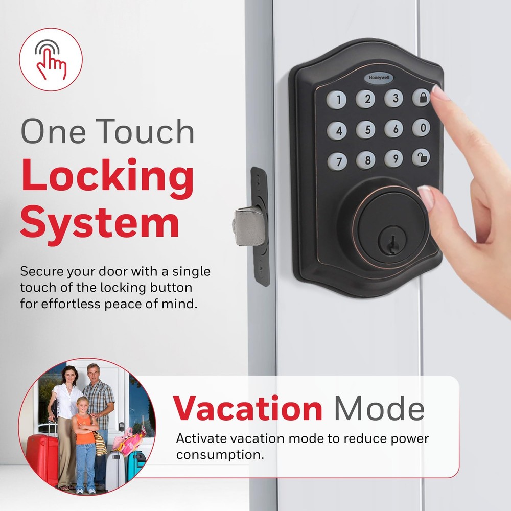 DIGITAL DOOR LOCKS - install in minutes with pre-drilled holes in the door, all you need is a Philips screwdriver!.Note: Measure your door's backset, cross bore and thickness to ensure you find the right fit. FEATURES - oil rubbed bronze brass electronic deadbolt suits a range of doors and home decor styles. Requires 4 "aa" alkaline batteries VACATION MODE - system into a low power state, disabling all buttons and functions until reactivated SECURE - a convenient -touch locking system, 50 programmable user codes, and an alarm that sounds after four incorrectly entered codes. TRUSTED COMPANY - Honeywell digital door locks provide for your home with a convenient keyless entry function.