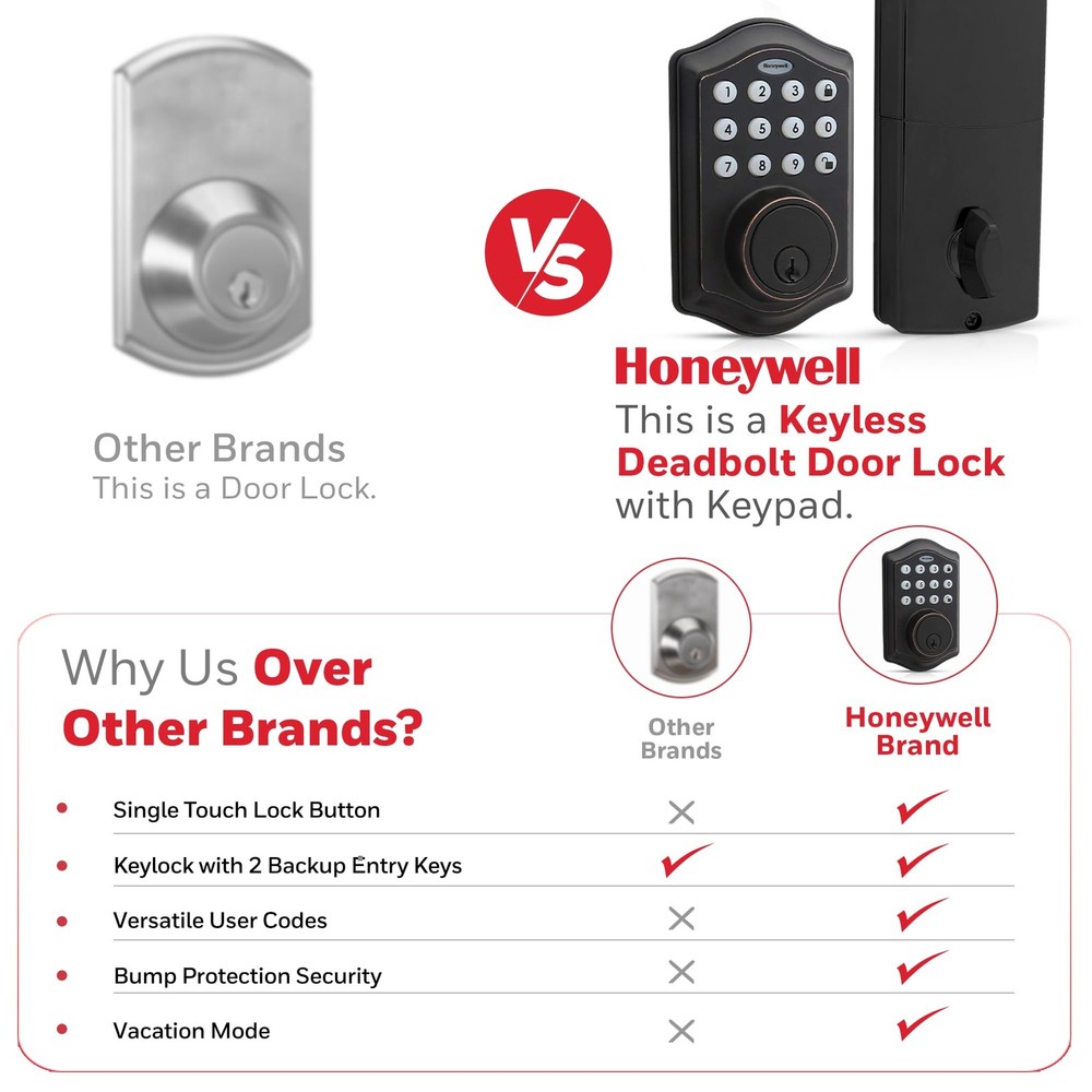 Honeywell electronic digital deadbolts feature traditional key access as well as the ability to unlock with a Programmable 4 to 8 digit user code (keyless entry). These Honeywell locks allow the owner to program up to 50 different user codes and delete them as desired. The Honeywell oil rubbed bronze electronic digital deadbolt allows you to set an automatic lock function that will return the deadbolt to the locked position at a programmed amount of time after the lock is opened. There is also a vacation mode that puts the system into a low power consumption state and disables all buttons and functions until the programmer chooses to reactivate the lock. The lock features bump protection, an installation hardware kit and 2 keys, a single cylinder deadbolt, and is easy to install with PHILLIPS head screwdriver. The battery requires 4 'aa’ alkaline batteries (not included). LH Licensed Products, Inc. leverages premium consumer brand power to deliver innovative solutions for unmet and emerging consumer needs around the world. Our products are currently available in over 70 countries across the globe. LH Licensed Products, Inc. is the exclusive licensee and manufacturer of Honeywell Safes, Paper Shredders and Door Locks. Our partner company, Lewis Hyman Inc. began in 1930 as a family window treatment business in New York City. Widely recognized for lifestyle product innovation, Lewis Hyman Inc. has established a tradition of quality and service, spanning three generations and over eighty years of expertise. DIGITAL DOOR LOCKS - install in minutes with pre-drilled holes in the door, all you need is a Philips screwdriver!.Note: Measure your door's backset, cross bore and thickness to ensure you find the right fit. FEATURES - oil rubbed bronze brass electronic deadbolt suits a range of doors and home decor styles. Requires 4 "aa" alkaline batteries VACATION MODE - system into a low power state, disabling all buttons and functions until reactivated SECURE - a convenient -touch locking system, 50 programmable user codes, and an alarm that sounds after four incorrectly entered codes. TRUSTED COMPANY - Honeywell digital door locks provide for your home with a convenient keyless entry function.