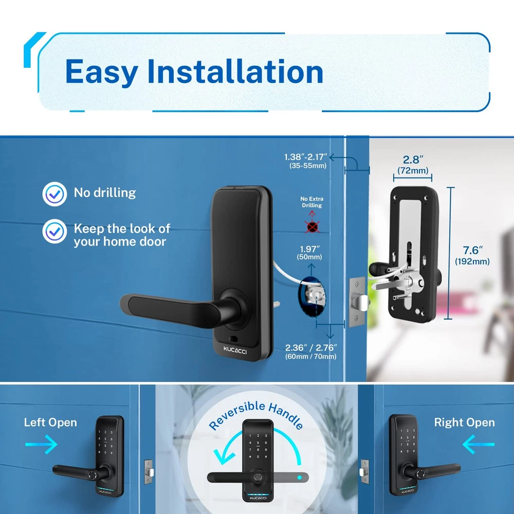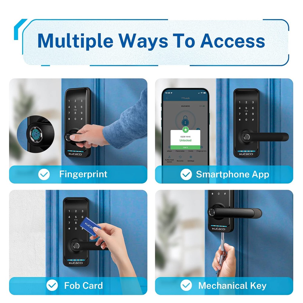 đ„ăKeyless Entry Door LockăMultiple unlock ways: Fingerprint + Keypad Passcode + Key Fob Card + Physical Keys + Smartphone App. Connected wifi gateway(sold separately), you also can remotely unlock the digital door lock and enable the Alexa to voice unlock. đ„ăEasy InstallationăNo extra drilling required or a costly locksmith. With a screwdriver, you will be able to install and program this smart door lock all by yourself. đ„ăIP66 Security Smart Lockădoor locks with keypad is a secure housekeeper. It comes with sturdy lock cylinder, high-quality persistent durable zinc alumium structure, anti peeping keypad code protection and IP66 weatherproof rating to resist extreme weather. It can be used indoors or outdoors, left or right opening door. đ„ăIdeal for Rental Hosts & HomeownersăWith TTlock app or TTlock web manager, you can manage all smart door locks in one place: authorize admin, generate code, share ekey, view records. Simple, Fast and Efficient, absolutely best choice for Airbnb short-term rental hosts and self-housing resident. đ„ăSatisfaction Guaranteeăsmart lock comes with 1 year product warranty, 30-day money-back guarantee and lifetime customer support from the date of purchase. Customer recognition is our top priority!