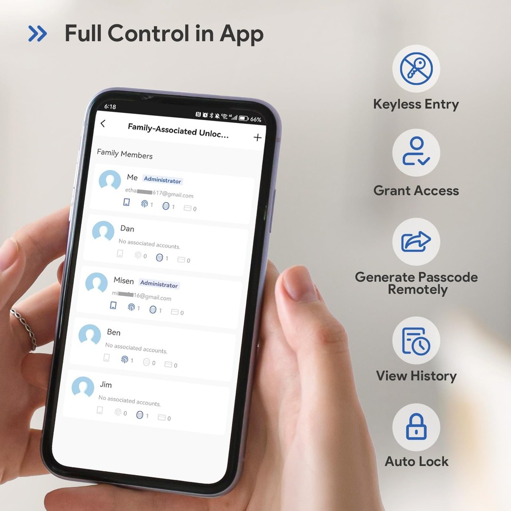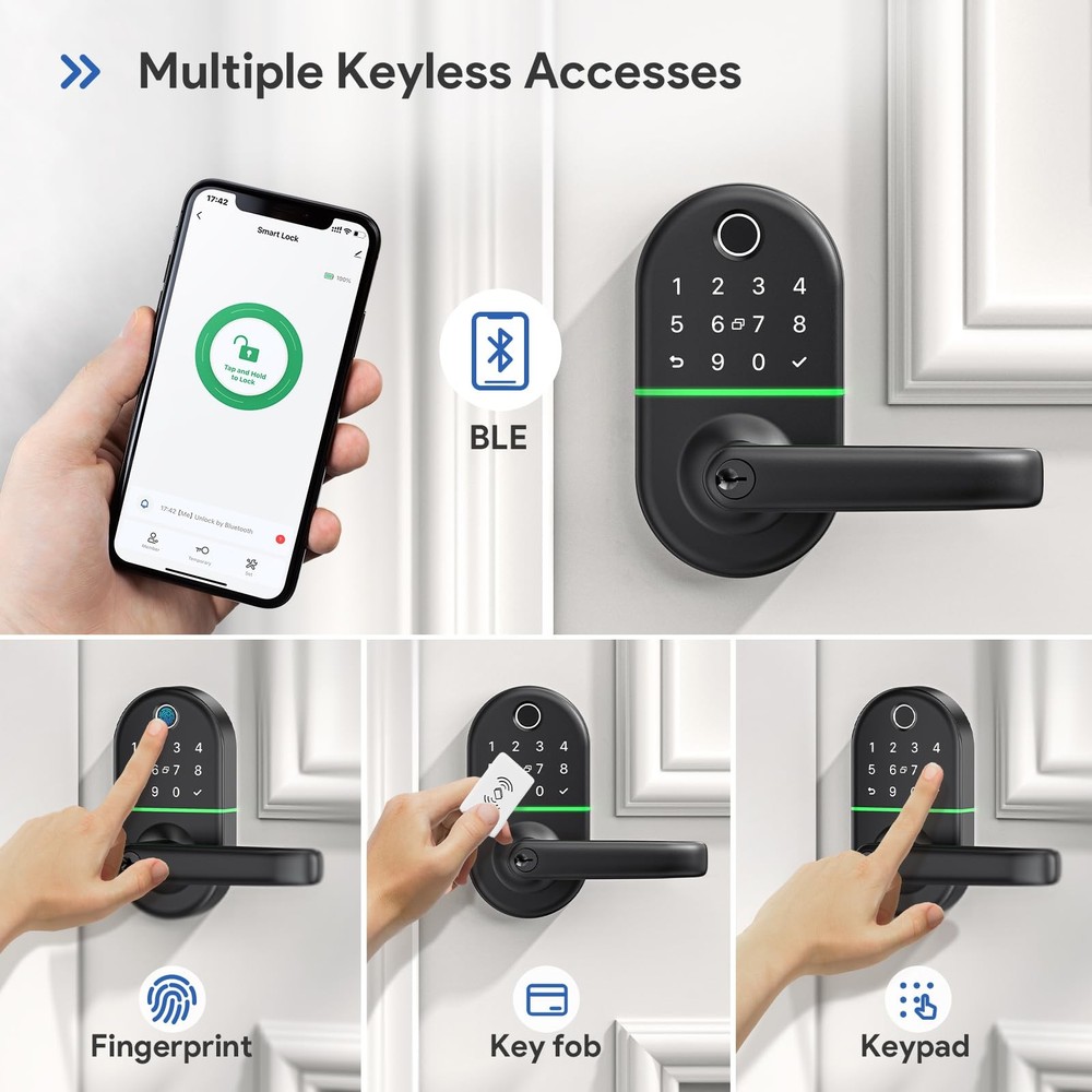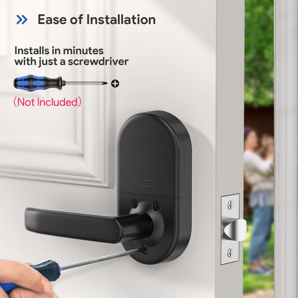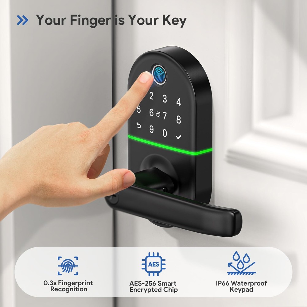 Smart Door Lock with Handle for Front Door Features: 1. Multiple inteligente access from outdoor: Use our app via Bluetooth, thumbprint, touchpad smartcode, IC card, or keys. 2. Easy DIY installation: Quickly replace the latch or deadbolt of your existing door locksets. 3. Biometric fingerprint sensor: Use your thumb to access your home by placing your finger on the sensor and print. 4. Electronic touch keypad: Comes with upgraded anti-peeping password function and supports input of 6-9 digital numbers. 5. Fits most American front doors, exterior doors, interior doors, and more. 6. Smartkey technology: Copy your keys in the US if you need more. 7. Automatic locking function: The door will auto lock after you close it. 8. Wi-Fi enabled: Connect to a Wi-Fi network with a Wi-Fi hub (not included) to remotely control your door lock from anywhere. Ease of Installation: Fits 99% of American front wooden doors. Our smart handle lock can be installed in minutes using just a screwdriver. No extra drilling required. It is suitable for both left and right-handed doors.. Our compact and secure keypad lock is designed to give you and your family an outstanding user experience. 7 in 1 Keyless Door Lock with Handle: Upgrade your front door with 7 different unlocking ways - fingerprint recognition, Bluetooth app control, keypad password, key fob, physical key, remote unlocking, and Alexa voice commands (Gateway required). Offer personalized access for your children, elderly, and other family members, eliminating the worries of lost or stolen keys. Remotely Control Anywhere(Gateway required): No worry about the bluetooth distance. No need to worry about multiple users logging in the conflict at the same time, causing failed unlocking. With the gateway paired into app, share permanent, temporary, or scheduled access with friends and family. Check real-time access logs from anywhere. Voice Control(Gateway required): You can connect to Alexa and Google Home voice assistants to control your lock with just a command. Simply say the word, and the lock will unlock. Elevate your smart living with the smart lock. Satisfaction Service: door lock provides durability and style. With a 30-day money-back, 1-year product coverage, and lifetime after-sales support, you can trust your investment is protected. Get the ultimate safe solution for your home today!
