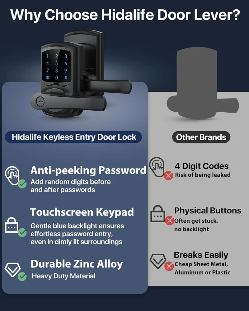Outdoor Enthusiast:Whether you're hitting the trails or going for a jog,our keypad lEasy Installation:We value your convenience,which is why our code door lock for froPet Lover:Give your neighbor or pet sitter their own temporary code while yAnti-Peep Password Security:Your security is of utmost importance to us. That's why our doorBusy Family:Never again worry about your child losing or forgetting their keyBrand:HIDALIFEMechanical Key Access:Our keyless entry door lock with handle's improved design exposesRental or Vacation Home Owners:Say goodbye to the headaches and costs associated with replacingInterchangeable Door Handle:Elevate the appearance of your entryway,garage,utility room,backTouchscreen Password Keypad:Enjoy optimal performance with our keyless door locks for front d