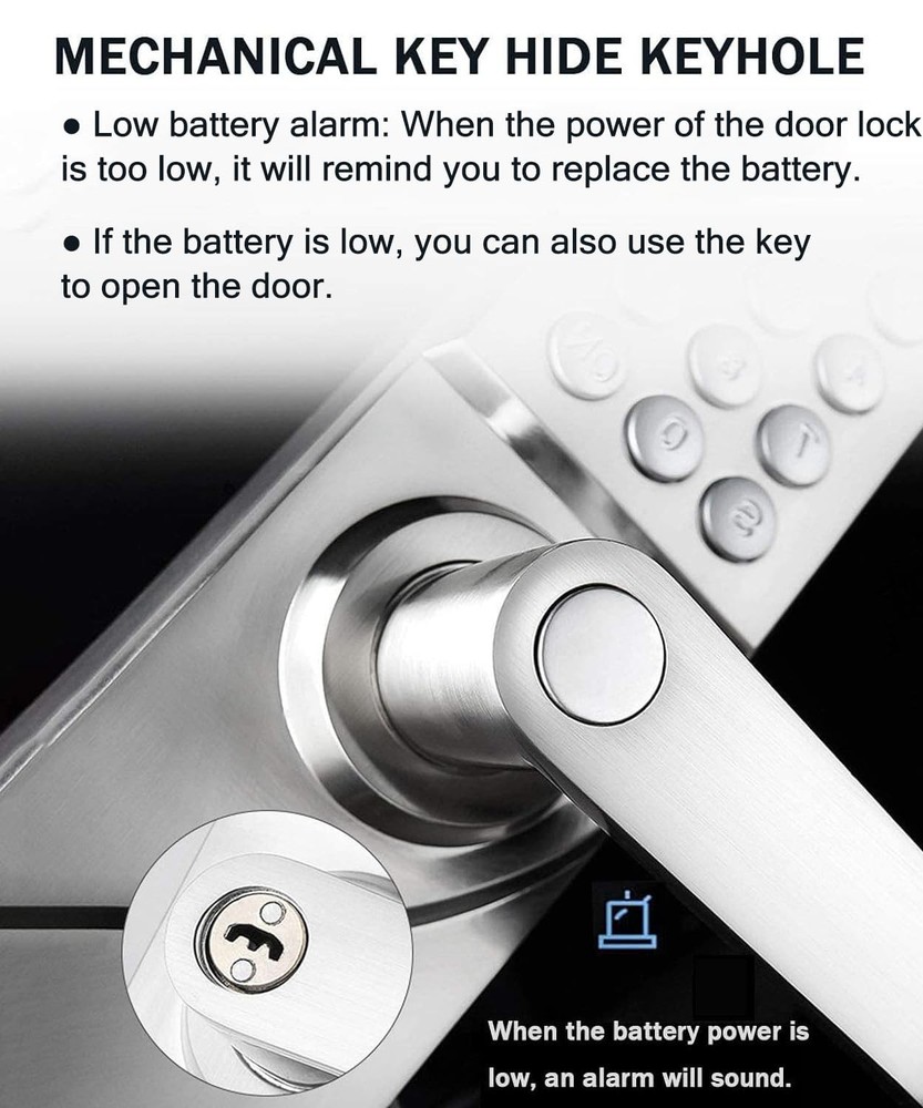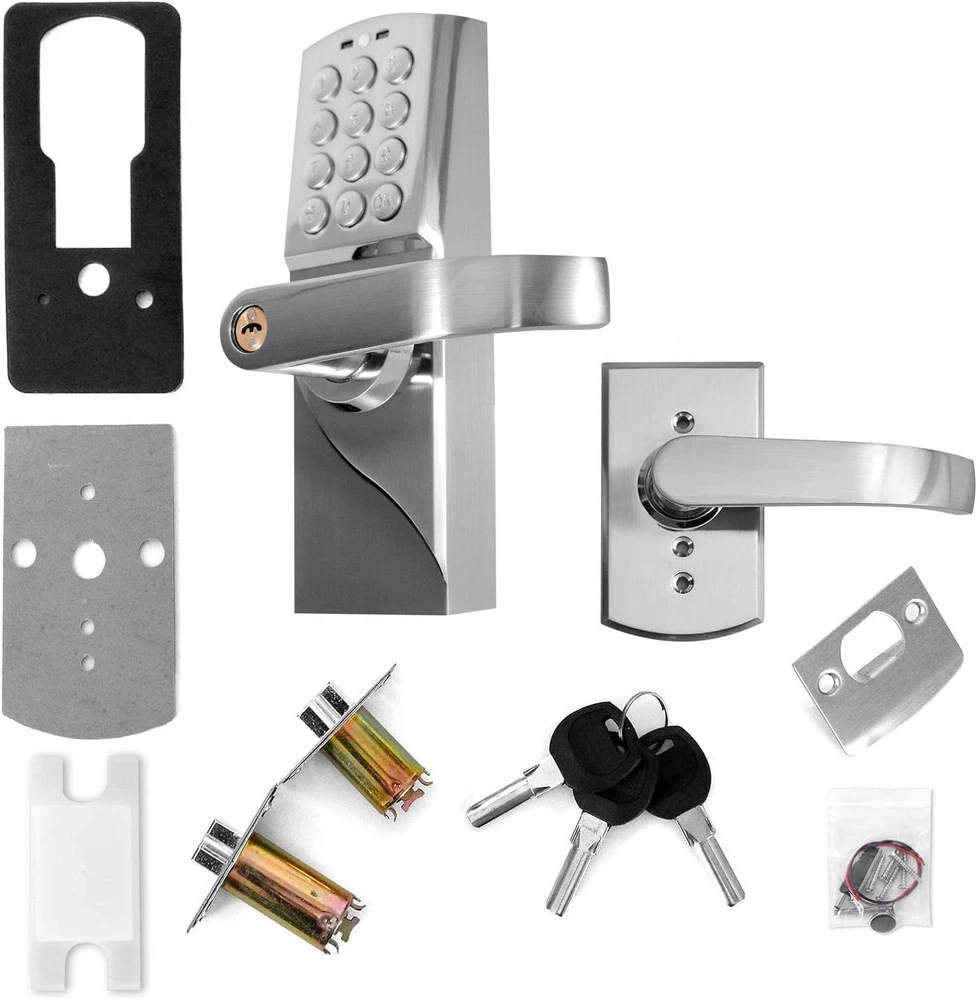 commercial keyless door lock keypad door lock with handle keyless entry door lock with handle commercial keypad door lock entry weatherproof exterior outdoor keypad door lock with handle door handle with keypad commercial keyless door lock keyless entry door lock with handle keypad door lock with handle keyless entry door handle commercial door locks with keypads commercial door locks commercial restroom door locks keypad digital bedroom door locks mechanical door digital lock auto-lock keypad door lock with handle combination door lock outdoor mechanical keyless entry door lock with handle keyless entry door lock electronic door lock with handle digital locks for doors commercial electronic door lock commercial keyless+entry+door+lock with keypad handle ✋【NO RESIDUE OF FINGERPRINT】This door handle with keypad has zinc alloy button, resistant to ten thousand times of wear, can eliminates your fingerprint traces, and does not need to worry about someone extracting fingerprint to enter. This lock has an automatic locking function when the door is closed, without the need to lock it again, which is more convenient to ensure your safety. 🔟【SET A 1-13 DIGIT DIFFERENT LENGTH PASSWORD】Our commercial keyless door lock can store 10 groups of different codes,The number of password digits can be set between 1-13 digits, which is convenient for you and your family. When the error code is input for 5 times, the alarm will sound automatically, which is safe and reliable. 🔋【CONVENIENT TO REPLACE THE BATTERY】When the low battery alarm sounds, you can replace the battery. Without removing the keypad door lock with handle from the door panel, just pry the circular button on the back of the lock, and the battery box will pop up automatically, which is safe and convenient. 🔑【HIDE KEY HOLE】The package is equipped with a magnet,remove the round patch of the handle to expose the hidden mechanical key hole.Press the round hole on the back plate of the door locks with keypads with a screwdriver, you can restore the factory settings with one key. 🎁【WHAT WILL YOU GET】 Digital bedroom door locks × 2 (both sides), lock cylinder × 2 (different thickness), spare key × 3, manual × 1, screwdriver × 1, exterior door handle handle cover × 2, Screw Kit × 1, magnet × 1. Thickness of the door:1.37-2.16 inch (35-55mm), door hole:2.16-2.36 inch (55-60mm).