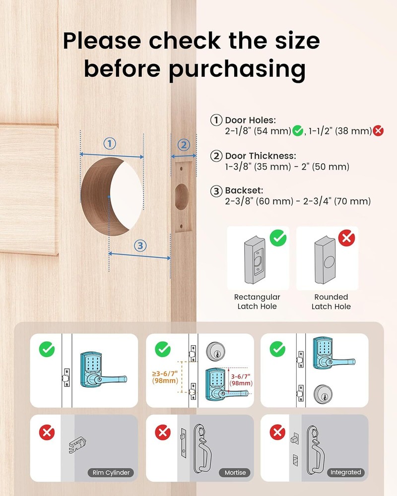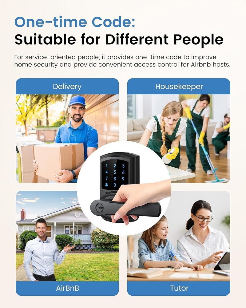 Easy Auto-Lock/Unlock Switch: Unlike other locks, our electronic door lock doesn't need any complicated programming. If you want to keep the door unlocked, just One-Touch On/Off Toggle for passage mode. It's convenient for gathering or moving things, and for quick in-and-out access in offices, hotel, bedrooms, garage, utility room, back/side door, apartment, where you need the door to stay unlocked. Security: Our keypad door lock with handle is made of heavy-duty zinc alloy and features a premium and sturdy bolt. It also has anti-peeping code protection and will lock itself after five incorrect entries for intrusion alert, all of which enhance the security of the code door lock. Keyless Entry: Supports up to 20 user codes. It is ideal for homeowners and Airbnb rental hosts, allowing you to easily assign codes to family members or tenants and change or delete codes when they move out. You can also create a one-time code for the temporary access of deliveries or housekeepers. Compatibility: Digital door lock has adjustable latch to fit 2-3/8" (60mm) or 2-3/4" (70mm) backset. Fits standard US door opening 2-1/8" (54mm) door opening (does not fit 38mm door opening). Easy to install. Clear Touchscreen Keypad: The front door lock features large-clear numbers with bright blue backlight, enabling you to effortlessly enter your user code even at night.