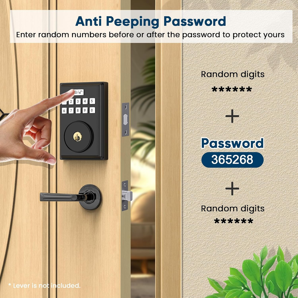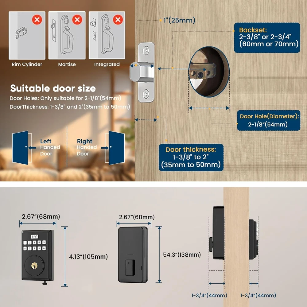Keyless Entry: The smart door lock equipped with 300 codes and 2 traditional keys, it can be used with electronic keypad or traditional keys. Auto Lock: Smart door lock adopts aluminum alloy structure, it can be set to “Auto Lock” in 5-59 seconds to ensure safety when you go out in a hurry or carry heavy things, or long press “Lock/Unlock” button for 3 seconds to lock manually. One-time password: You can set a one-time visitor password, which will be automatically deleted after use, suitable for neighbors, maintenance workers, pet sitters, etc. Simple and convenient. Easy Installation: The deadbolt lock can be done with just a screwdriver, fits 1-3/8 - 2 inch door thickness, 2-1/8 inch door opening, includes an adjustable latch; Note: Please measure your door's backset, transom holes, and thickness to ensure proper installation. Intelligent and Convenient: With backlit keyboard, anti-peeping user password protection, low power indicator, silent mode, long press the back lock “privacy button” for 3 seconds to realize the anti-lock, more private. Stylish and Sturdy: The smart keypad door lock for front is made of sturdy lock cylinder and alloy, waterproof IP54, senior matte black, suitable for all decorating styles. Product Description OOCC Smart Lock, Open Intelligent Life. 1 One-Touch Locking 2 Auto Lock 3 Anti Peeping Password 4 Silent Mode &Privacy Mode 5 One-Time Password Left and Right Doors Product Features 1 Low Battery Alert 2 Wrong Code Entry Limit 3 For Different People 4 For All Environment Check the Size Before Your Purchase For Most Standard Doors 1 Front Door 2 Hotel Door 3 Back Door 4 Apartment Door