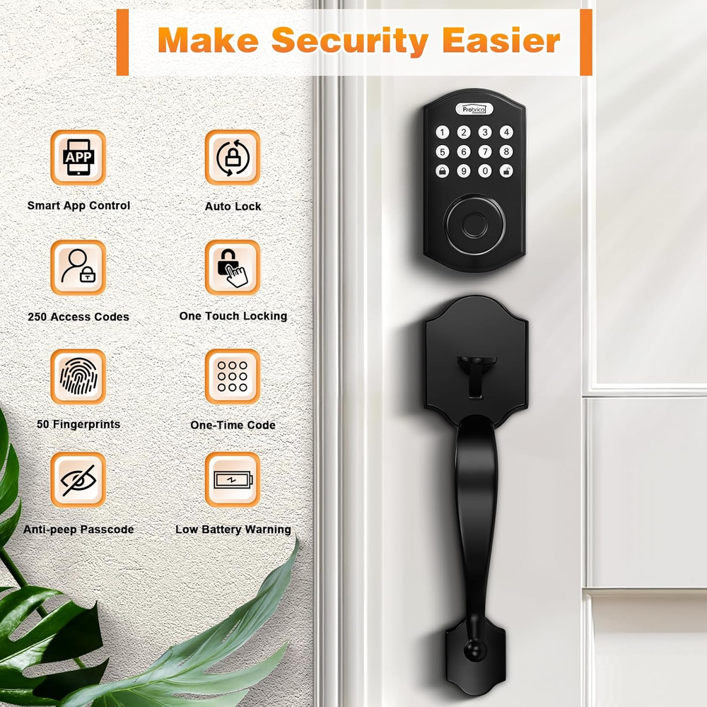 【Keyless Entry Door Lock with Knob Set】The combination of passage door knob and smart deadbolt is more convenient,it helps customers avoid the hassle of separately choosing and matching door handles; 【4 in 1 Unlock Ways Deadbolt】This smart lock set can be unlocked by Fingerprint, Password, App and Key, meeting various people's daily needs in multiple scenarios; 【Fingerprint Unlock】It uses biometric technology, with a recognition rate of up to 99.8%, it can accurately identify your fingerprint and unlock the door in just 0.3 seconds, securely accommodates up to 50 fingerprints, ensuring seamless access for multiple authorized individuals; 【Password Unlock】This keypad lock securely accommodates up to 250 access codes for family use, and supporting setting multiple one-time passwords, which will be automatically deleted after being used to unlock the electronic deadbolt; 【Auto lock】The smart door lock can be set to automatically lock within 5 to 60 seconds after the door is closed, avoiding the situation of forgetting to lock the door in case of emergencies, ensuring the safety of the home; 【Easy Installation】This smart front door lock with handle suits for door thickess between 1-3/8" to 1-3/4"" (35 mm to 45 mm), we offer detailed installation instructions and videos, you can finish the installation with just a screwdriver within 10 minutes; Please note that our smart deadbolt is suitable for 2-1/8" (54mm) door holes AND the smart lock powered by 4*AA batteries (Not Provided); Product Description 4 in 1 Unlock Ways- Meeting the needs of the family Create one-time passcode remotely to your friends, guests, delivery or service people. No need Wifi Protect your passcode from prying eyes Add random digits before or/and after the true passcode. Total length should less than 16 digits. A voice reminder while the keypad activated. The icon on APP will turn red when battery under 25%. Remote Unlock with Gateway No matter where you are, you can unlock the door remotely for people who need enter your home. 1 One-Time Passcode 2 Anti-peep Passcode 3 Low Battery Warning 4 Remote Control 5 Ready For All Weathers Remote Control with Gateway You will unlock more function with Gateway, Such as remotely unlock, check record and receive notification etc. Please Check The Size Before You Purchase Smart Keyless Entry Lock Smart Door Lock 4 in 1 Unlock Ways Auto Lock Adjustable Hole 611+9851 Product Mode 611+9860 Handle Included Handle Difference The curve is flatter 4 in 1 Unlock Ways Auto Lock Adjustable Hole 611+9851 Product Mode 612+DL01 Handle Included Handle Difference Square Shape 4 in 1 Unlock Ways Auto Lock Adjustable Hole 611+9851 Product Mode 612+DL1603 Handle Included Handle Difference Round Shape 4 in 1 Unlock Ways Auto Lock Adjustable Hole 611+9851 Product Mode 611+609 Handle Included Handle Difference No Handle Smart Keyless Entry Lock Smart Keyless Entry Lock Smart Keyless Entry Lock Smart Keyless Entry Lock Is there a monthly fee to use these features on APP? No there's no fee. You just need to download the app freely to set it up. Does this lock have a "auto locking" feature? Yes, it does, with options from 5 seconds to 60 seconds. What kind of batteries ? How long do they last until you have to change the batteries out? You can use 4*AA Alkaline Batteries,it can be used for one year. Do these work with Android phones? Yes, it works for both iOS(iOS 7.0 above) and Android(Android 4.3 above) system. Can we use the lock without the app? No, you can use the lock without app, but if you want to unlock more function, you need to downlad the app.