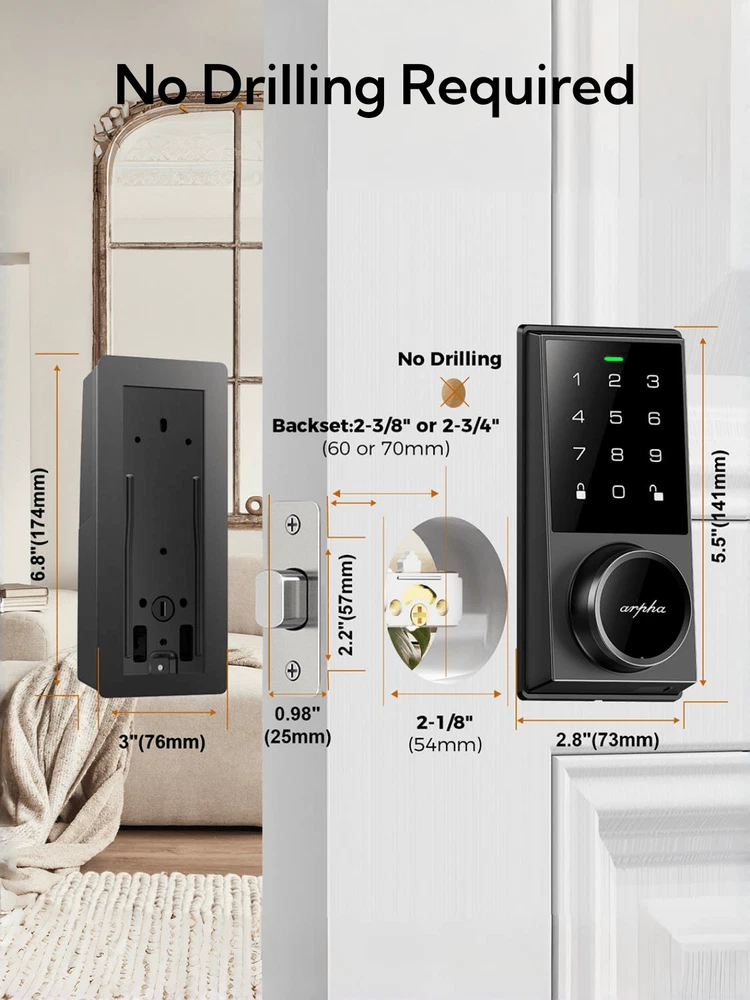 Up to 100 Entry Codes: Arpha smart door lock stores up to 100 different entry codes so everyone in the household can use it, as well as anyone you trust enough to give open access to. For temporary guest access, it can assign a unique code that works only for specific dates. 100 Passcode: Door lock with code supports 100 groups of access codes for the front door, including 97 users and 3 admin passcodes. Anti-Peeping Password: The door lock provides virtual password unlocking function. For example, the user sets the password to "123456". When user opens the front door, the keyless entry door lock allows the user to enter 5 random numbers at the beginning or ending to avoid surveillance by strangers. "XX123456XX" allows the user to enter. Long Battery Life Battery Alert: If you buy this lock, though, don't forget to snag some batteries. The keyless door lock supports 4 AA batteries (batteries not included) and can be used for about 180 days without frequent battery replacement. It does warn you when the battery is running low, so there's a fail-safe method in case you do find yourself locked out because of a dead battery. There's a USB-C port hidden on the bottom of the exterior you can use to quickly charge it up enough to unlock the door. Auto Lock: The door lock also comes with a 'Smart door locking' feature that automatically locks the door after 10 seconds to 30 minutes. Extremely convenient for those with busy lives-simply close your door and it will auto-lock behind you. Durability & IP54 Waterproof: Arpha AL301 door lock set is made of zinc alloy, which is stronger and more durable than aluminum alloy. The IP54 waterproof design makes it rainproof and can withstand temperatures from -31 °F to 158 °F.