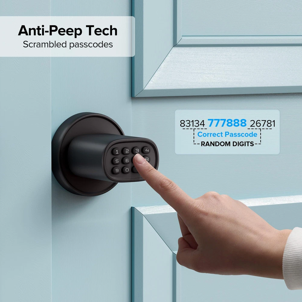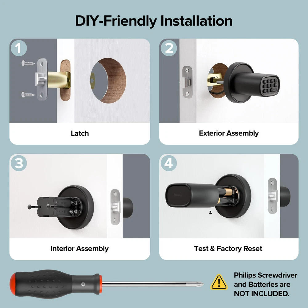 2-in-1 Convenience, Peace of Mind Security. Unlock your way with Passcodes or key. For added security, the door automatically locks after 5 seconds of inactivity. You can also lock it instantly with a press of the enter key. Built-in Anti-Peep technology lets you scramble your passcode with random numbers, keeping your entry code private DIY Friendly & Effortless Setup. Upgrade your security in minutes following the 4-step installation using a Philips screwdriver. This keyless door lock fits most US doors. Using 4 x AA Alkaline batteries (NOT included) from a well-known brand could provide up to 2 years of battery life. If the battery runs out, you can connect your power bank to the Type-C port located on the bottom to power it on, or use backup keys to unlock Easy Programming with Innovative Keypad. Manage up to 100 passcodes for access, alongside settings like Passage Mode and Silent Mode using a single admin code Ultimate Grip Comfort for Everyone. Upgrade your home's style with a sleek and unique keypad door knob that enhances the look of your door. For added comfort, the rectangular door handles feature a rounded design that's easy and comfortable to grip, even with wet hands Built to Last. Our top-quality zinc alloy construction and water-resistant design ensure long-lasting durability and unmatched security for years to come. Perfect for room rentals, house-keeping, offices, and dormitories, this keypad door lock provides added security and convenience for any interior room, from bedrooms and storage rooms to home offices, garages, and game rooms, etc
