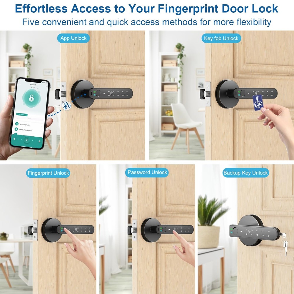 finger print door knob, fingerprint door knob for bedroom, Biometric Door Knob with App Control, door lock fingerprint with Keypad, keyless entry door lock with handle Features: **Material:** Crafted from durable aluminum alloy for long-lasting performance. **Power Supply:** Powered by 4 AAA alkaline batteries (not included). Includes a Type-C port for emergency power supply. **Storage Capacity:** Accommodates up to 100 fingerprints, 100 cards, and 100 codes, providing versatile and secure access options. 1. **Versatile 5-in-1 Access:** Enjoy multiple unlocking options with the fingerprint door lock front door, including app unlock, fingerprint recognition, fob card entry, code entry, and traditional key access. Choose the method that suits you best for enhanced convenience and security. 2. **Advanced Security Features: ** anti-peep code and auto-lock functionality, and app show battery level. The fingerprint bedroom door knob also includes a silent mode. 3. **Effortless Installation:** Upgrade your bedroom door lock easily with our biometric door knob’s straightforward installation process. Designed to fit standard door preparations with included tools and instructions. 4. ** Voice Control:** Pair the thumbprint bedroom door knob with the gateway for intuitive remote and voice control via your smartphone. Manage access, check lock status, and control settings from anywhere. 5. **Flexible Operational Modes:** Adapt the fingerprint door lock app to your needs with passage mode for uninterrupted access and silent mode for quiet entry. Fingerprint Door Lock with Key FOB