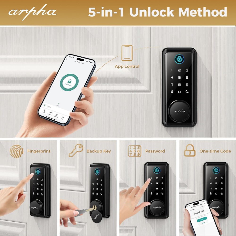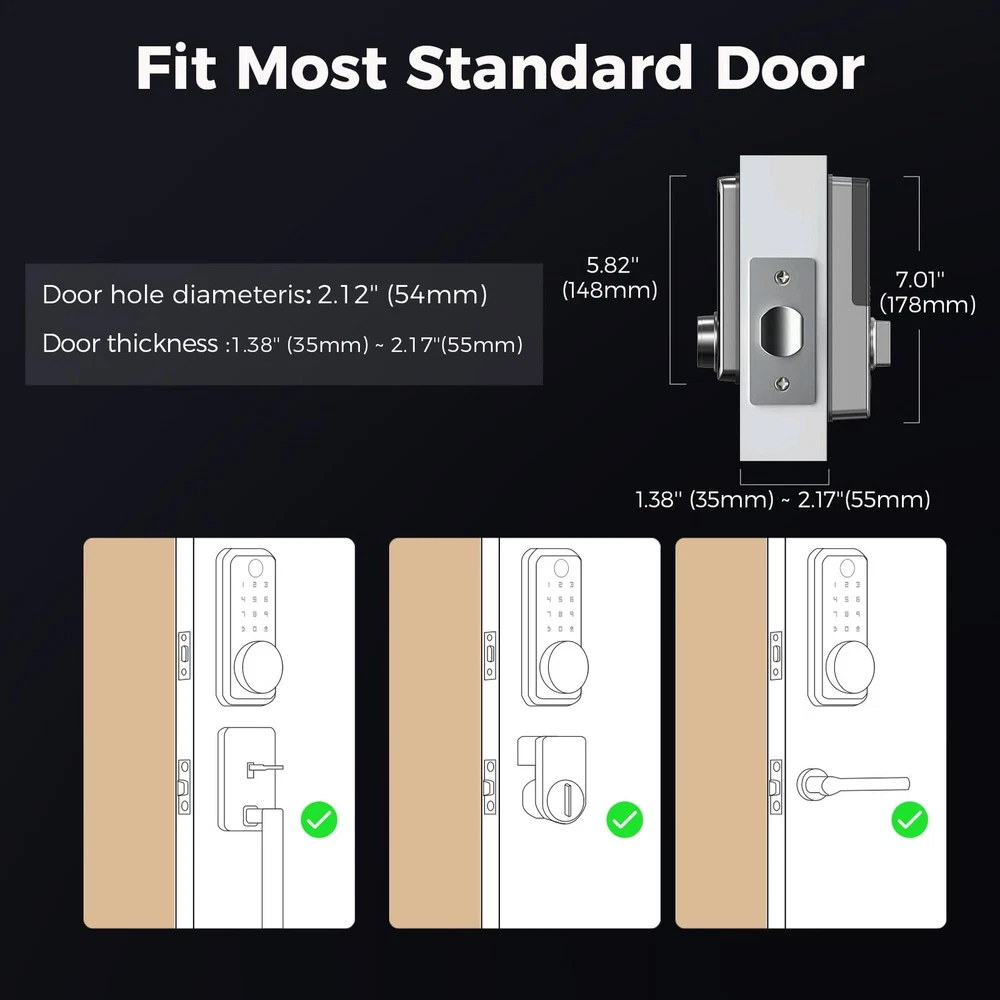 5 Ways to Unlock: smart door lock could be unlocked via APP Access, Fingerprint Touch ID, Keypad Code, Traditional Key Unlock. Never get locked out again with multiple secure ways to access your home. APP Control: The keyless entry door lock boasts an intuitive APP control, offering you the convenience of access management, user code editing, and tracking entry records from your smartphone. (: B09YHFG933) Gateway required for remote control this keyless entry door lock. Self-Learning AI: Your Finger is Your Key! Fingerprint door lock recognition gets more precise with every touch, so you don't have to try agian and again to get in. Never be awkward or upset at unlocking the door. Auto Lock: No more worries about leaving your door unlocked. The electronic deadbolt features an auto-lock function, ensuring your home remains secure even when you forget to lock it manually. Anti-Peeping Password: Our electronic keypad deadbolt is equipped with an anti-peeping password function, providing enhanced by masking your access code, deterring potential intruders. the door lock provides virtual password unlocking function. Users could enter 6~10 fixed password + 12~8 virtual password to unlock. Easy Installation: Electronic door lock could easily be installed in few minutes with a screwdriver. Keyless entry door lock is suitable for backset scale range of 2-3/8 inches (60mm) and 2-3/4 inches (70mm), with door thickness ranging from 1-3/8 inches to 2-1/8 inches (35mm-55mm). Durability: The door lock is made of alloy, which is stronger and more durable than aluminum alloy. Crafted to withstand the elements, this keypad lock is IP54 waterproof, making it a robust choice for both indoor and outdoor installations. Easy to installOur door locks fit most doors - simple DIY installation. Easy to HowTo Installation Guide. Quickly replace the handle, knob or deadbolt of your existing door lock set with just a screwdriver. No extra drilling needed.